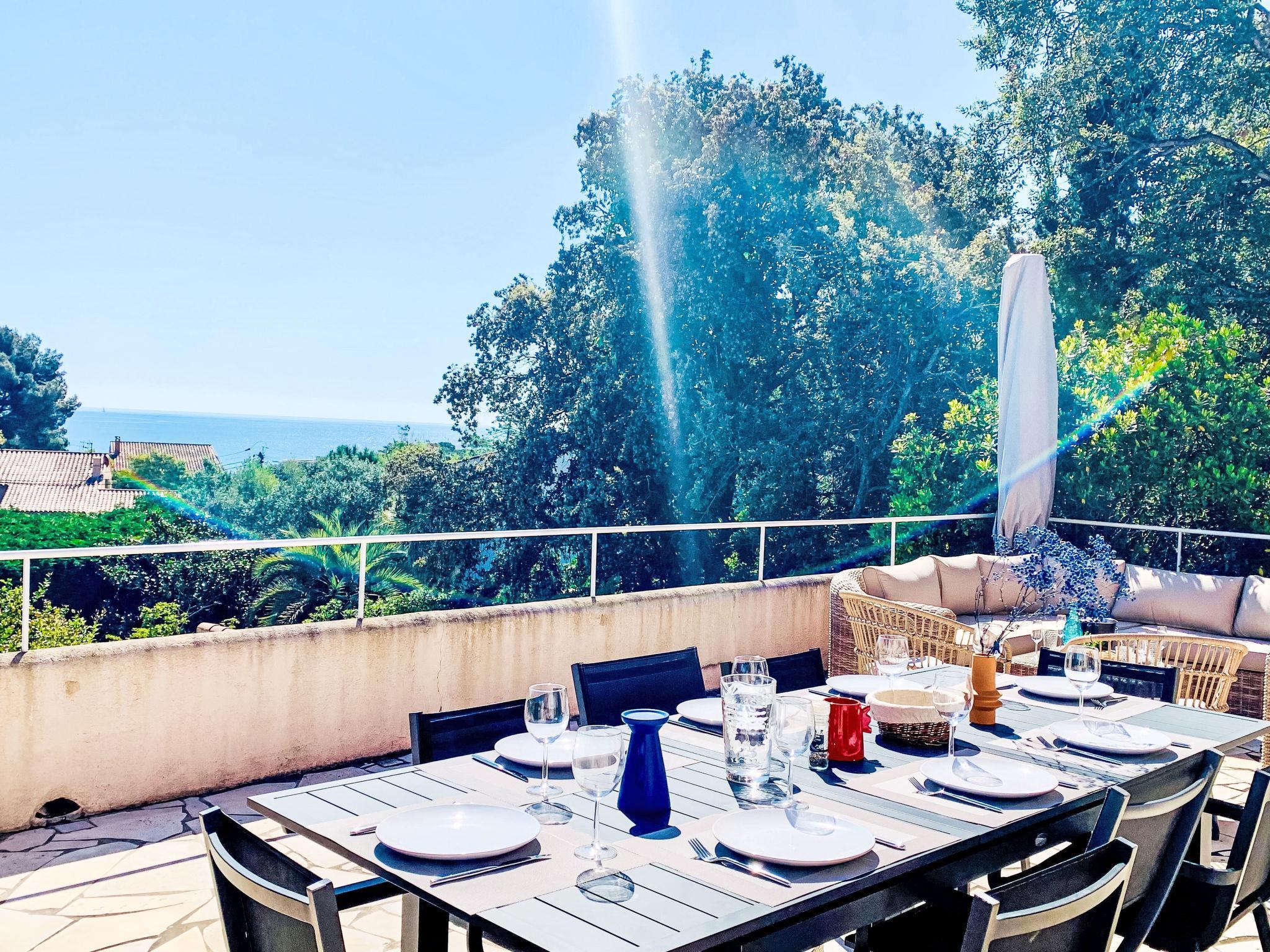 5-room villa 150 m2, on the upper floor. Renovated in 2024, comfortable furnishings: living/dining room with TV, flat screen and air conditioning. Exit to the terrace. 2 rooms with Dressing room, each room with 1 french bed (1 x 180 cm, length 200 cm), shower, TV, flat screen and air conditioning. Large kitchen (oven, dishwasher, 4 induction hot plates, toaster, kettle, microwave, freezer, electric coffee machine, Capsules for coffee machine (Nespresso) extra). Exit to the terrace. Electric heating. On the lower ground floor: 1 room, ceiling height 185 cm with 1 french bed (1 x 140 cm, length 190 cm), TV (flat screen). Shower/WC. Electric heating. Upper floor: office. 1 room with 1 french bed (1 x 160 cm, length 200 cm), TV, flat screen and air conditioning. Exit to the balcony. Shower/WC. Electric heating. Balcony 6 m2, south facing position, large terrace 60 m2, south facing position. Terrace furniture, electric barbecue, deck chairs (6). Beautiful view of the sea. Facilities: washing machine, dryer, iron, hair dryer. Internet (WiFi, free). Parking. Please note: maximum 1 pet/ dog allowed. Smoke alarm. Offer by a private individual according to Art. 155, IV of CGI. 83107001863XM