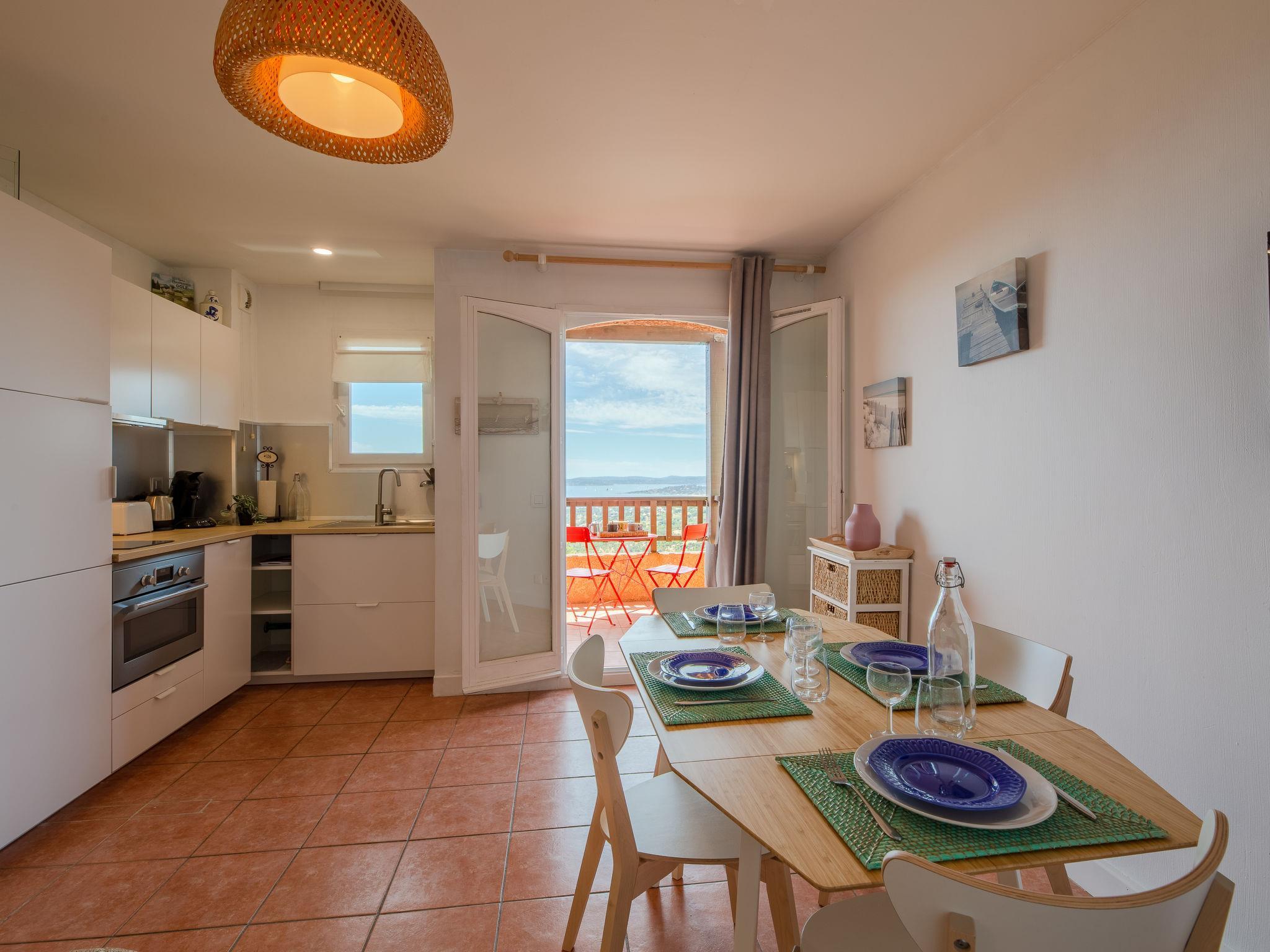 3-room apartment 45 m2, on the ground floor, south-west facing position. Bright, renovated in 2024, beautiful furnishings: living/dining room with TV (flat screen). Exit to the terrace. 1 room with 2 beds (80 cm, length 190 cm), shower. 1 room with 1 french bed (1 x 140 cm, length 190 cm). Open kitchen (dishwasher, 2 ceramic glass hob hotplates, toaster, kettle, freezer, electric coffee machine, combination microwave). Bathroom, sep. WC. Air-conditioning, forced-air heating. Small balcony 5 m2, south facing position and west facing position. Balcony furniture. Beautiful view of the sea and the valley. Facilities: washing machine, iron, hair dryer. Internet (WiFi, free). Parking. Please note: non-smokers only. Maximum 1 pet/ dog allowed. Smoke alarm, no lift. Offer by a private individual according to Art. 155, IV of CGI. 83107002315K7