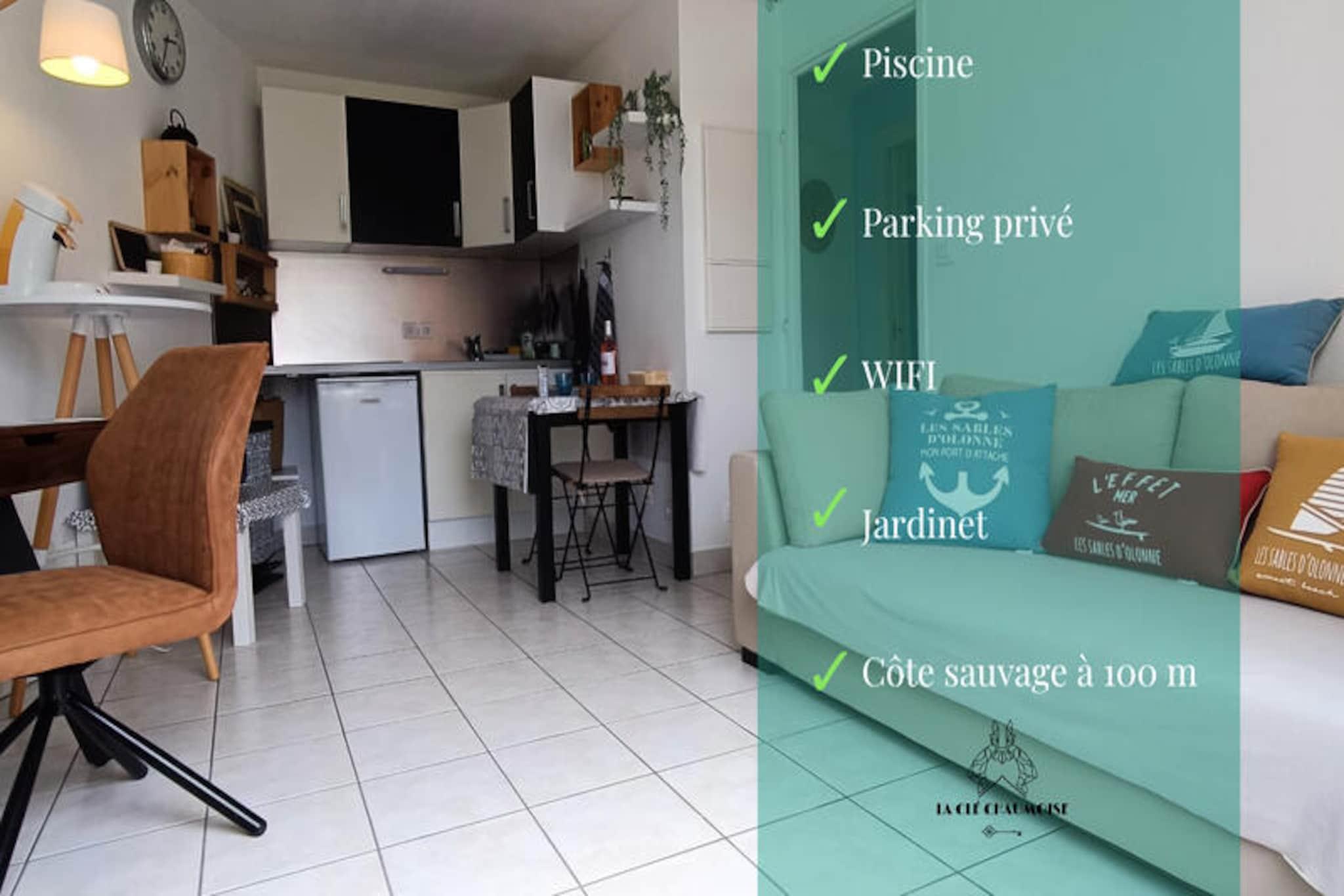 I hjertet af det historiske Chaume-distrikt i Les Sables-d'Olonne tilbyder dette dejlige sommerhus et roligt tilflugtssted kun få skridt fra det ikoniske Armandèche-fyrtårn og de maleriske kyststier. Omgivet af charmen i dette maritime kvarter, vil du mærke essensen af ??regionens rige historie, mens du nyder moderne bekvemmeligheder. Den private have inviterer dig til at slappe af i solen, mens den fælles swimmingpool lover forfriskende øjeblikke i de varmere måneder. Uanset om du er her for en romantisk ferie eller en fredelig flugt, er denne ejendom den perfekte base for at udforske Vendées kystlinjes skønhed. \n\nTræd indenfor og oplev et gennemtænkt designet rum, der blander komfort med funktionalitet. Stuen er et hyggeligt fristed, komplet med en sofa, tv, spiseplads og endda et skrivebord til dem, der har brug for at holde kontakten. Det fuldt udstyrede køkken er klar til dine kulinariske eventyr og har alt fra en kaffemaskine til krydderier. Master-suiten kan prale af en komfortabel 140x190 cm seng og et privat badeværelse med et moderne brusebad, mens et separat påklædningsværelse og toilet øger bekvemmeligheden. En vaskemaskine sikrer problemfri længere ophold. Udenfor er den private have med siddepladser ideel til spisning under åben himmel eller blot at nyde kyststemningen.\n\nBeliggende kun 900 meter fra Quai de la Chaume finder du et pulserende udvalg af butikker, restauranter og et livligt marked. Den charmerende passeur-båd, kun 1 km væk, giver en hurtig og naturskøn rute til hovedstranden og den travle bymidte. Fiske- og skaldyrselskere vil nyde de friske retter, der er tilgængelige kun 750 meter fra din dør, og et supermarked er bekvemt placeret 2 km væk for alle dine fornødenheder. Med cykelstier, kyststier og charmen ved Les Sables-d'Olonne lige ved hånden, er dette sommerhus din port til uforglemmelige minder ved havet.\n\nUanset om du udforsker de nærliggende attraktioner eller blot slapper af i haven, tilbyder denne ejendom den perfekte blanding af ro og eventyr. Book dit ophold i dag og oplev magien ved Vendée-kysten.
