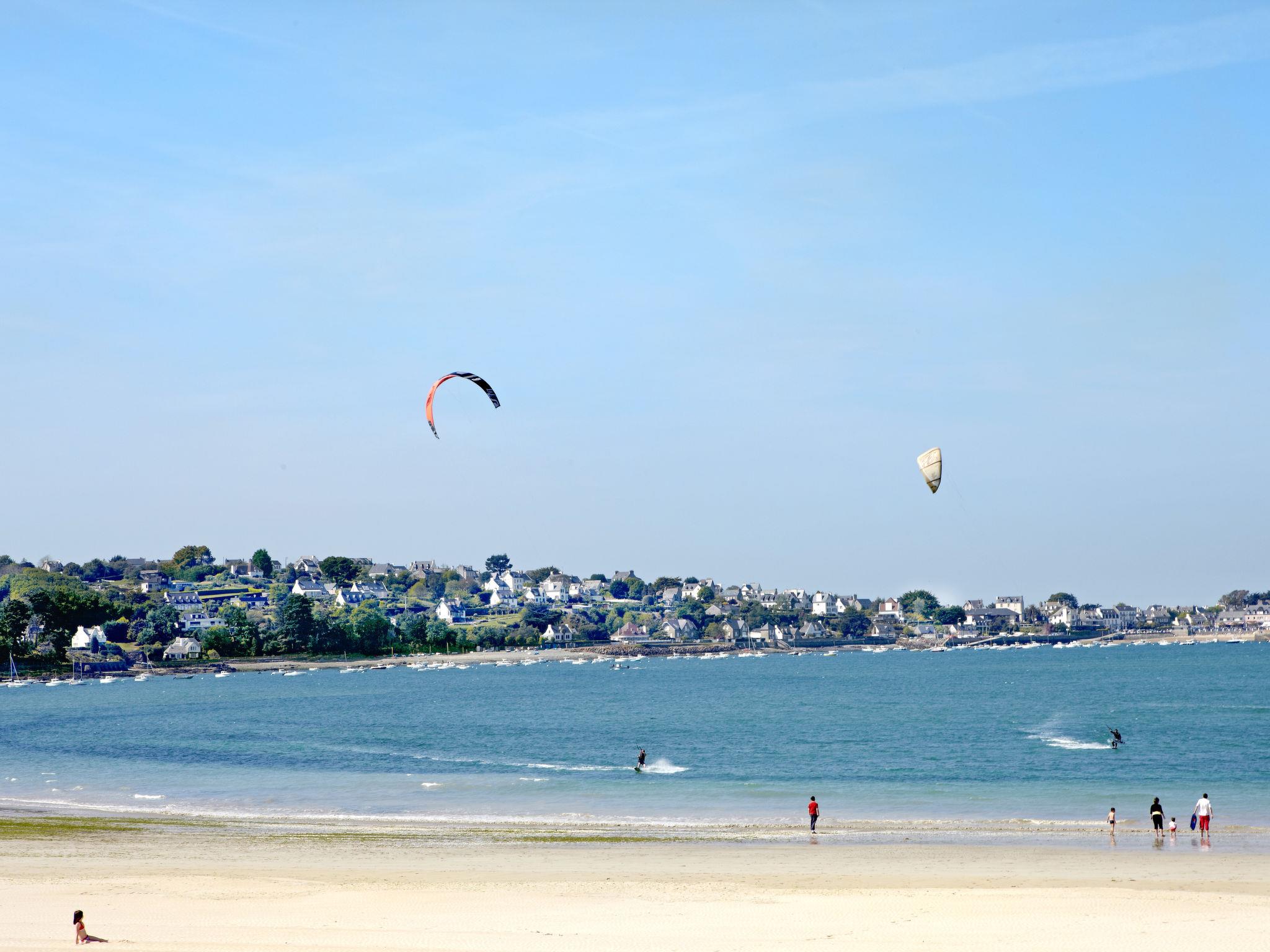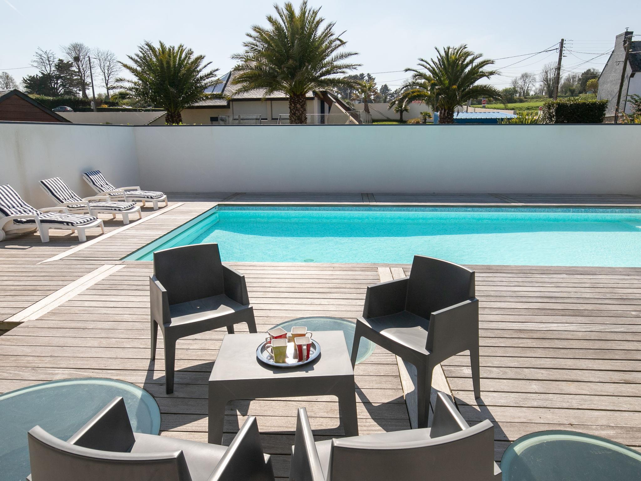 Modern single-family house "Villa de la Baie". 2 km from the centre of Locquirec, 22 km from the centre of Morlaix, on a slope, in the residential district, 120 m from the sea, 120 m from the beach. Private: property 300 m2 (fenced) with lawn and wildlife garden, swimming pool heated (9 x 4 m, seasonal availability: 01.May. - 23.Sep.). In the house: table tennis, table football. Storeroom available. Parking (for 2 cars) on the premises. Shop 2 km, grocery 2.3 km, supermarket 3 km, restaurant 2 km, bakery 2 km, café 200 m, bus stop "Fond de la Baie" 800 m, sandy beach "Les Sables Blancs" 2.6 km, diving center 20 km. Marina 2 km, golf course (18 hole) 30 km, surf school 2 km, sailing school 2 km, walking paths from the house 100 m. Nearby attractions: Côtendu Granit Rose 30 km, Lannion 18 km, Cairn de Barnenez et Baie de Morlaix 20 km, Carantec 38 km, Roscoff et Jardin Exotique 46 km. Hiking paths: GR34, sentier des douaniers 100 m.