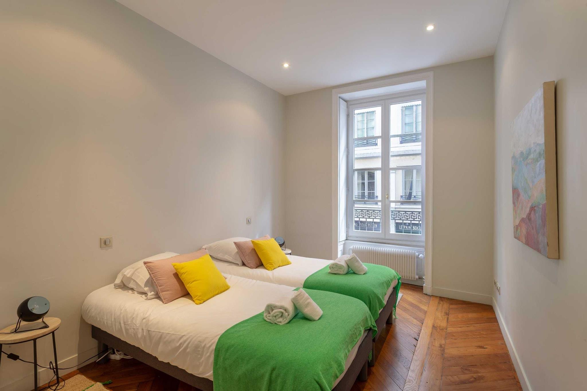 Smuk lejlighed på 90 kvm², fuldstændig renoveret og fuldt udstyret. Original parket og lister null Smuk lejlighed på 90 kvm², fuldstændig renoveret og fuldt udstyret. Original parket og lister, moderne design. I centrum af Lyon og tæt på butikker og turistattraktioner. 3 dobbeltværelser (2 med en 140-seng og 1 med to 90-senge) 2 badeværelser med bruser 1 toilet i et af badeværelserne En stor stue med stor komfortabel sofa og et moderne åbent køkken. Indkvartering Meget flot lejlighed, rummelig og ideelt beliggende. Kombinerer gammeldags charme og moderne indretning og tilbyder dig al den komfort og ro, du har brug for til at fuldende dit turist- eller forretningsophold. Fuldt udstyret: TV, vaskemaskine, opvaskemaskine, ovn, mikrobølgeovn, Nespresso- og filterkaffemaskine, WiFi, strygejern og strygebræt ... Lagner og håndklæder leveres. Du vil nyde hele lejligheden og være fri til at bruge alle faciliteterne.