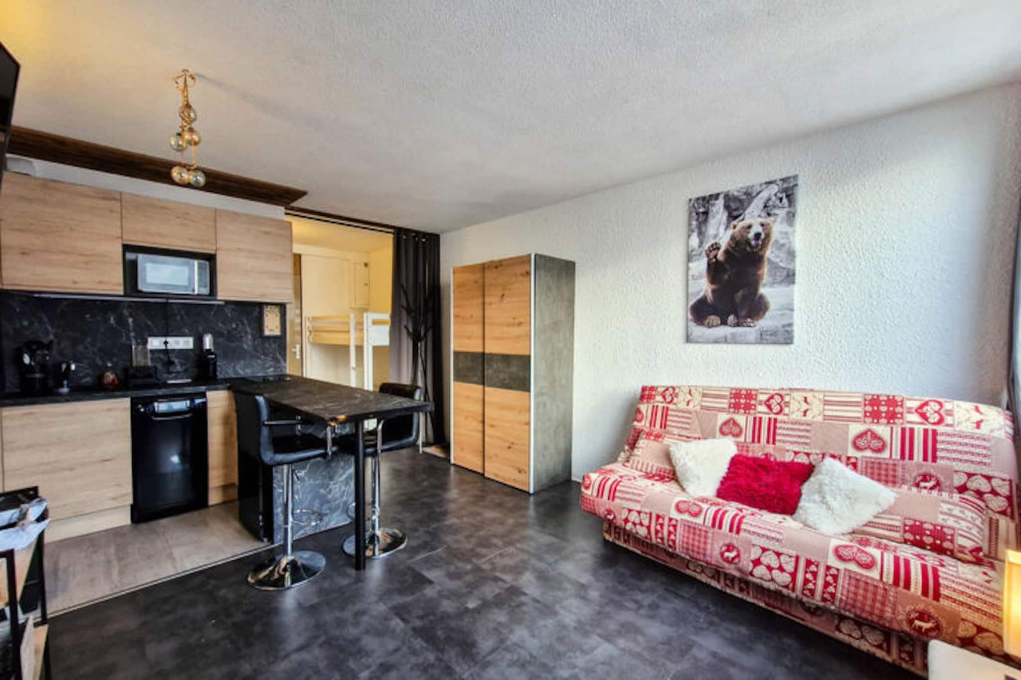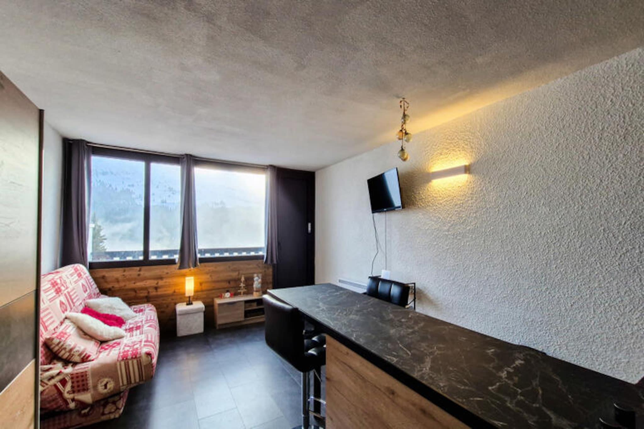 I det fredfyldte Flaine Forêt-distrikt inviterer dette charmerende sydvendte studie dig til at opleve de franske alpers skønhed. Beliggende kun 250 meter fra pisterne og skiskolens mødesteder, tilbyder det den perfekte balance mellem bekvemmelighed og ro. Uanset om du er her for at grave dig gennem uberørt sne om vinteren eller udforske de frodige bjergstier om sommeren, er dette hyggelige tilflugtssted din port til uforglemmelige alpine eventyr. Den sydvendte balkon tilbyder et solrigt fristed, hvor du kan slappe af og nyde den betagende udsigt over de omkringliggende tinder. Studiet er omhyggeligt designet til op til fire gæster og har en komfortabel stue med en dobbelt sovesofa og to køjesenge, adskilt af et forhæng for ekstra privatliv. Det fuldt renoverede interiør inkluderer et moderne køkken udstyret med køleskab, keramiske kogeplader, opvaskemaskine, mikrobølgeovn og kapselkaffemaskine, hvilket sikrer, at du har alt, hvad du behøver for et behageligt ophold. Et brusebad med toilet øger bekvemmeligheden, mens skiboksen gør det nemt at opbevare dit udstyr efter en dag på pisterne. Bemærk venligst, at den øverste køje ikke er egnet til børn under seks år, og sengelinned og håndklæder er ikke inkluderet. Ud over ejendommen finder du butikker og essentielle faciliteter kun en kort gåtur væk, hvilket gør det nemt at fylde op med forsyninger eller nyde et måltid ude. Om sommeren er den inkluderede