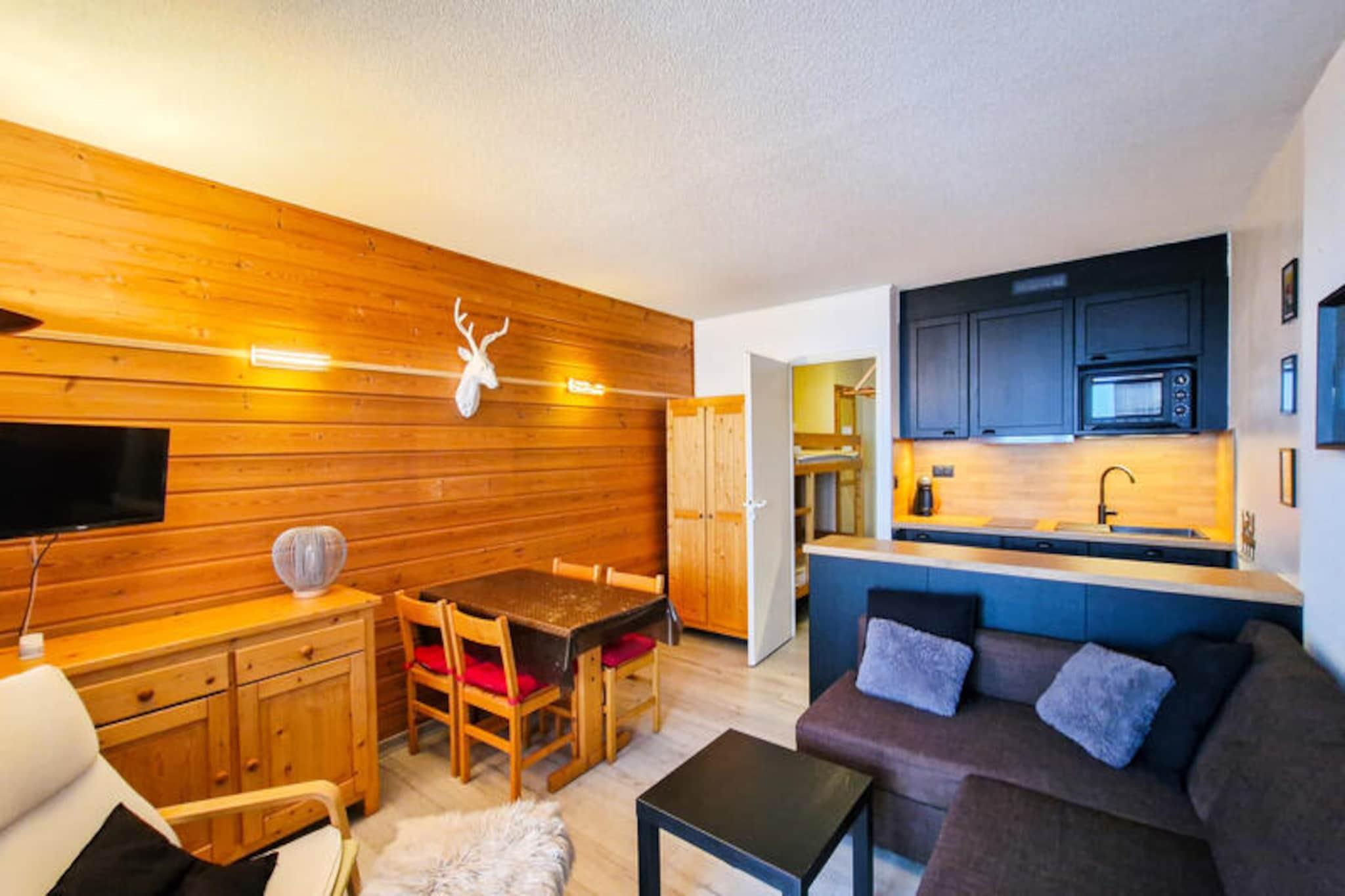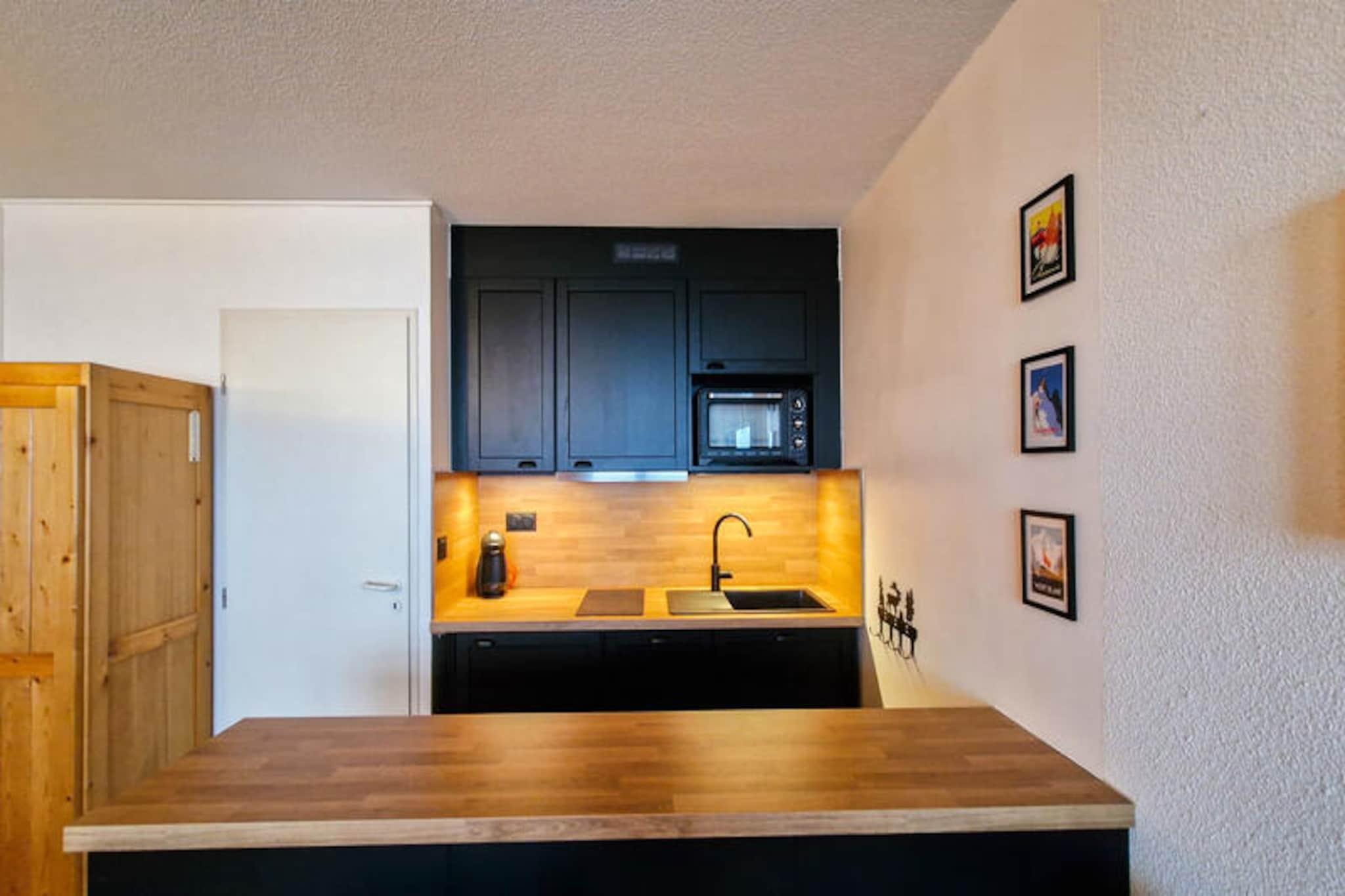 I hjertet af det maleriske Hameau de Flaine tilbyder dette charmerende studio i skandinavisk stil et hyggeligt tilflugtssted for dine alpine eventyr. Omgivet af fantastiske bjergudsigter og beliggende i et malerisk kvarter med en håndfuld butikker, kombinerer denne ejendom bekvemmelighed med en rolig atmosfære. Uanset om du er her for de snedækkede pister eller de pulserende sommeraktiviteter, er dette studio den perfekte base for dit ophold. Det 27 m² store sydvendte studio er omhyggeligt designet til at rumme op til fire gæster. Indgangen har et sæt køjesenge, mens stuen har en komfortabel dobbeltsovesofa, hvilket gør det ideelt for familier eller små grupper. Det åbne køkken er udstyret med moderne bekvemmeligheder, herunder keramiske kogeplader, ovn, opvaskemaskine og mikrobølgeovn, hvilket sikrer, at du har alt, hvad du behøver for at tilberede måltider efter en dag med udforskning. Slap af på den private sydvendte balkon, nyd solskinnet og indånd den friske bjergluft. Yderligere faciliteter inkluderer et fladskærms-tv, dvd-afspiller, et badeværelse med badekar og et separat toilet. For din bekvemmelighed er lagner, håndklæder og et velkomstsæt inkluderet, og der er et skirum til rådighed til dit udstyr. En blå piste i nærheden fører direkte til skilifterne, mens en gratis skibus tager dig til Flaine Forêt skiskoles mødested, hvilket sikrer problemfri adgang til pisterne. Om sommeren inkluderer ophold på seks nætter eller mere \