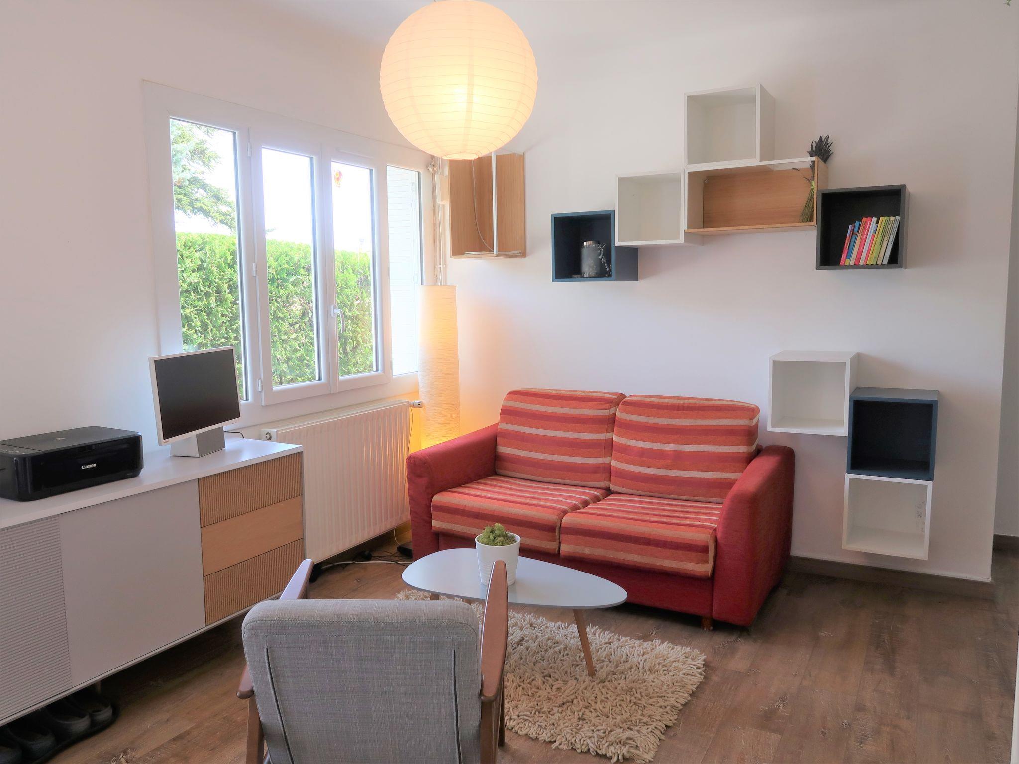 "Le Jade", 5-room house 104 m2. Comfortable and beautiful furnishings: living/dining room with Scandinavian wood stove (only for decoration), dining table and TV. Exit to the garden, to the terrace. 1 room with 1 french bed (1 x 160 cm, length 200 cm). 1 room with 1 french bed (1 x 140 cm, length 190 cm). 1 room with 1 french bed (1 x 160 cm, length 210 cm). Office. Kitchen (oven, dishwasher, 3 induction hot plates, toaster, kettle, electric coffee machine). 2 showers, sep. WC. Oil heating. Terrace 20 m2, large garden 600 m2. Terrace furniture. Facilities: washing machine. Internet (WiFi, free). Parking (1 car). Please note: non-smokers only. Maximum 1 pet/ dog allowed. Smoke alarm. Offer by a private individual according to Art. 155, IV of CGI.