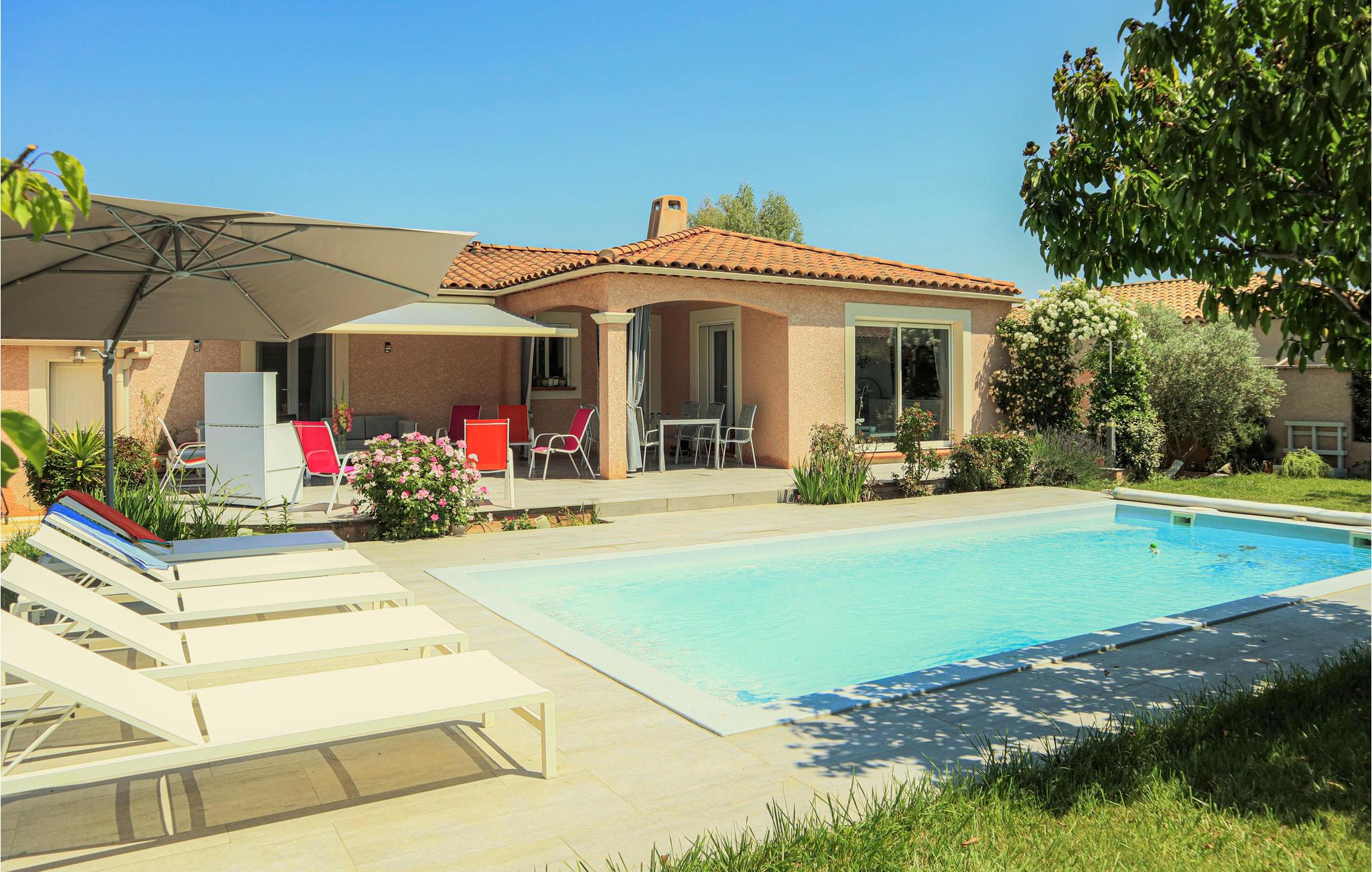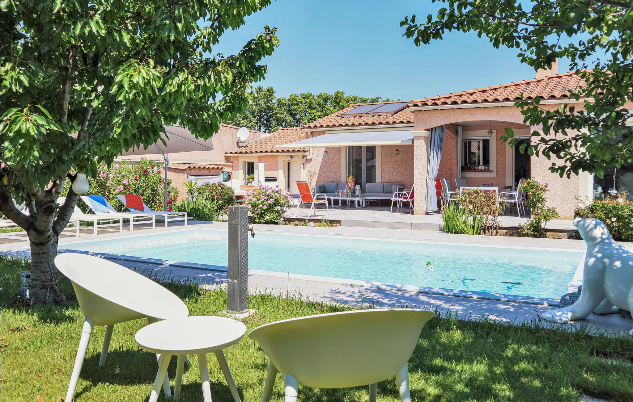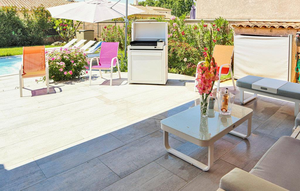Dette komfortable feriehus med pool ligger i udkanten af ??landsbyen Mallemort i et boligområde. Huset er dekoreret i lyse farver og med smukke møbler og tilbyder plads i 3 soveværelser, 1 badeværelse, køkken-spisestue og en stue. Der er også et separat toilet. Husets hjerte er den hyggelige stue med et stort tv, hvor I kan tilbringe hyggelige aftener sammen. Der er gulvvarme i hele huset for ekstra komfort.
