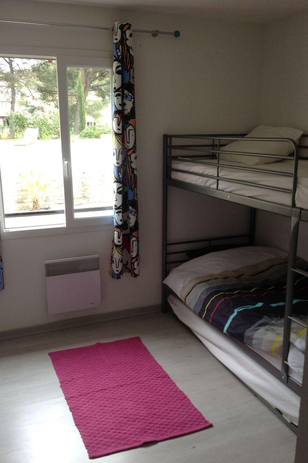 Upstairs there is a bedroom with a 160cm double bed, a bedroom with 2 single beds and a children's bedroom with 3 bunk beds and a cot.