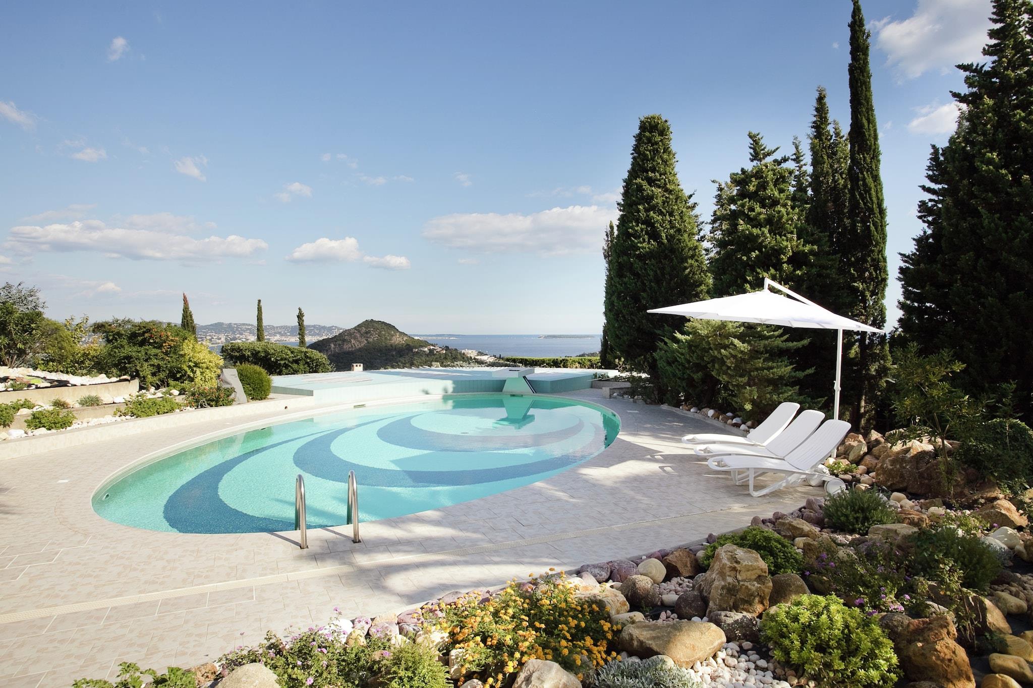 Denne smukke og rummelige arkitekttegnede villa er en sand arkitektonisk skønhed på den franske riviera og ligger på en bakketop med 360° udsigt over havet og bjergene med udsigt over bugten i Cannes. Med 500 m² boligareal og 12.000 m² indhegnet have og park er villaen velegnet til flere familier eller grupper af venner. De tre store suiter og to soveværelser er uafhængige: direkte adgang, privat terrasse, privatliv, ro og faciliteter. Flere lounger, spisestuer, 2 moderne, veludstyrede køkkener, gårdhave, massageområde, lydrum, udstyret sportsrum, jacuzzi, hammam, sauna, bordtennisområde, plancha og grill, ... er tilgængelige for alle! I et privat og lukket område på mere end 300 hektar, på grund af sin beliggenhed og sin position, uden nogen modsætning, tilbyder villaen intimitet, fred og ro. Den er velegnet til de mest krævende kunder, VIP'er og berømtheder. På grund af sin rolige beliggenhed udlejes denne ejendom ikke til ungdomsgrupper. Feriehuset ligger på samme ejendom som ejeren.