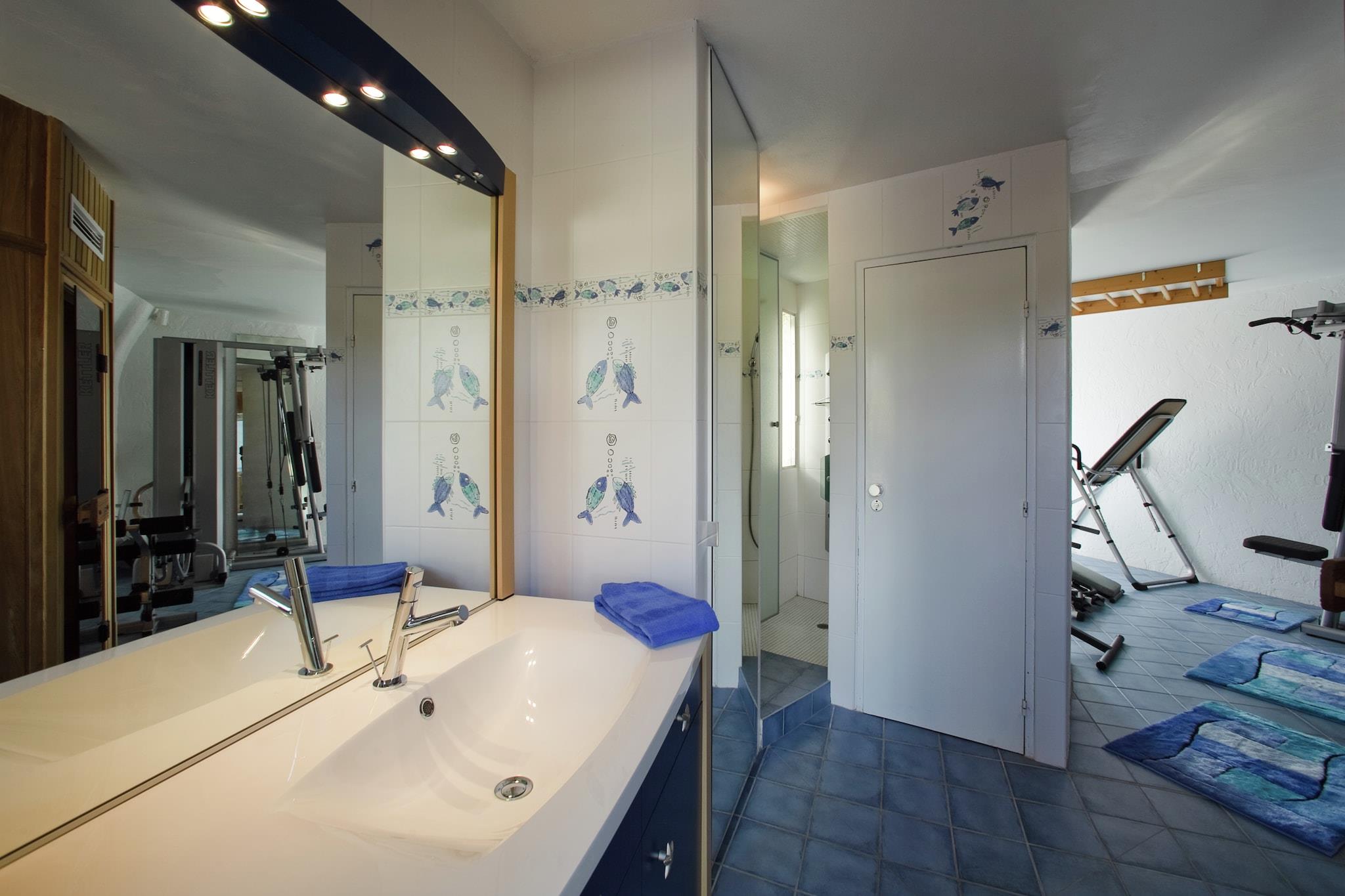 Stueetage: (Stue(sofahjørne, terrasse), spisestue(spisebord), køkken-alrum(spisebord, elkedel, komfur(Komfur med fire kogeplader), 2x kaffemaskine(kopper, espresso, kaffetragt), ovn, mikrobølgeovn, opvaskemaskine , køle-fryseskab, køle-fryseskab), Soveværelse med badeværelse(dobbeltseng(200 x 180 cm), Fjernsyn(parabol), elkedel, Bubble bath, bruser, toilet, klimaanlæg, terrasse, føntørrer), Soveværelse med badeværelse(dobbeltseng(200 x 180 cm), Fjernsyn(parabol), elkedel, badekar, toilet, klimaanlæg, terrasse, føntørrer), vaskerum (tørretumbler, vaskemaskine), fitnessrum, loungerum(dampbruser, sauna), klimaanlæg) På 1. etage: (entre(3x sofahjørne), Stue(sofahjørne), fjernsynsstue(Fjernsyn(parabol), stereoanlæg), soveværelse(dobbeltseng(200 x 180 cm), Fjernsyn, balkon eller terrasse, klimaanlæg, føntørrer), Soveværelse med badeværelse(dobbeltseng(180 x 200 cm), Fjernsyn(parabol), elkedel, bruser, toilet, klimaanlæg, terrasse, terrasse(overdækket), føntørrer), badeværelse(bruser, håndvask, toilet), klimaanlæg) Poolhus: (bar) opholdsrum, garage, pejs, kakkelovn, opvaskemaskine , badekar eller bruser, hottub, massagebruser, patio, klimaanlæg, terrasse, have, have(indhegnet, 1,5 hm2), havemøbler, solstole, grill, parkering, liggestole, Parasol, swimmingpool(privat, 15 x 8 m.), tennisbane(deles med andre gæster), bordtennisbord, fitnessapparater, barneseng, strygebræt, Alarm