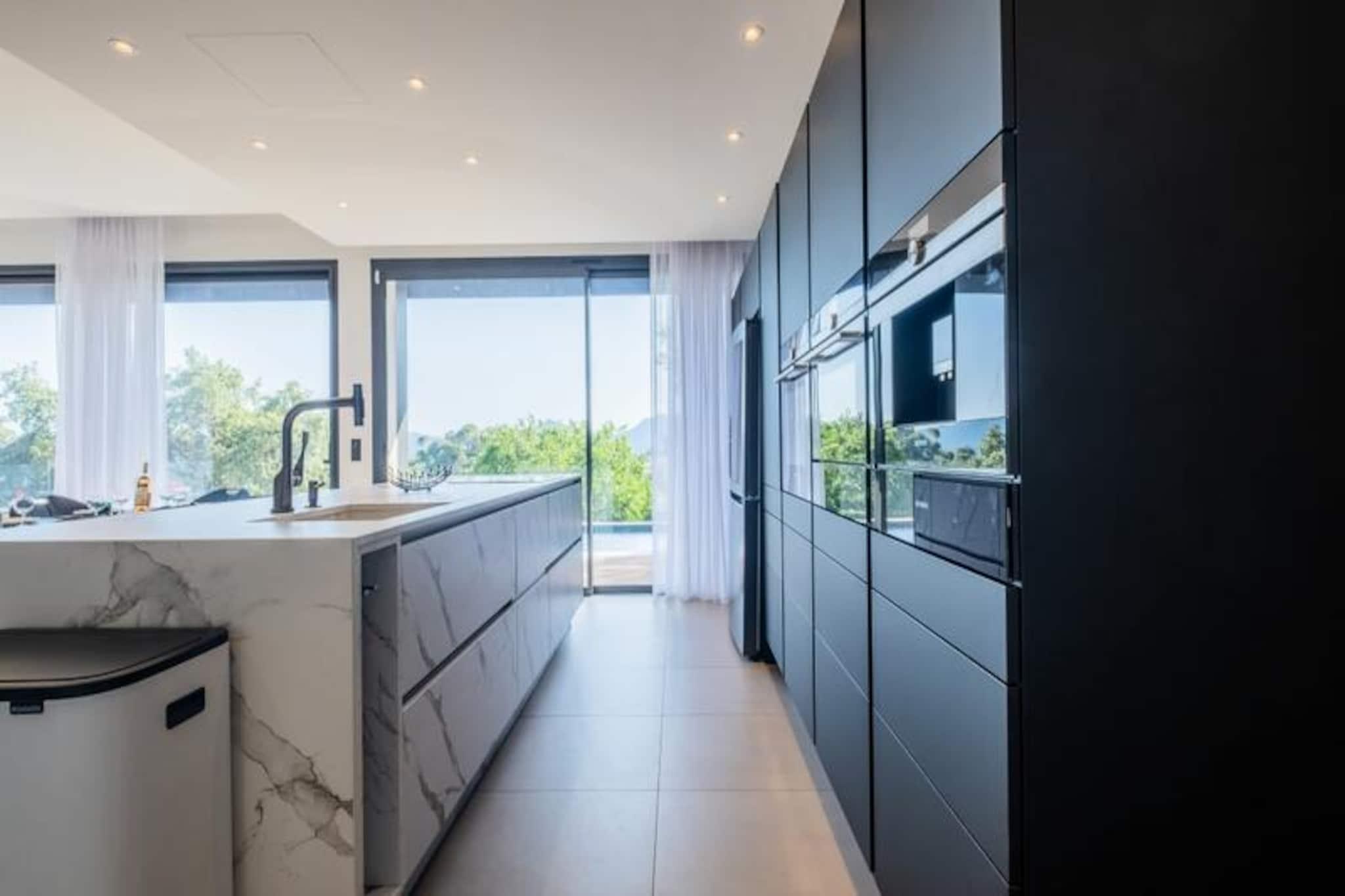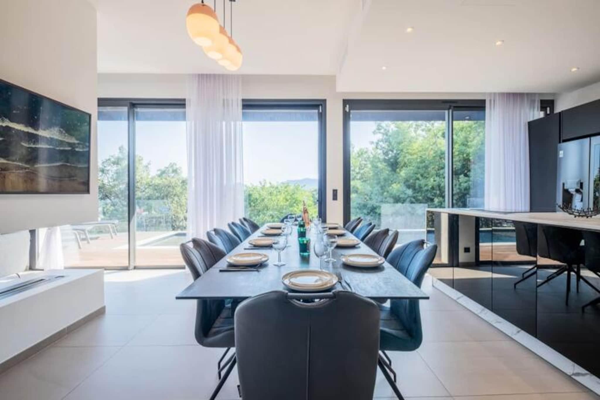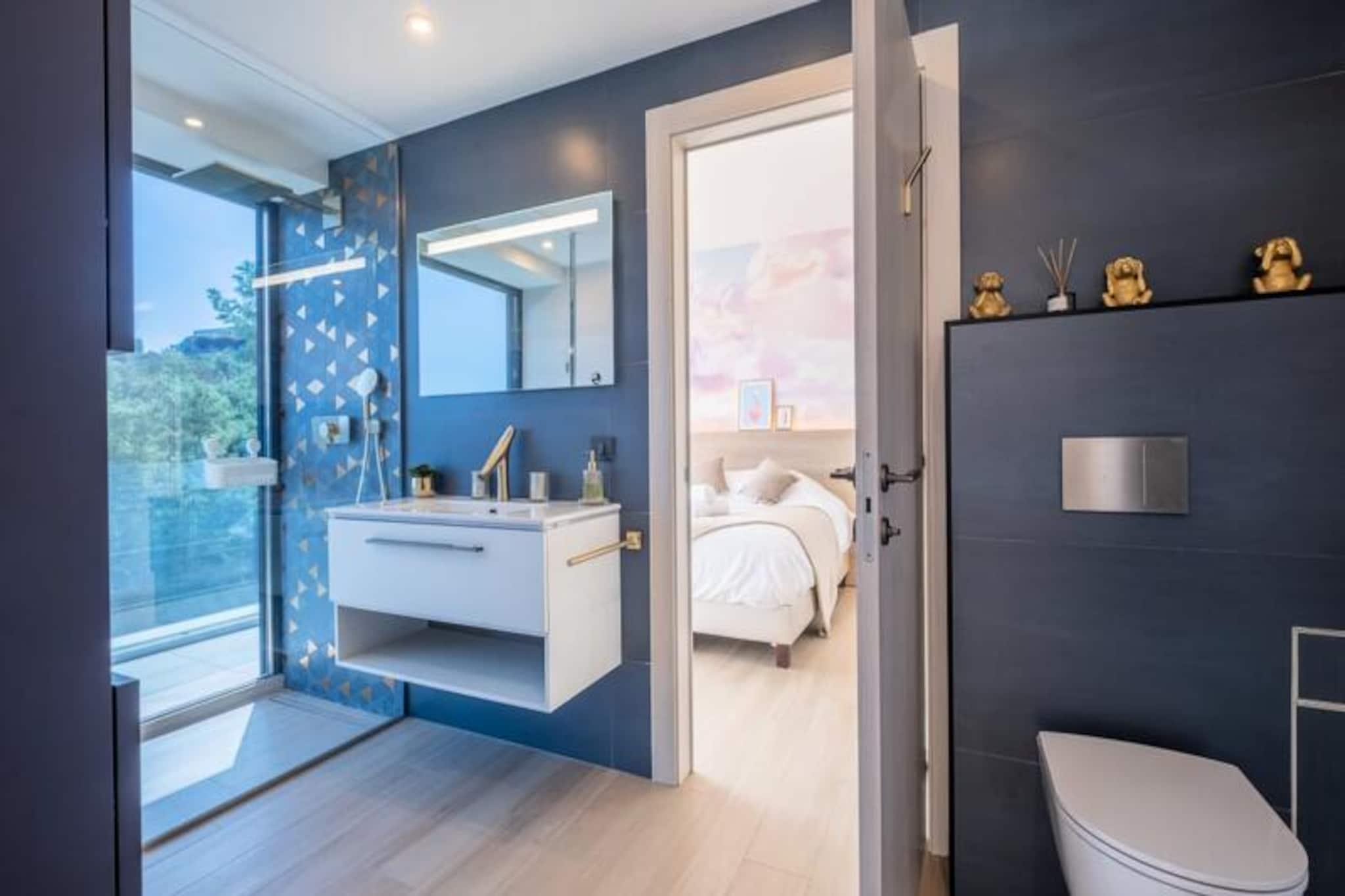 Højt over Mandelieus fredfyldte bakker tilbyder dette udsøgte feriehus et privat tilflugtssted, hvor ro møder en betagende udsigt over Middelhavet. Forestil dig morgener med at nippe til kaffe på den solbeskinnede terrasse, eftermiddage med afslapning ved den opvarmede pool og aftener med solnedgangen, der maler himlen i nuancer af guld og karmosinrød. Denne ejendom er et paradis for dem, der søger fred og luksus, kun få minutter fra de pulserende strande og attraktioner på den franske riviera. \n\nTræd indenfor og oplev et rummeligt og elegant designet interiør, der problemfrit blander komfort og sofistikering. Stueetagen har en lys og luftig opholdsstue med luksuriøse siddepladser til op til 12 gæster, et smart-tv til underholdning og et fuldt udstyret åbent køkken med en central køkkenø, perfekt til at dele måltider og minder. Ovenpå er soveværelserne et fristed for afslapning, der alle er omhyggeligt indrettet med eksklusive møbler, smart-tv'er og eget badeværelse. Master-suiten med sin kingsize-seng og luksuriøse badeværelse er en sand forkælelse. \n\nUdenfor er haven på bjergsiden en privat oase med en opvarmet pool, der er tilgængelig fra midten af ??april til midten af ??oktober, omgivet af liggestole og skyggefulde siddeområder. Uanset om du nyder solen eller panoramaudsigten over havet, føles hvert øjeblik som en drøm. Ejendommen tilbyder også parkering til op til fire biler, hvilket sikrer dit ophold bekvemt. \n\nBeliggende kun 10 minutter fra Mandelieus strande og inden for rækkevidde af Cannes, Antibes og Monaco, er dette hjem perfekt placeret til at udforske Rivieras fineste attraktioner. Fra fine restauranter til sandstrande er alt hvad du behøver inden for en kort køretur. Vælg dette fantastiske tilflugtssted til din næste ferie og oplev magien ved Côte d'Azur.