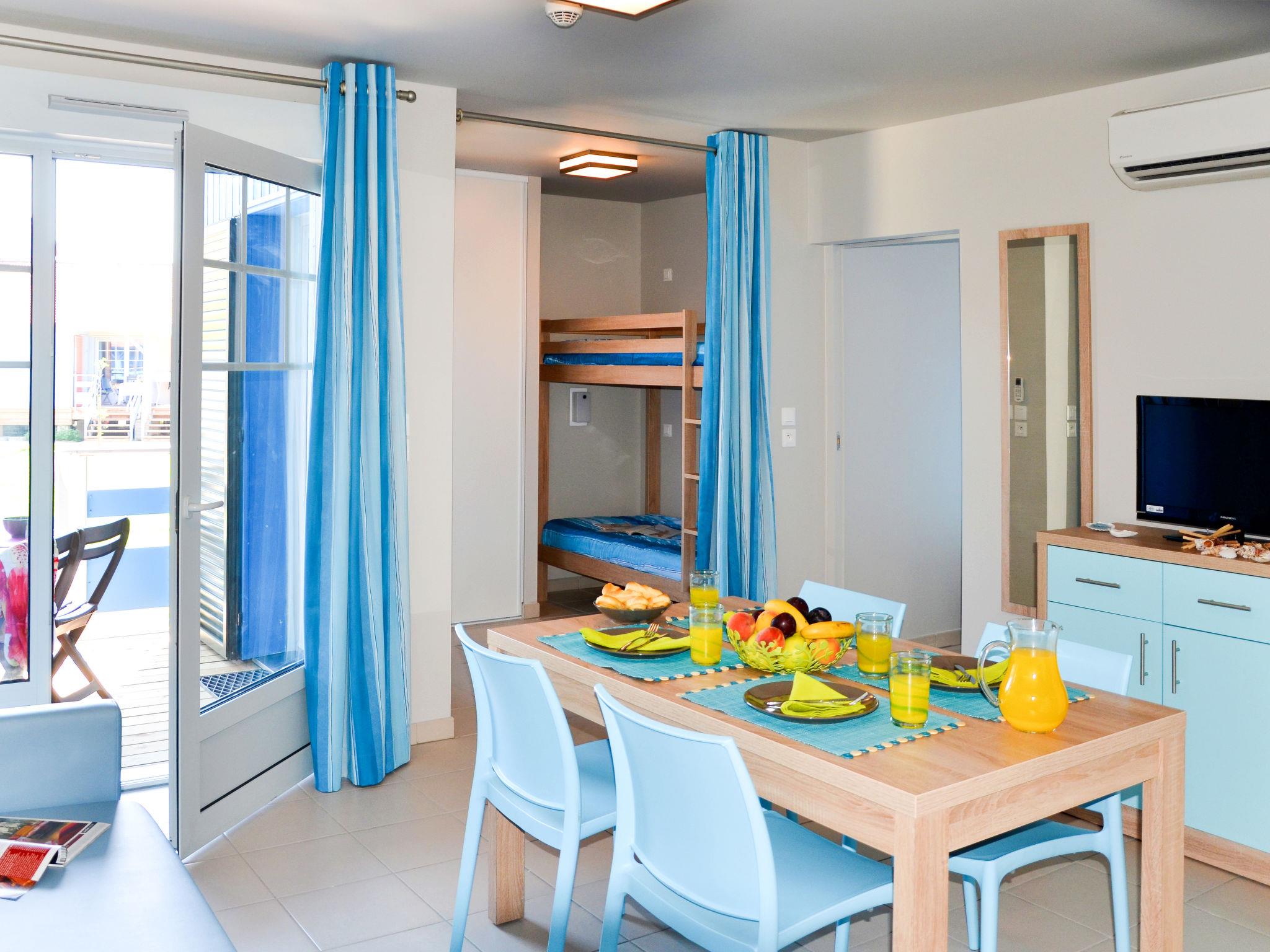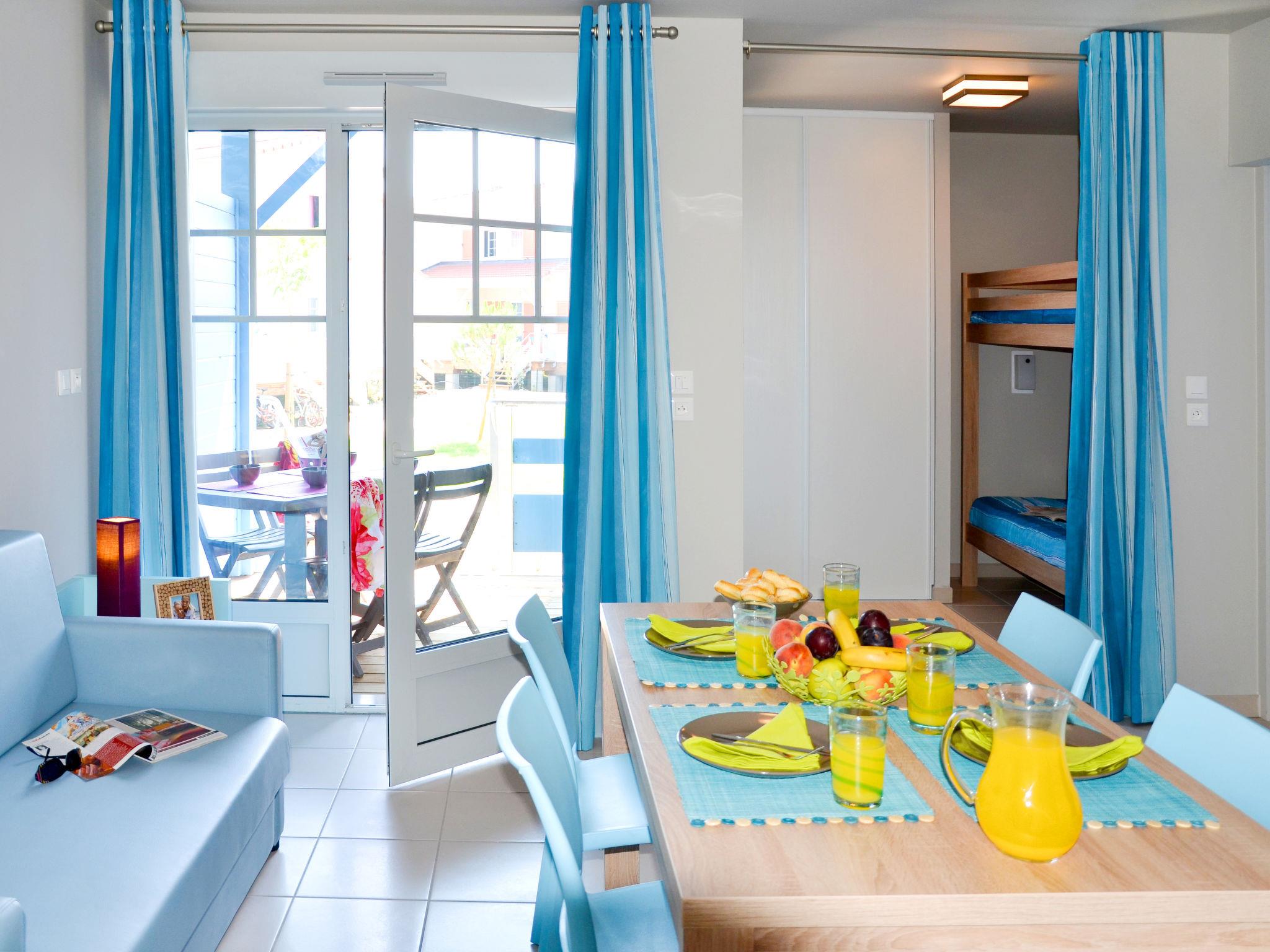 "La Grenadine", 2-room terraced house 38 m2. Object suitable for 4 adults + 2 children. Practical and modern furnishings: living/sleeping room with 1 double sofabed, dining table, TV can be hired and air conditioning. 1 room with sliding door with 1 french bed (160 cm). Alcove with curtain with 1 x 2 bunk beds (80 cm). Kitchenette (dishwasher, 4 ceramic glass hob hotplates, toaster, kettle, microwave, freezer, electric coffee machine). Shower/WC. Electric heating. Small terrace roofed. Terrace furniture. Facilities: children's high chair, baby cot (extra). Internet (WiFi, extra). Please note: non-smokers only. Maximum 2 pets/ dogs allowed. Smoke alarm. Instead of an enclosed bedroom, some sleeping areas are located in an open-plan area (gallery, alcove, etc.).
