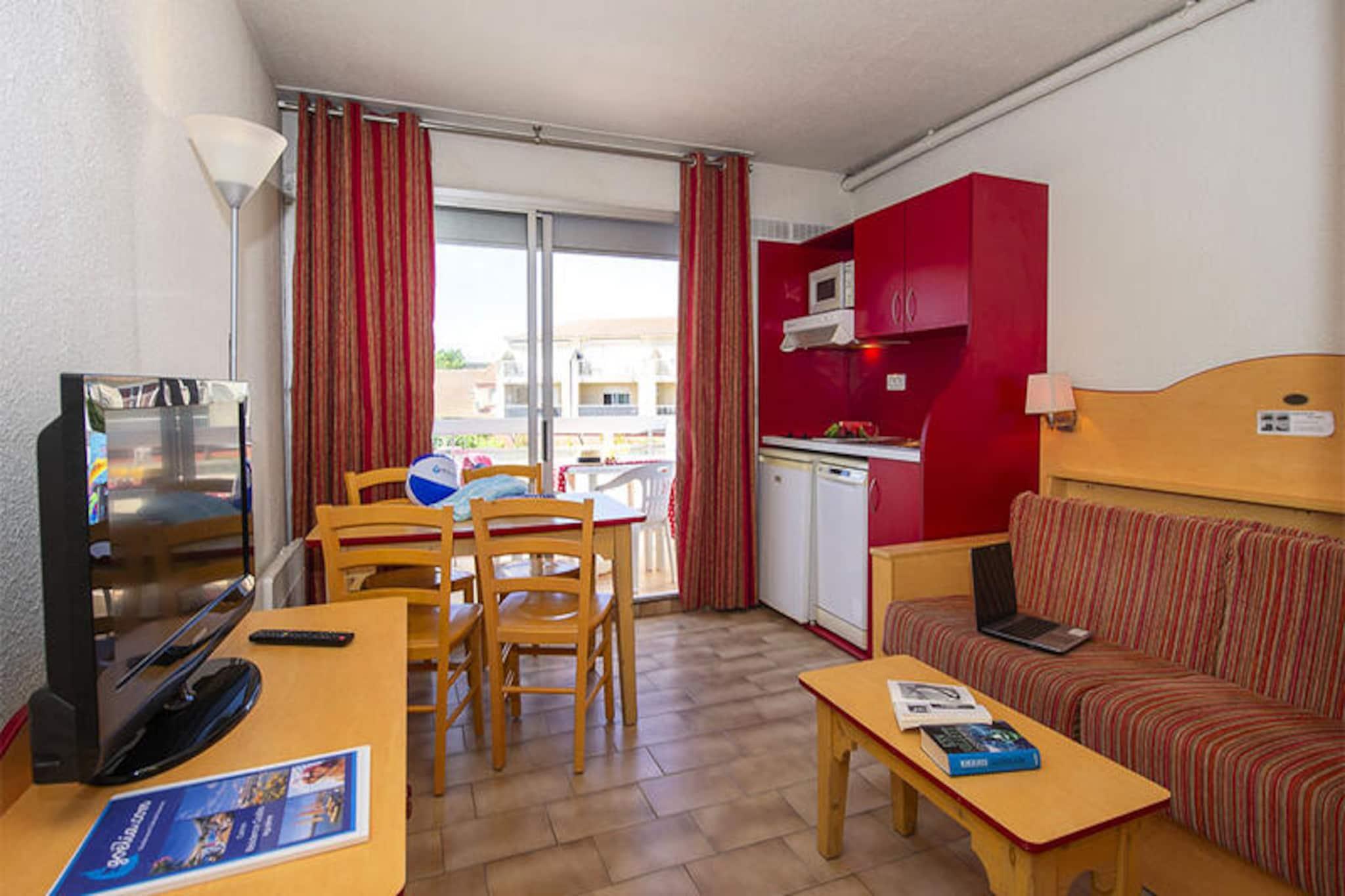 Et roligt tilflugtssted venter dig i den charmerende kystby Carnon, kun 10 minutter fra Montpellier. Goélia Aguylène Residence tilbyder en harmonisk blanding af ro og bekvemmelighed, omgivet af frodigt grønt og beliggende mellem den glitrende lystbådehavn og en forfriskende swimmingpool. Uanset om du søger en fredelig flugt eller en aktiv ferie, er denne bolig perfekt placeret til at imødekomme alle dine ønsker. Med stranden kun 100 meter væk og lokale butikker kun en kort gåtur på 400 meter, er alt hvad du behøver inden for rækkevidde. \n\nBoligen tilbyder rummelige, gennemtænkt designede lejligheder, der komfortabelt rummer op til fem gæster. Hver enhed kan prale af en lys opholdsstue med en sovesofa, et veludstyret køkken og en hyggelig sovealkove med køjesenge. De store karnapvinduer tilbyder malerisk udsigt over havnen og indbydende naturligt lys, der skaber en varm og indbydende atmosfære. Moderne faciliteter såsom Wi-Fi, tv og valgfrie babysæt sikrer et problemfrit ophold, mens den udendørs swimmingpool med soldæk er det perfekte sted at slappe af under middelhavssolen. Carnon er et knudepunkt for spændende vandsportsgrene og aktiviteter, herunder sejlads, windsurfing, kitesurfing og jetski. En gratis shuttlebåd er tilgængelig i sommermånederne, hvilket gør det nemt at udforske den pulserende marina og dens omgivelser. For dem, der ønsker at udforske området længere, ligger Montpelliers kulturskatte og travle gader kun en kort køretur væk. Med sin idylliske beliggenhed og et udvalg af faciliteter lover Goélia Aguylène Residence en uforglemmelig ferieoplevelse. Uanset om du nyder solen ved poolen, slentrer langs sandstrandene eller nyder det lokale køkken, er denne residens din indgang til det bedste af den franske riviera. Book dit ophold nu og skab varige minder i dette middelhavsparadis.