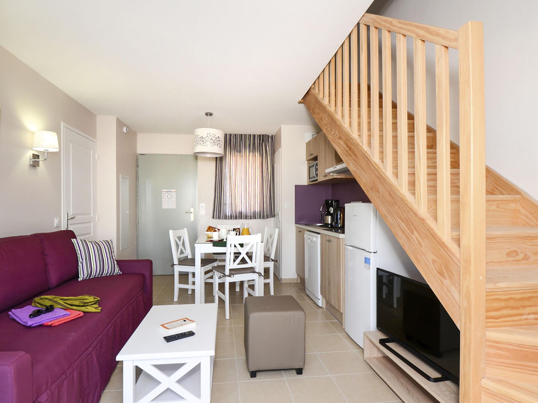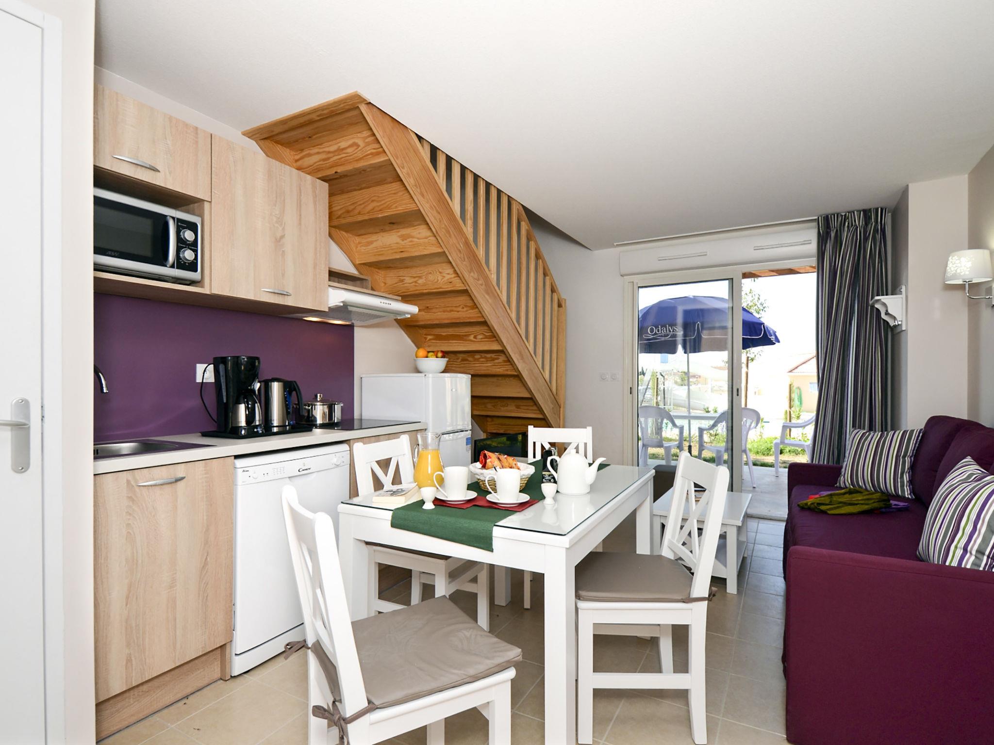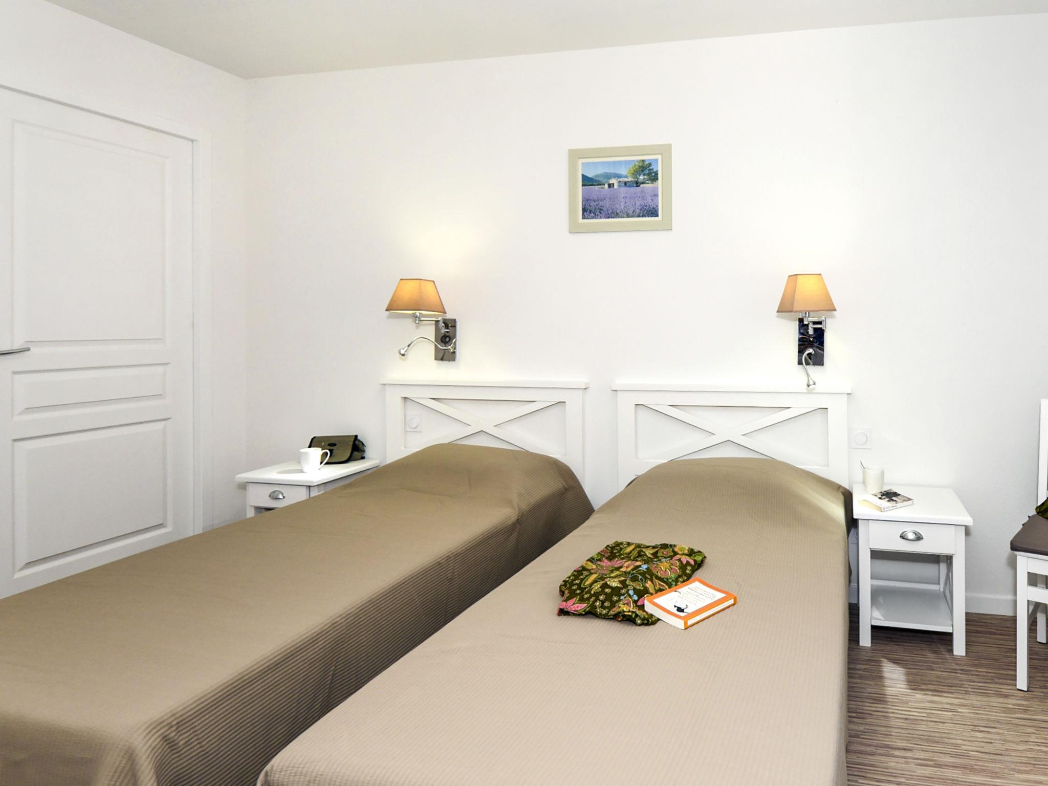 "Odalys Référence Le Mas des Alpilles", 3-room apartment 45 m2 on 2 levels. Beautiful furnishings: living/sleeping room with 1 double sofabed, dining table and TV. 1 room with 2 beds and shower/WC. Kitchenette (dishwasher, 2 ceramic glass hob hotplates, kettle, microwave, electric coffee machine). Upper floor: 1 room with 1 french bed. Bathroom, sep. WC. Electric heating. Terrace. Terrace furniture. Facilities: children's high chair, baby cot. Internet (WiFi, free). Please note: non-smokers only. Maximum 1 pet/ dog allowed. Smoke alarm.