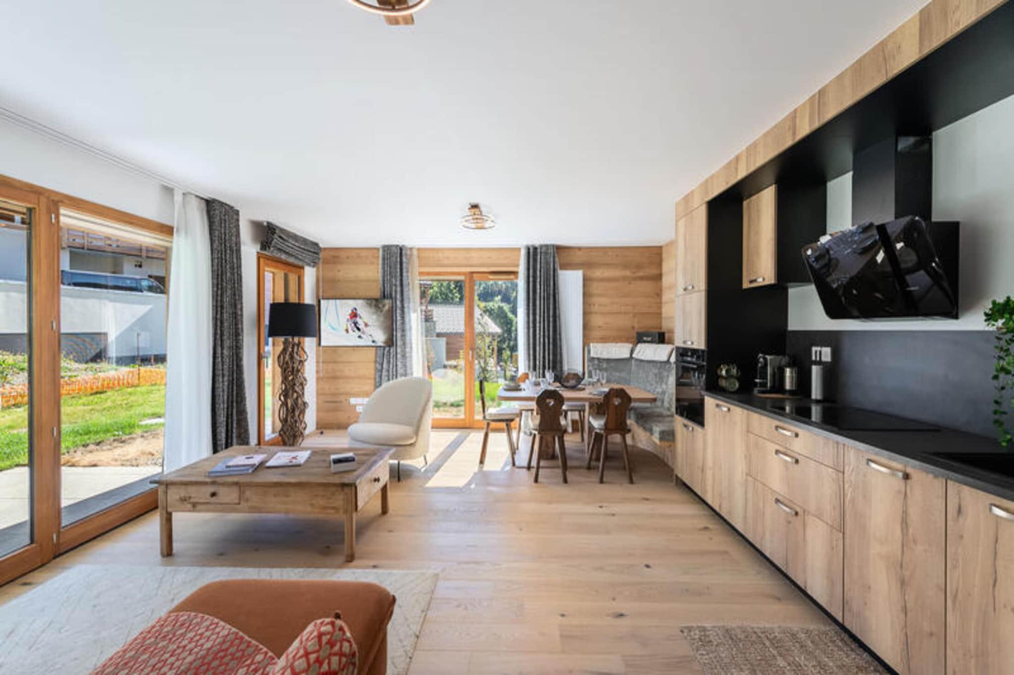 Beliggende i det fredelige og grønne Villaret-distrikt i Megève, tilbyder denne nye lejlighed i Silverlodge-residensen et ideelt tilflugtssted for familier eller grupper, der søger komfort og ro. Beliggende kun en kort afstand fra Megèves bymidte, har du nem adgang til butikker, restauranter og skilifte. Nyd skiløb om vinteren eller vandreture og mountainbike om sommeren, med det fantastiske alpine landskab altid inden for rækkevidde. Med smagfuld indretning og moderne bekvemmeligheder har det et soveværelse med dobbeltseng med tv og skrivebord samt et børneværelse med 4 enkeltsenge (en tvillingseng og en køjeseng), der kan rumme op til 4 voksne og 2 børn. Den lyse opholdsstue er udstyret med et tilsluttet tv, perfekt til at slappe af efter en dag på pisterne eller udforske området. Det åbner ud til en dejlig terrasse, der giver et perfekt sted at nyde den friske luft og den omkringliggende natur. Lejligheden har et separat badeværelse og et skiskab for nemheds skyld. Yderligere frynsegoder inkluderer to parkeringspladser i garagen og regelmæssig rengøring. Kæledyr er velkomne, og boligen er ikke-ryger.