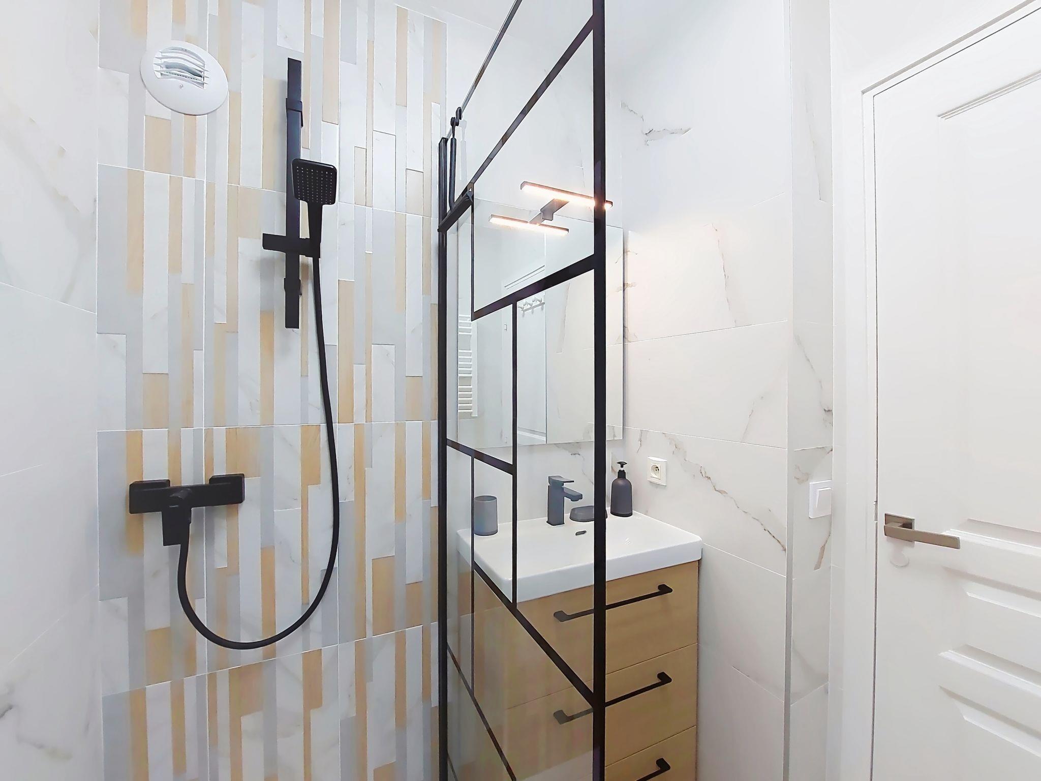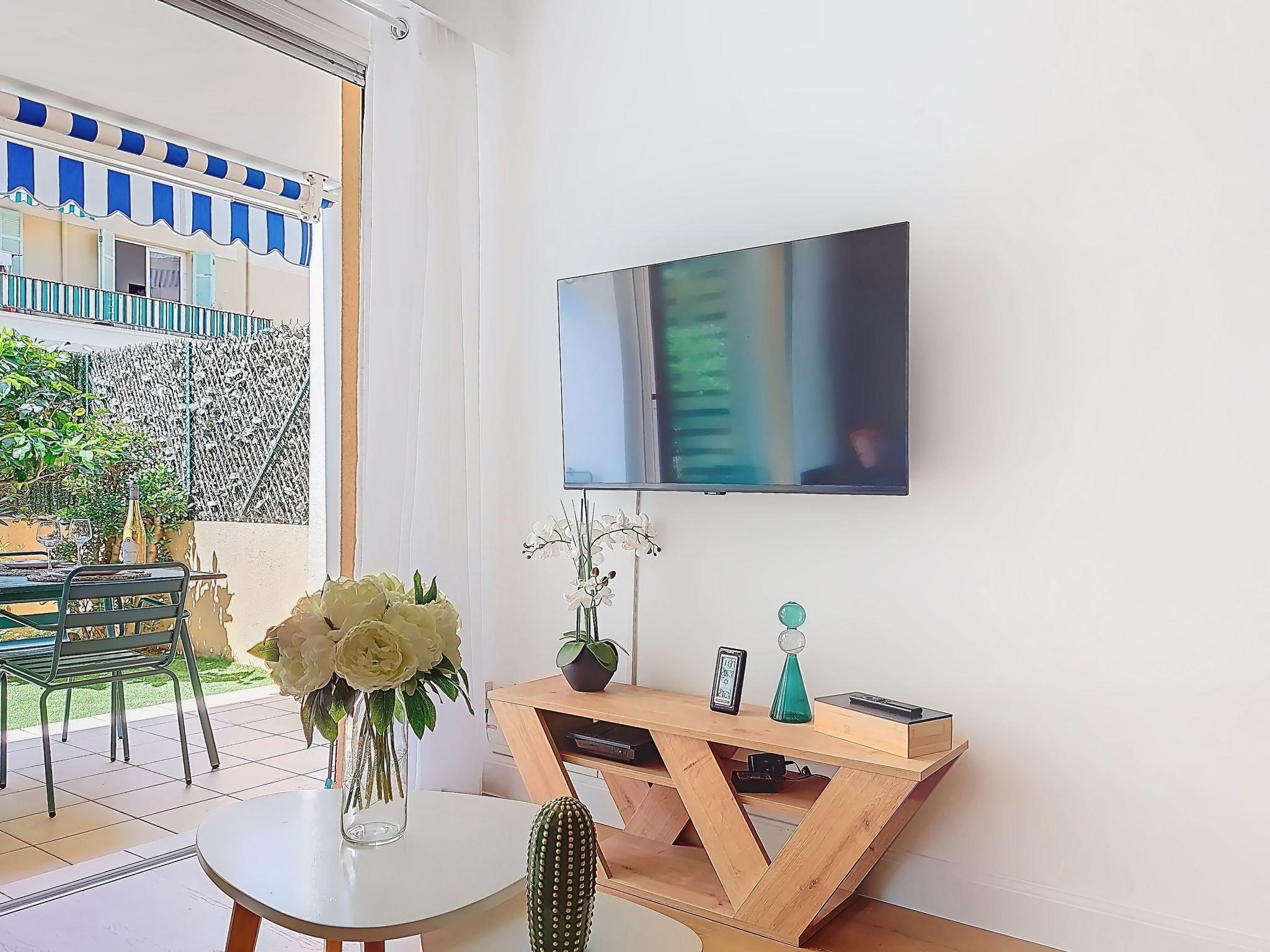 2-room apartment 32 m2, on the ground floor. Bright in 2025, beautiful and modern furnishings: living/dining room with panoramic window with 1 double sofabed (140 cm, length 190 cm), flat screen and air conditioning. Exit to the terrace. Kitchen (oven, dishwasher, 4 ceramic glass hob hotplates, toaster, kettle, microwave, electric coffee machine, Capsules for coffee machine (Nespresso) extra). Bathroom. Heating. Large terrace 20 m2. Sitting area. Facilities: washing machine, iron, hair dryer. Internet (WiFi, free). Please note: smoke alarm. Offer by a private individual according to Art. 155, IV of CGI. 06104001551JE