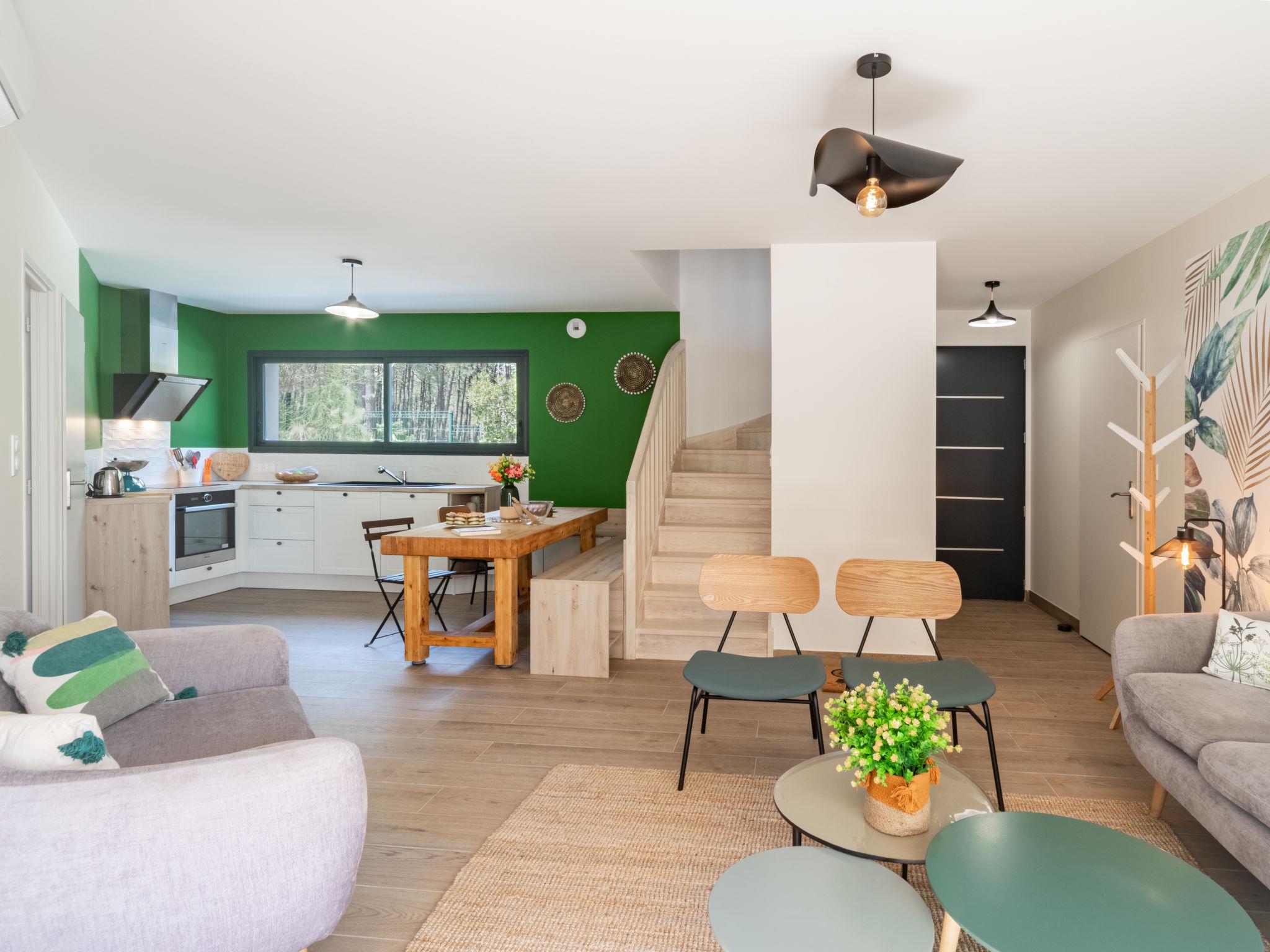 Beautiful terraced house "Ocean forest", built in 2023. In the resort 900 m from the centre of Mimizan Plage, 450 m from the sea, 10 km from the lake, 450 m from the beach. Parking (for 2 cars). Shop, grocery 400 m, shopping centre 6 km, restaurant 400 m, bakery 300 m, bicycle rental 500 m, bus stop 1 km, sandy beach "Remember" 100 m, bathing lake "Aureilhan" 10 km. Surf school 500 m, riding stable 9 km, cycle lane 100 m. Nearby attractions: Skate parc 950 m, Eco musée de Marquèze 40 km, Disc golf 100 m, Casino jeux 1 km, Biscarrosse 35 km, Arcachon 70 km.