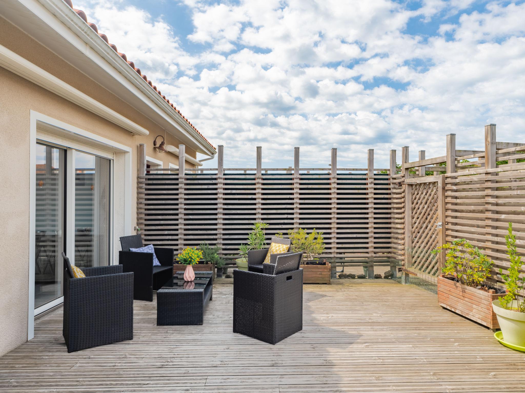 "grand courlis", 3-room apartment 80 m2, on the ground floor. Beautiful and modern furnishings: living/dining room with 1 sofabed (140 cm, length 190 cm), TV (flat screen), electric heater. Exit to the terrace. 1 room with rooflight with 1 french bed (1 x 140 cm, length 190 cm). 1 room with rooflight with 1 french bed (1 x 140 cm, length 190 cm). Open kitchen (oven, dishwasher, 3 induction hot plates, toaster, kettle, microwave, electric coffee machine, Capsules for coffee machine (senseo) extra). Shower/WC. Wooden floors. Large terrace 80 m2, south facing position and west facing position. Terrace furniture, barbecue. Facilities: washing machine. Internet (WiFi, free). Parking at the house. Please note: non-smokers only. Maximum 1 pet/ dog allowed. Smoke alarm. Offer by a private individual according to Art. 155, IV of CGI.