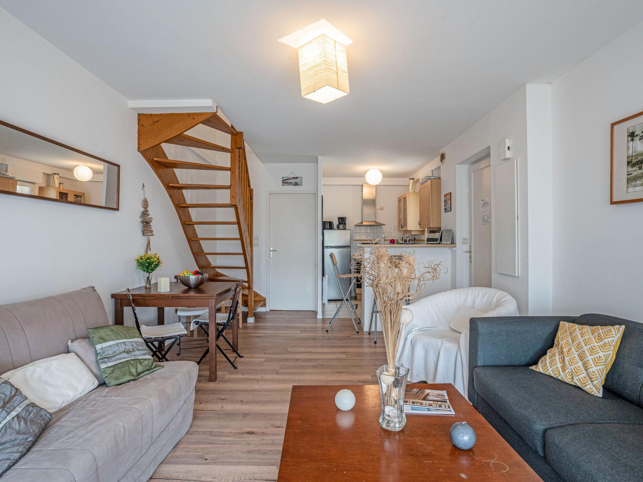 3-room terraced house 55 m2 on 2 levels. Beautiful furnishings: living/dining room with satellite TV and international TV channels (flat screen), hi-fi system. Exit to the terrace. Kitchenette (oven, dishwasher, 3 ceramic glass hob hotplates, microwave). Sep. WC. Upper floor: 1 room with 1 french bed (1 x 140 cm, length 190 cm). 1 room with 2 beds (90 cm, length 190 cm). Bath/WC. Electric heating. Terrace 20 m2 partly roofed, south facing position. Terrace furniture, deck chairs (2). View of. Facilities: washing machine, dryer. Internet (WiFi, free). Parking. Please note: maximum 1 pet/ dog allowed. Smoke alarm.