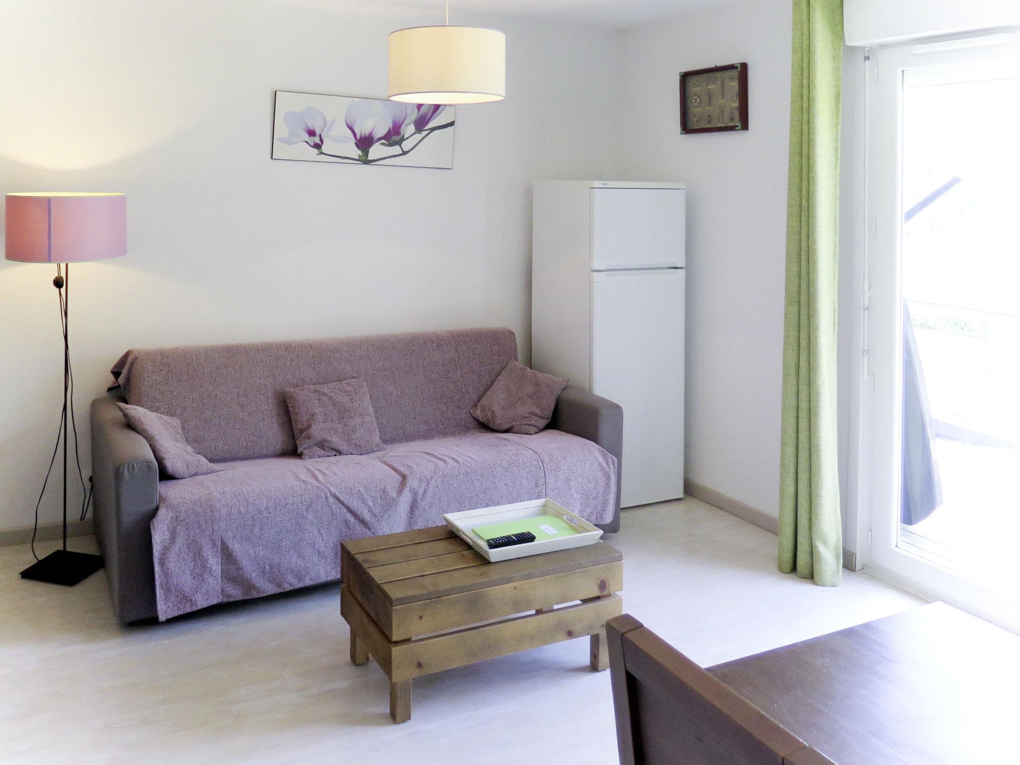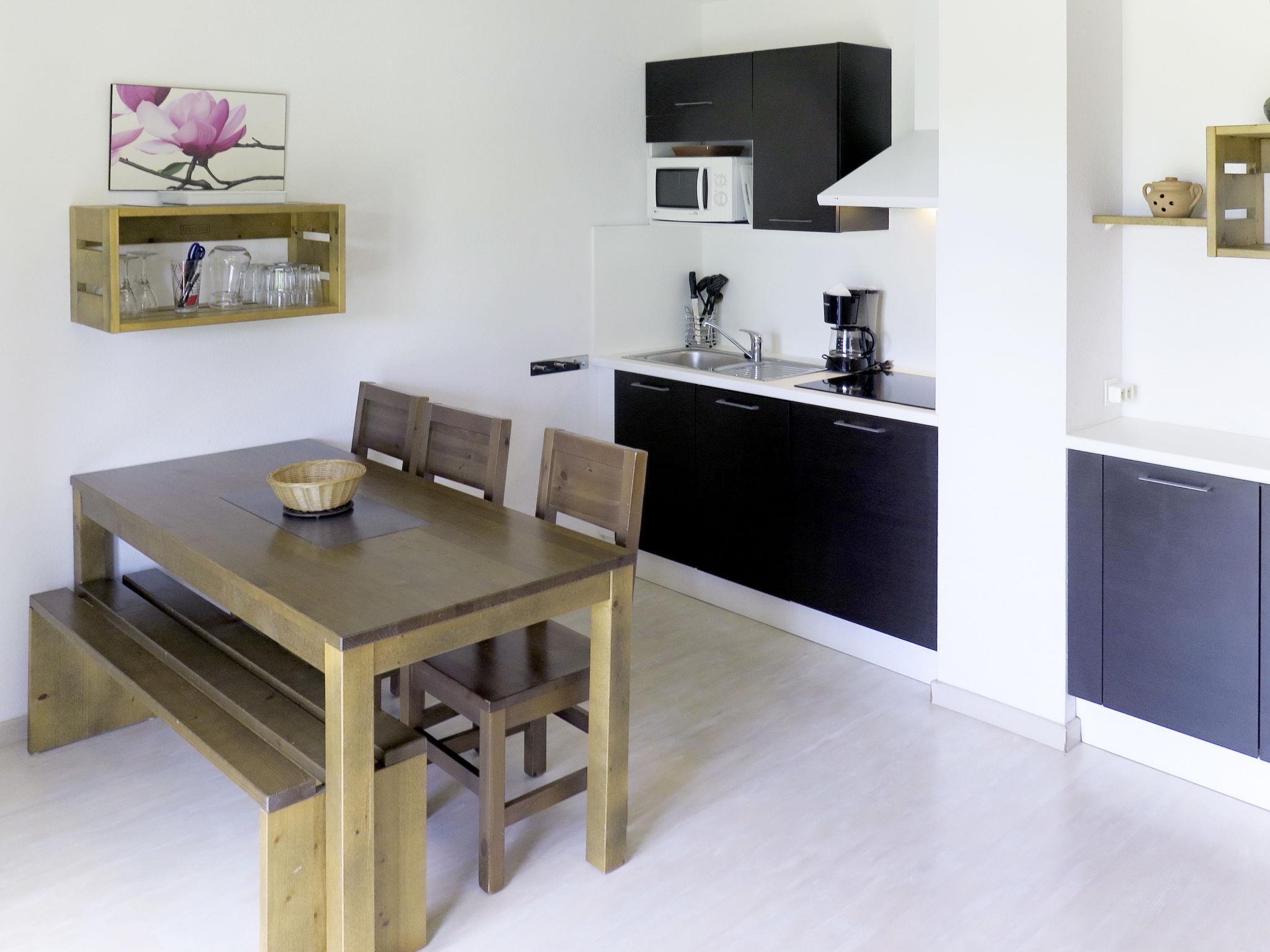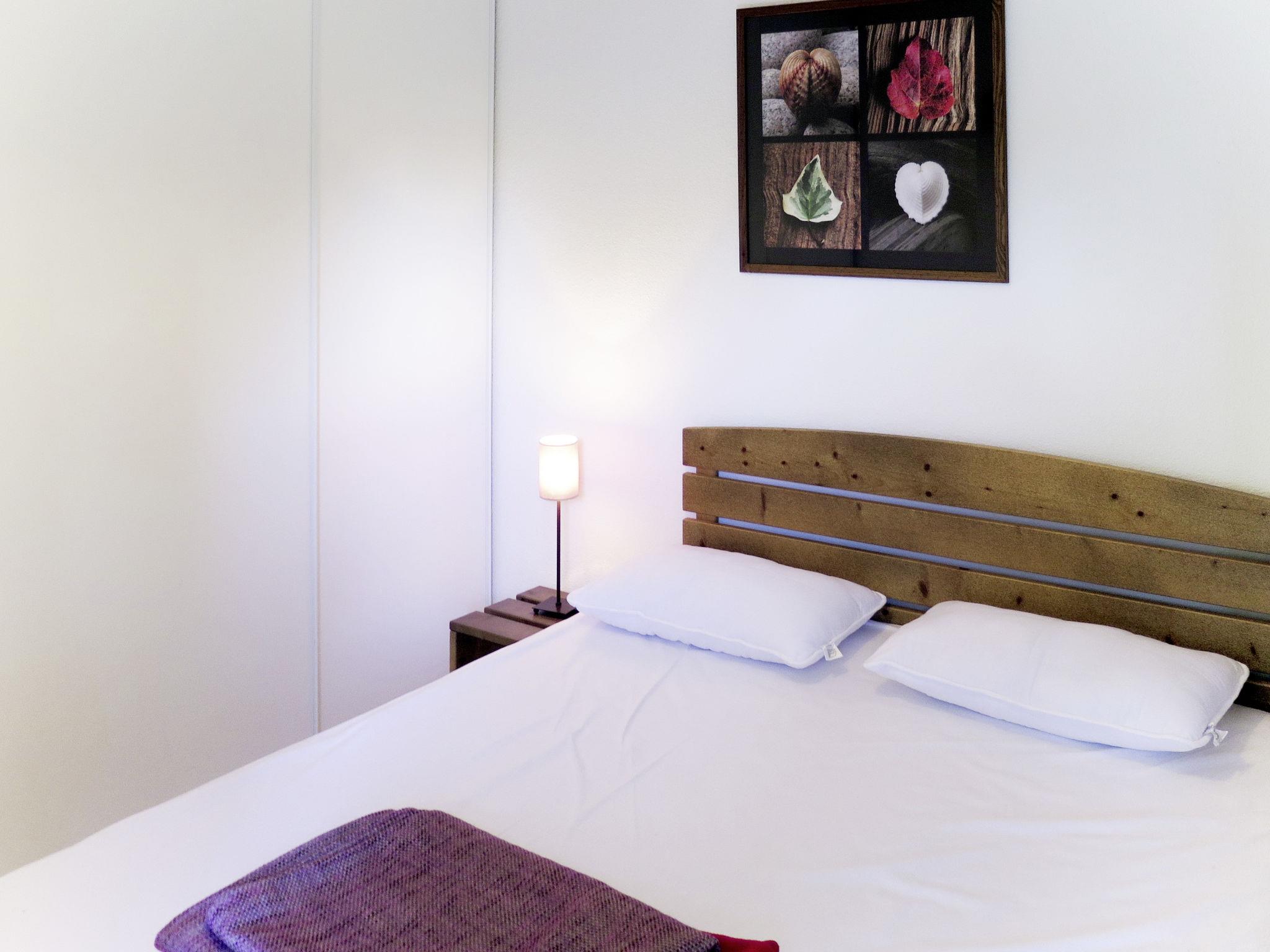 "Les Terrasses du Lac", 2-room apartment 37 m2. Beautiful furnishings: living/sleeping room with 1 double sofabed, dining table and TV. Exit to the balcony, to the terrace. 1 room with 1 french bed. Entrance hall with 1 x 2 bunk beds. Kitchenette (dishwasher, 4 ceramic glass hob hotplates, electric coffee machine, combination microwave). Bath/WC. Electric heating. Balcony or terrace. Terrace furniture, balcony furniture. Facilities: children's high chair, baby cot (extra). Internet (WiFi, extra). Parking (1 car). Please note: non-smokers only. Maximum 2 pets/ dogs allowed. Smoke alarm, fire extinguisher.