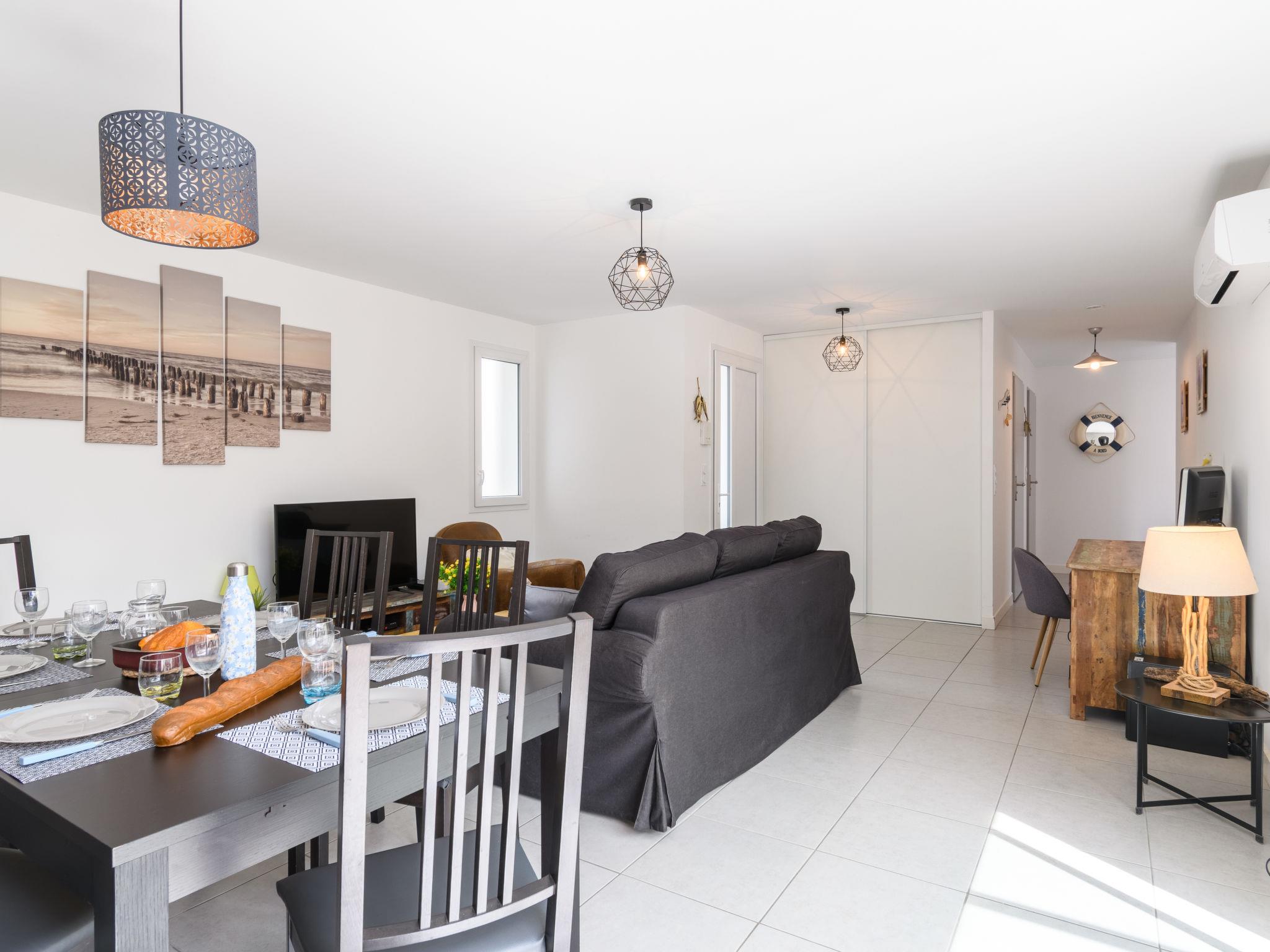 3-room apartment 73 m2, on the ground floor. Practical and modern furnishings: living/dining room with panoramic window with 1 sofabed (160 cm, length 200 cm), TV (flat screen), air conditioning and forced-air heating. Exit to the terrace. 1 room with 1 double bed (140 cm, length 190 cm). Exit to the terrace. 1 room with 2 beds (90 cm, length 190 cm). Exit to the terrace. Kitchenette (oven, dishwasher, 4 induction hot plates, microwave, electric coffee machine, Capsules for coffee machine (Nespresso + filtre) extra). Shower, sep. WC. Large terrace 36 m2. Terrace furniture, barbecue. Facilities: washing machine, hair dryer. Internet (WiFi, free). Parking. Please note: maximum 1 pet/ dog allowed. Smoke alarm.
