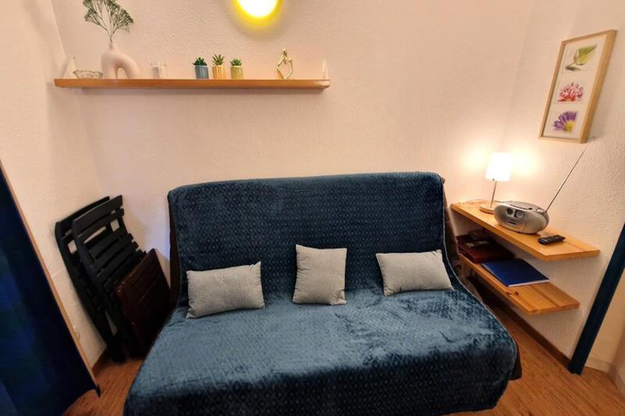 Forestil dig at vågne op i et hyggeligt alpint studie, perfekt beliggende i hjertet af feriestedet, med pisterne og skilifterne kun få skridt væk. Dette charmerende tilflugtssted tilbyder en plads på første række til alt, hvad der sker, men samtidig en rolig tilflugtssted med sin balkon med udsigt over den maleriske Shepherds' Square. Uanset om du er her for spændende vintersport eller bjergenes fredfyldte skønhed, er denne bolig din indgang til uforglemmelige alpine eventyr. Studiet, der er omhyggeligt designet til op til tre gæster, har en komfortabel opholdsstue med en dobbelt sovesofa, en Murphy-seng gemt væk i entréen for ekstra privatliv og et veludstyret tekøkken med alle de nødvendige faciliteter, herunder kogeplader, køleskab, mikrobølgeovn og kaffemaskine. Efter en dag på pisterne kan du slappe af med et varmt bad i det private badeværelse eller slappe af med dit yndlingsprogram på tv'et. Balkonen inviterer dig til at nyde den friske bjergluft og den naturskønne udsigt, hvilket gør det til det perfekte sted at starte eller afslutte din dag. Dette studie er bekvemt placeret i Thabor-residensen og tilbyder nem adgang til butikker, restauranter og afterski-aktiviteter, hvilket sikrer, at alt, hvad du behøver, er inden for rækkevidde. Et skirum i stueetagen gør det endnu mere bekvemt, så du nemt kan opbevare dit udstyr. Uanset om I er et par, der søger en romantisk ferie, eller en lille gruppe venner, der leder efter en hyggelig base, kombinerer dette studie komfort, praktisk anvendelighed og en uovertruffen beliggenhed. Omfavn bjergenes magi og skab varige minder i dette charmerende alpine tilflugtssted.