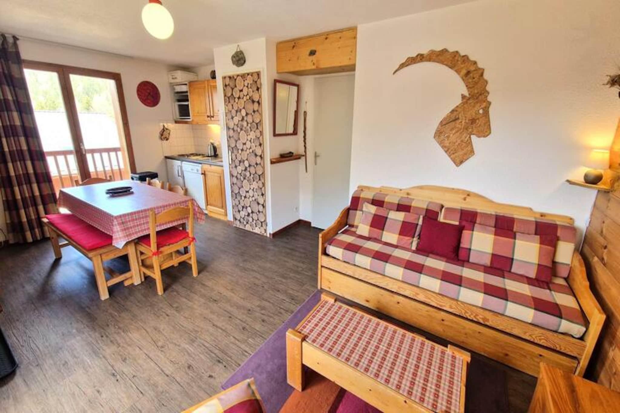 Højt oppe i de fredfyldte franske alper, hvor Vanoise-massivet strækker sig majestætisk over horisonten, tilbyder denne charmerende lejlighed et hyggeligt tilflugtssted for bjergelskere. Kun 100 meter fra Charmasson-pisten og en kort gåtur på 500 meter til hjertet af Valfréjus, finder du dig selv perfekt placeret til at nyde både spændende alpine eventyr og den indbydende atmosfære i dette maleriske feriested. Uanset om du er her for vintersport eller sommervandreture, lover de betagende omgivelser uforglemmelige øjeblikke. \n\nDenne lejlighed på 36 m² er designet til op til seks gæster og kombinerer komfort og praktisk anvendelighed. Stuen har en dobbelt udtræksseng og et tv, hvilket skaber et afslappende rum at slappe af efter en dag på pisterne. To soveværelser - et med en dobbeltseng og et andet med køjesenge - sikrer afslappende nætter for alle. Tekøkkenet er udstyret med fire kogeplader, køleskab, opvaskemaskine og mikrobølgeovn, hvilket gør det nemt at tilberede måltider. Et separat badeværelse og toilet tilføjer bekvemmelighed, mens den uafhængige hjørnebalkon giver et privat sted at nyde den fantastiske udsigt over Vanoise-massivet. \n\nSelve residensen består af charmerende hytter, der hver rummer en håndfuld lejligheder. Nærheden til Charmasson-pisten betyder, at du kan stå på ski inden for få minutter, mens feriestedets centrum tilbyder butikker, skiskoler og kabelbanens afgangssted for at udforske længere væk. Om sommeren forvandles regionen til et paradis for vandrere og naturentusiaster, med stier, der snor sig gennem frodige alpine enge og dramatiske tinder. \n\nUanset om du søger adrenalinfyldte dage på pisterne eller rolige aftener omgivet af natur, er denne lejlighed din indgang til det bedste af Valfréjus. Lad skønheden i Vanoise-massivet inspirere din næste alpine udflugt.