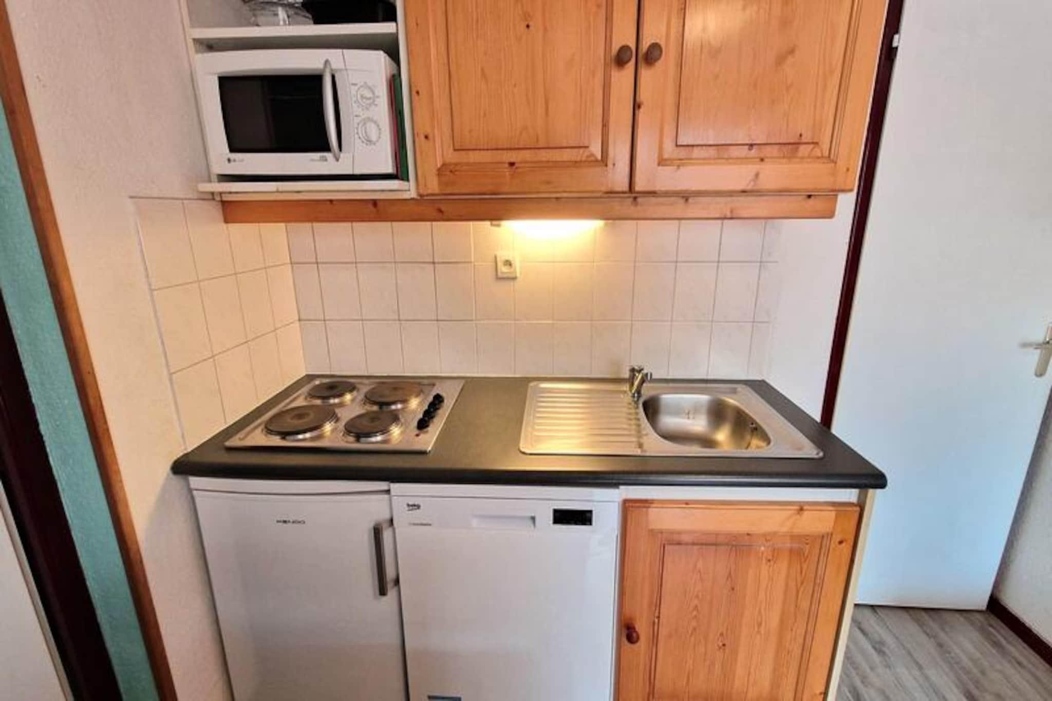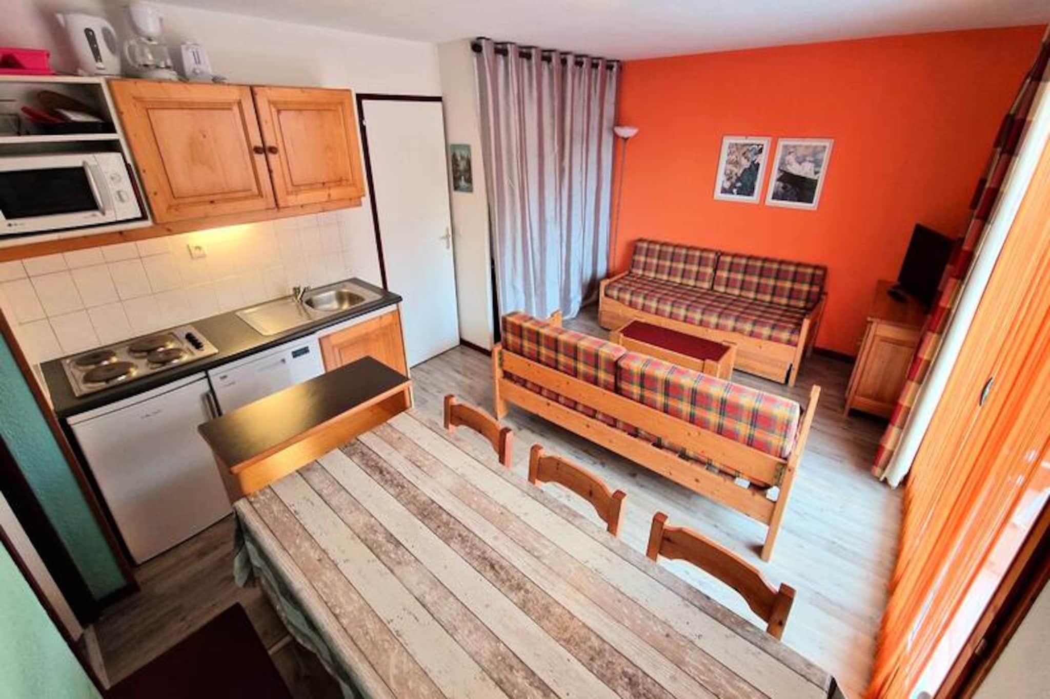 Midt i den pulserende energi i Les Arcs 1800 tilbyder denne charmerende alpelejlighed et hyggeligt tilflugtssted for op til otte gæster. Perfekt beliggende i hjertet af feriestedet, kun få skridt fra pisterne, skilifterne og en række lokale faciliteter. Uanset om du søger spændende dage på Paradiski-pisterne eller afslappende aftener omgivet af bjergudsigt, sikrer denne bolig et mindeværdigt ophold i de franske alper. Den østvendte balkon inviterer dig til at starte dine morgener med betagende udsigter og frisk alpeluft, der sætter tonen for et uforglemmeligt eventyr. \n\nIndenfor kan lejligheden prale af en gennemtænkt planløsning designet til komfort og bekvemmelighed. Stuen har en udtræksseng til to personer, mens hytten tilbyder køjesenge med plads til fire gæster. Et separat soveværelse med en dobbeltseng giver privatliv og afslapning. Tekøkkenet er udstyret med moderne apparater, herunder køleskab, mikrobølgeovn, opvaskemaskine og fire kogeplader, hvilket gør madlavning til en leg. To badeværelser - et med badekar og toilet og et andet med bruser - sammen med et separat toilet sikrer rigelige faciliteter for alle. Et skirum i stueetagen bidrager til det praktiske, mens ikke-rygerpolitikken garanterer et friskt og indbydende miljø. \n\nUd over lejligheden tilbyder resortet et væld af aktiviteter og attraktioner. Fra skiskoler og udlejningsbutikker til charmerende restauranter og afterski-muligheder er alt hvad du behøver inden for rækkevidde. Om sommeren forvandles regionen til et paradis for vandrere og cyklister med stier, der fører til fantastiske udsigter og skjulte perler. Den nærliggende Tarentaise-dal og Aiguille Rouge giver uendelige muligheder for udforskning og eventyr. \n\nUanset om du besøger stedet for vintersport eller sommerferier, er denne bolig din indgang til det bedste af Les Arcs 1800. Skab varige minder i omgivelser, der kombinerer alpin charme med moderne komfort.