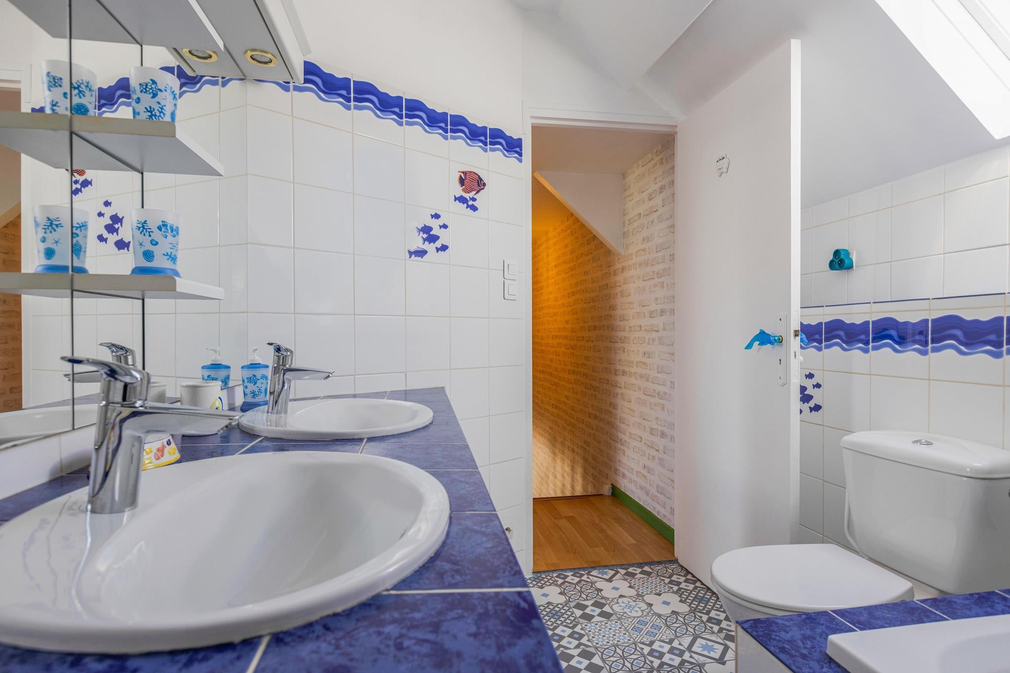 Stueetage: (Køkken(komfur, emhætte, kaffemaskine, ovn, mikrobølgeovn, køle-fryseskab, barnestol), stue / spisestue(dobbeltsovesofa, Fjernsyn(fladskærm, Smart-TV), spisebord, pejs, sofahjørne, trådløst musiksystem), veranda(spisebord), toilet) På 1. etage: (soveværelse(dobbeltseng), soveværelse(dobbeltseng), soveværelse(dobbeltfeltseng, tremmeseng), badeværelse(badekar, bruser, håndvask, håndvask), toilet) terrasse, have, grill, parkering, petanquebane, luft til luft-varmepumpe