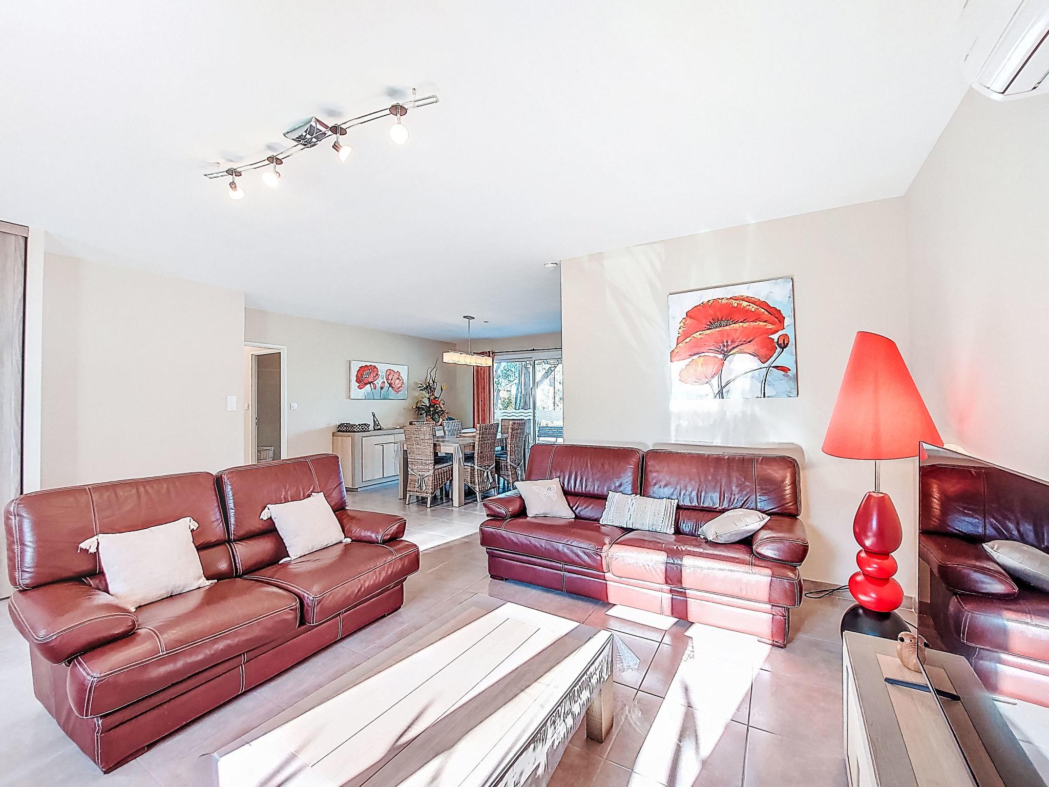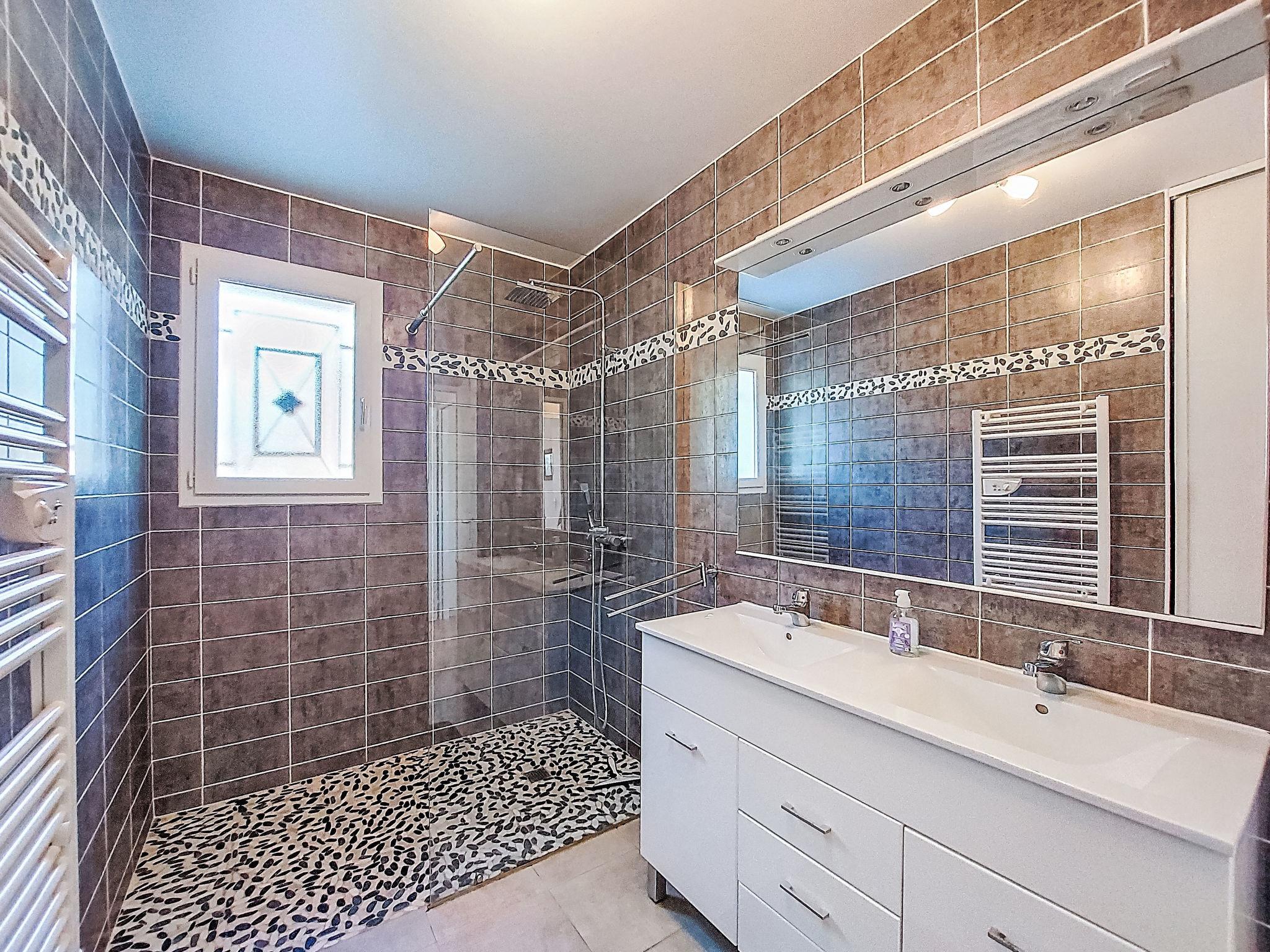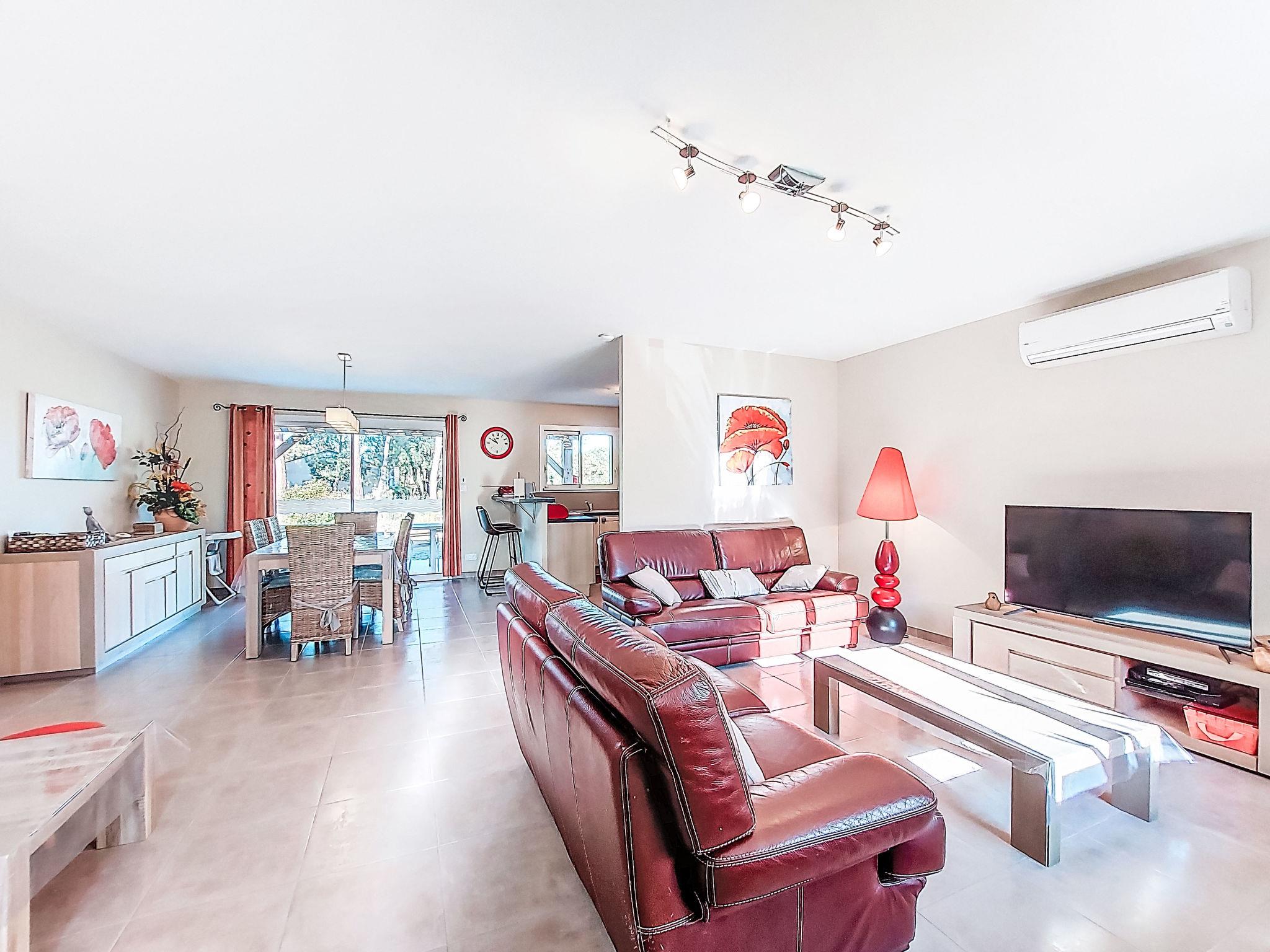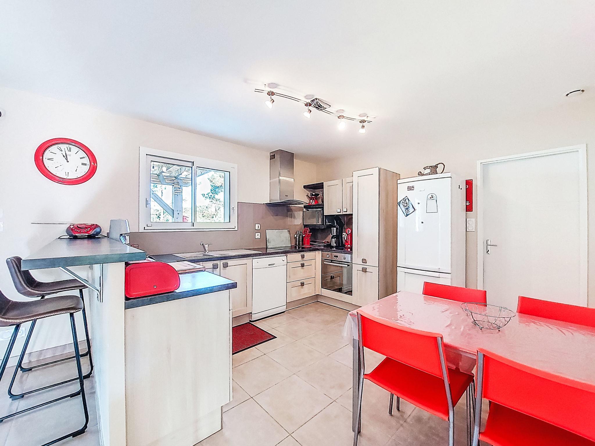"Les Ormes", 4-room house 110 m2. Bright, comfortable furnishings: living/dining room with dining table and satellite TV (flat screen), radio, CD-player and DVD. Exit to the terrace. 2 rooms, each room with 1 french bed (140 cm, length 190 cm). 1 room with 1 x 1 bunk beds (90 cm, length 190 cm), 1 french bed (140 cm, length 190 cm). Open kitchen (oven, dishwasher, 3 induction hot plates, toaster, kettle, microwave, freezer, electric coffee machine, Capsules for coffee machine (Senséo) extra) with bar. Shower, sep. WC, double hand-basin. Electric heating, air-conditioning. Terrace. Terrace furniture, barbecue, deck chairs (6), box-room. Facilities: washing machine, dryer, iron, children's high chair, baby cot. Internet (WiFi, free). Please note: non-smoking house. Maximum 1 pet/ dog allowed. Smoke alarm.