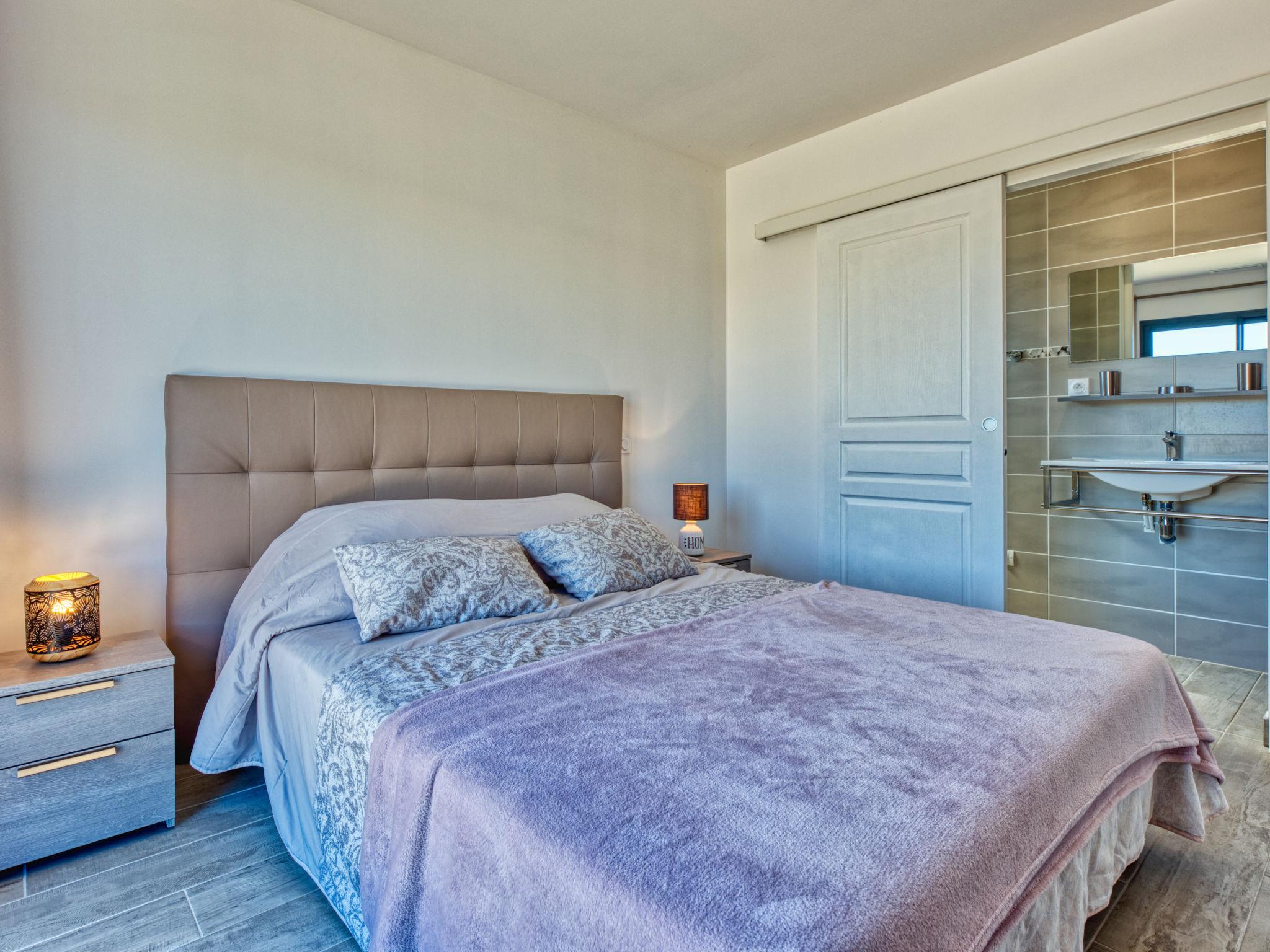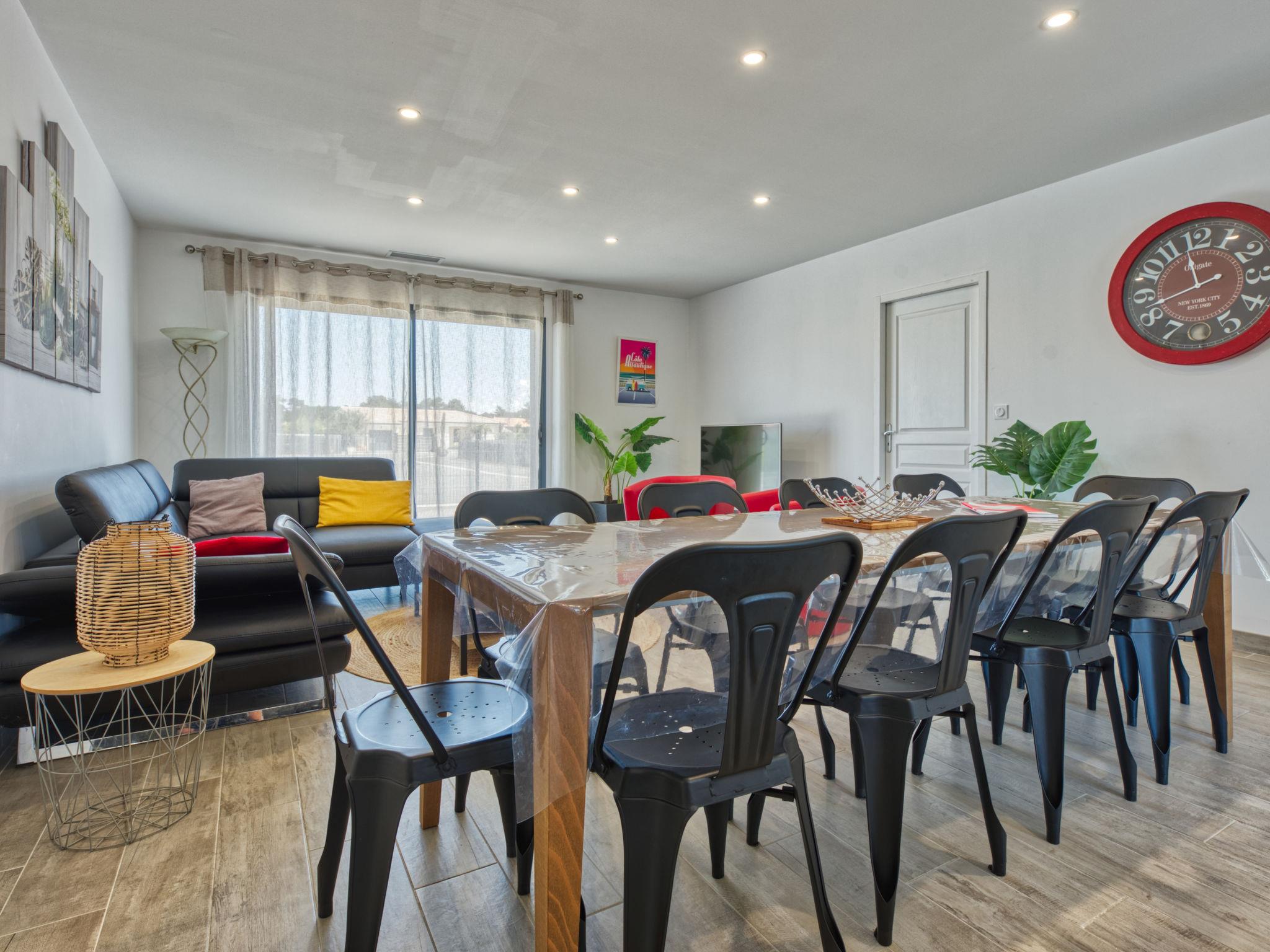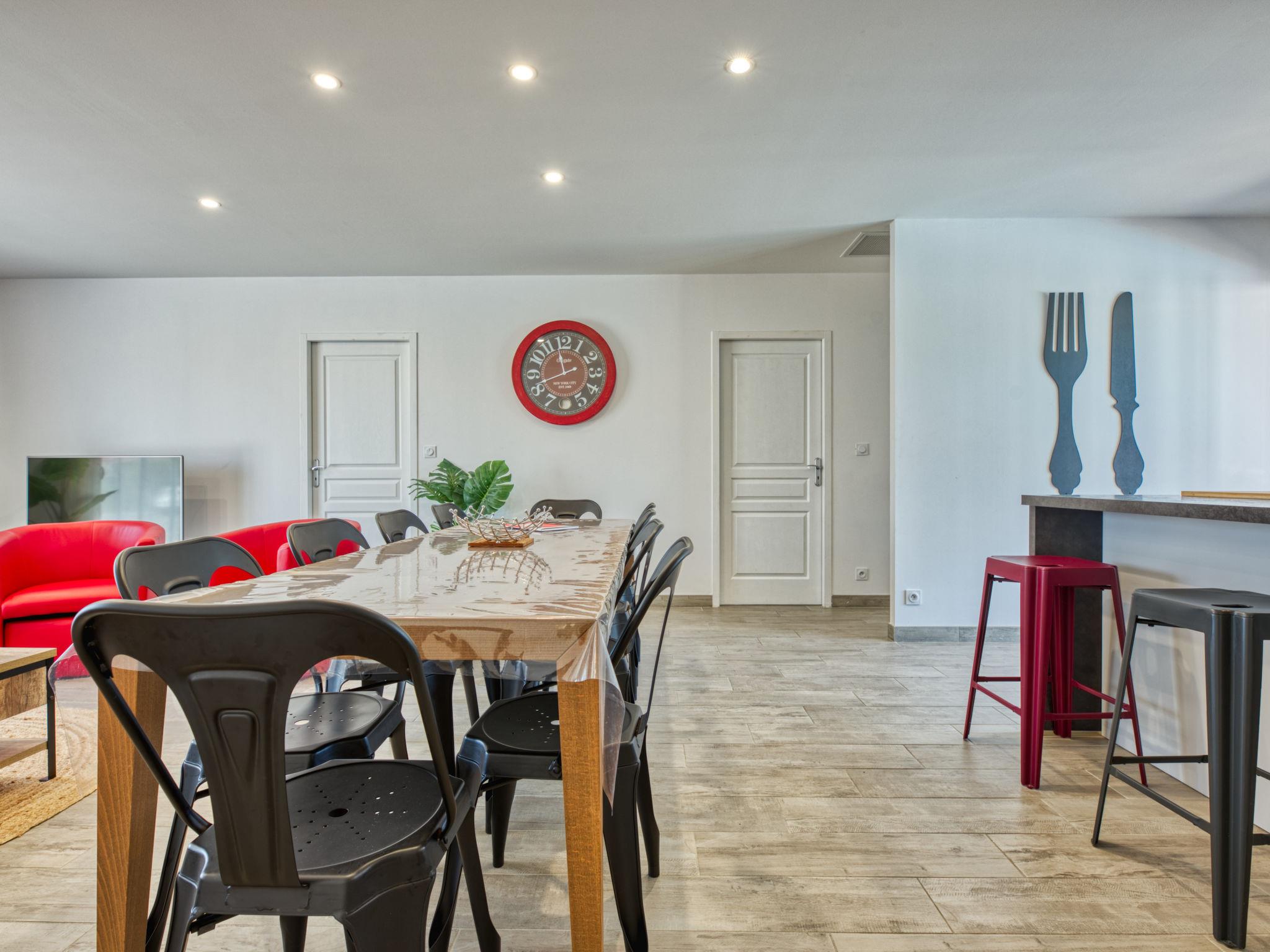 "Les Alyzés", 6-room villa 150 m2. Object suitable for 8 adults + 4 children. Bright, modern and stylish furnishings: large living/dining room with panoramic window with dining table and satellite TV (flat screen). Exit to the terrace. 4 rooms, each room with 1 french bed (160 cm, length 200 cm), shower/WC. Exit to the garden. 1 children's room with 2 x 2 bunk beds (90 cm, length 190 cm), shower/WC. Exit to the garden. Large, open kitchen (oven, dishwasher, 3 induction hot plates, toaster, kettle, microwave, freezer, electric coffee machine, Capsules for coffee machine (Senseo) extra, cooking island). Exit to the terrace. Sep. WC. Electric heating, air-conditioning. Large terrace partly roofed. Terrace furniture, barbecue (portable), deck chairs (6), box-room. Facilities: washing machine, iron, children's high chair, baby cot (extra). Internet (WiFi, free). Please note: suitable for families. Non-smoking house. Smoke alarm.