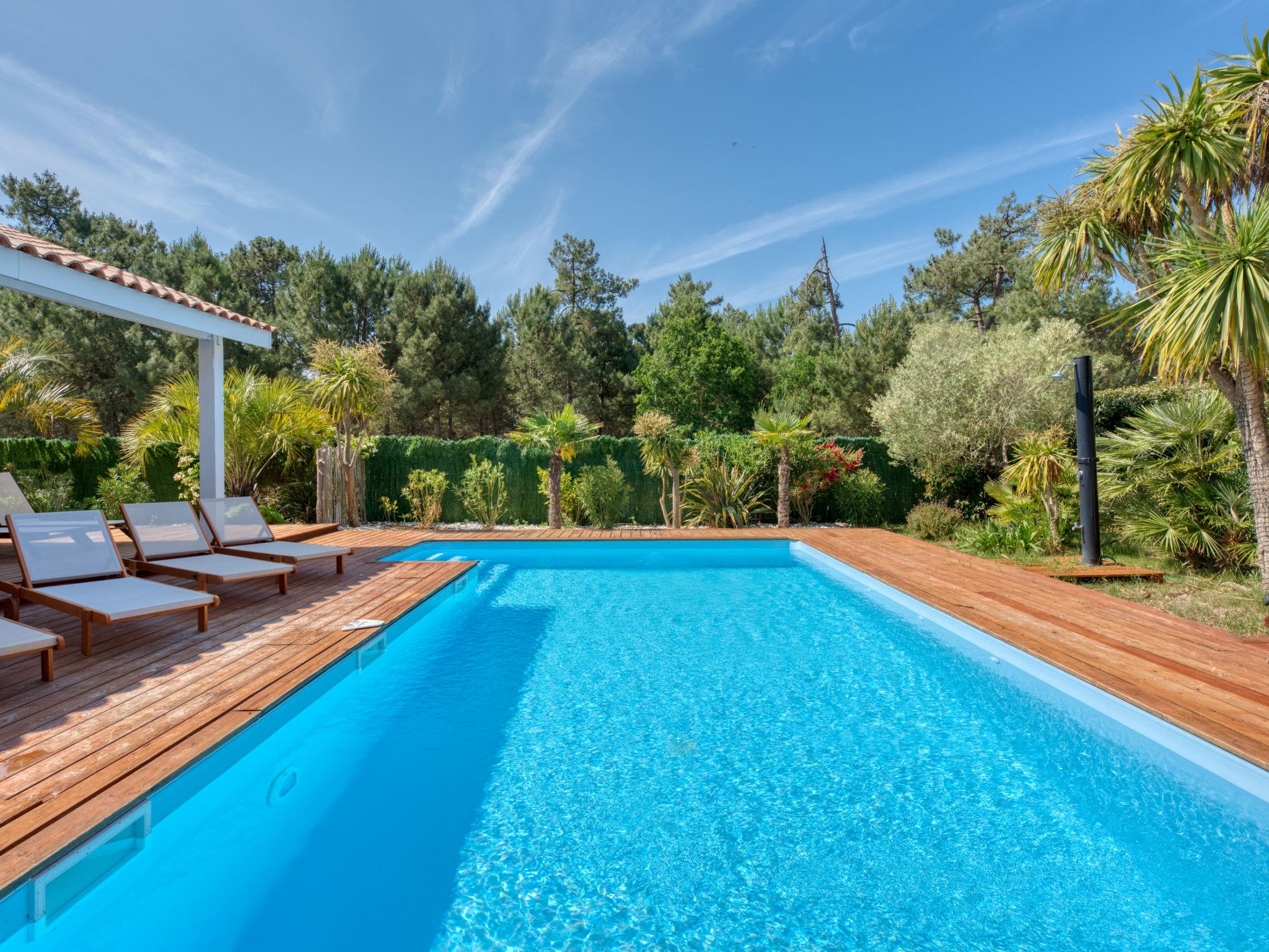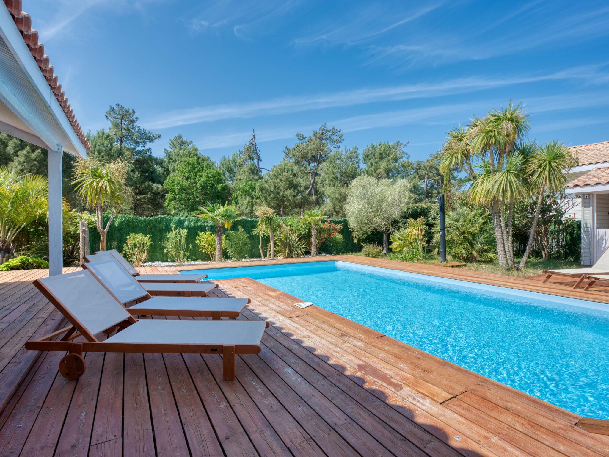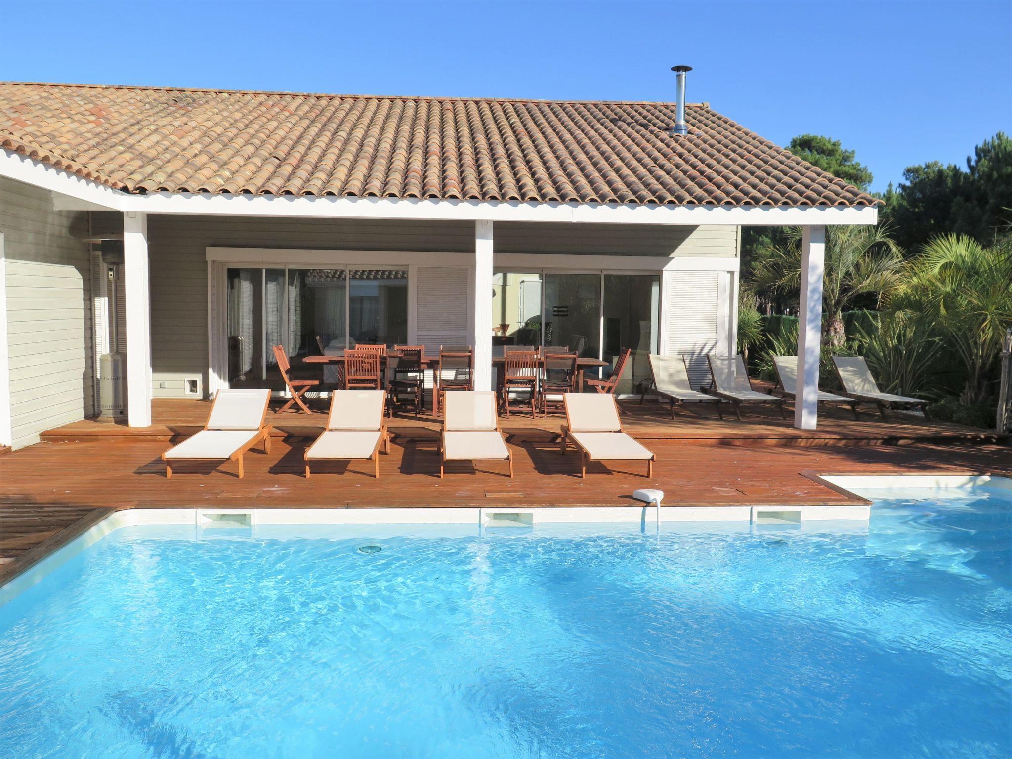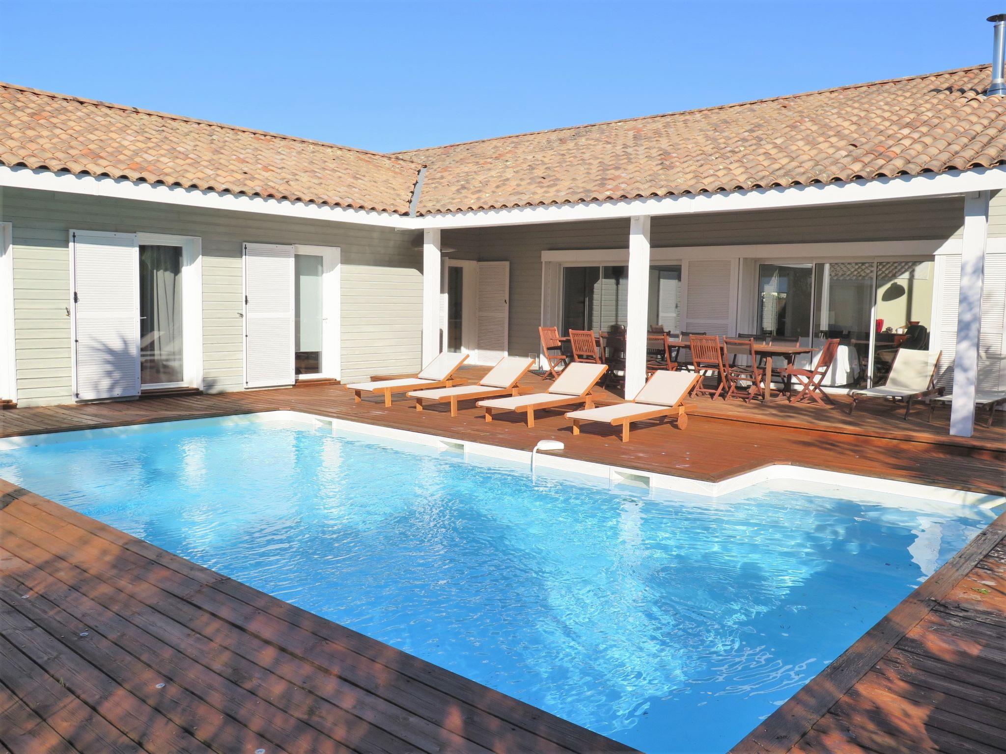 Modern, beautiful, comfortable villa "Jusant". In the district of Vensac-Océan 1.5 km from the centre of Montalivet, 9 km from the centre of Vendays, 85 km from the centre of Bordeaux, in the residential district, 800 m from the sea. Private: property 900 m2 (fenced), well-kept garden, swimming pool angular, heated (8 x 4 m, depth 170 cm, seasonal availability: 01.May. - 31.Oct.) with shutter cover and salt-electrolysis pool-cleaning system. Outdoor shower, table tennis, terrace, parking (for 2 cars) at the house on the premises, public parking on the road. Shop 1.5 km, supermarket 2.5 km, restaurant 1.5 km, bus stop "Av. De l'Europe/Montalivet" 1.5 km, sandy beach "Vensac-Océan" 1 km. Cycle lane 10 m. Nearby attractions: Accrobranche, paintball, karting, surf. The owner does not accept any groups. Neighbourhood highly sensitive to noise. Quietness and good behaviour expected.