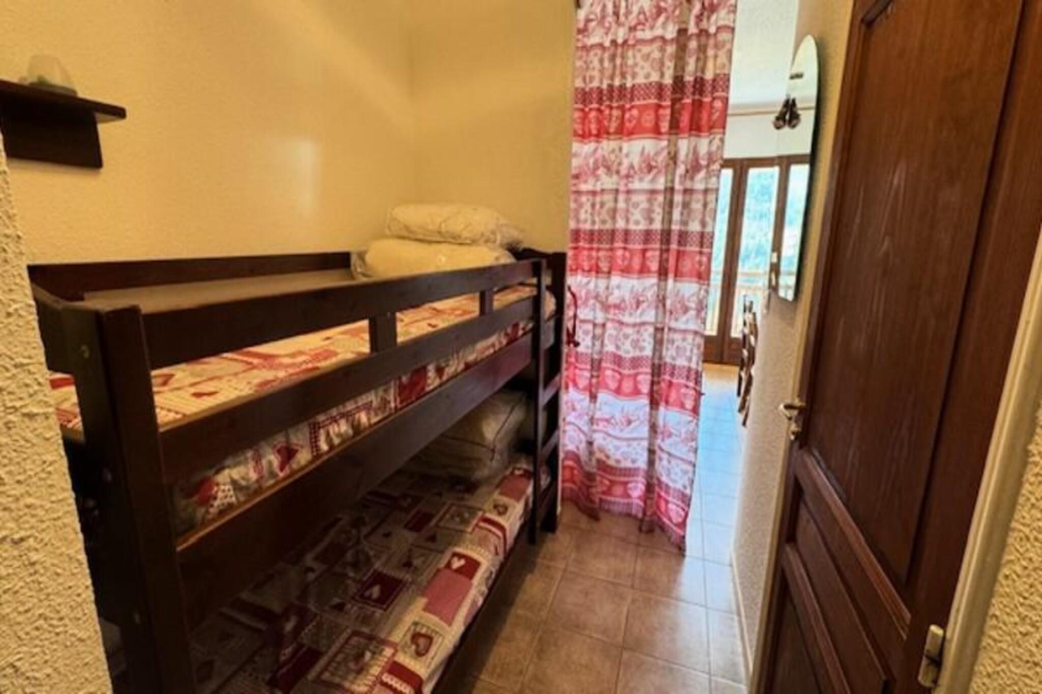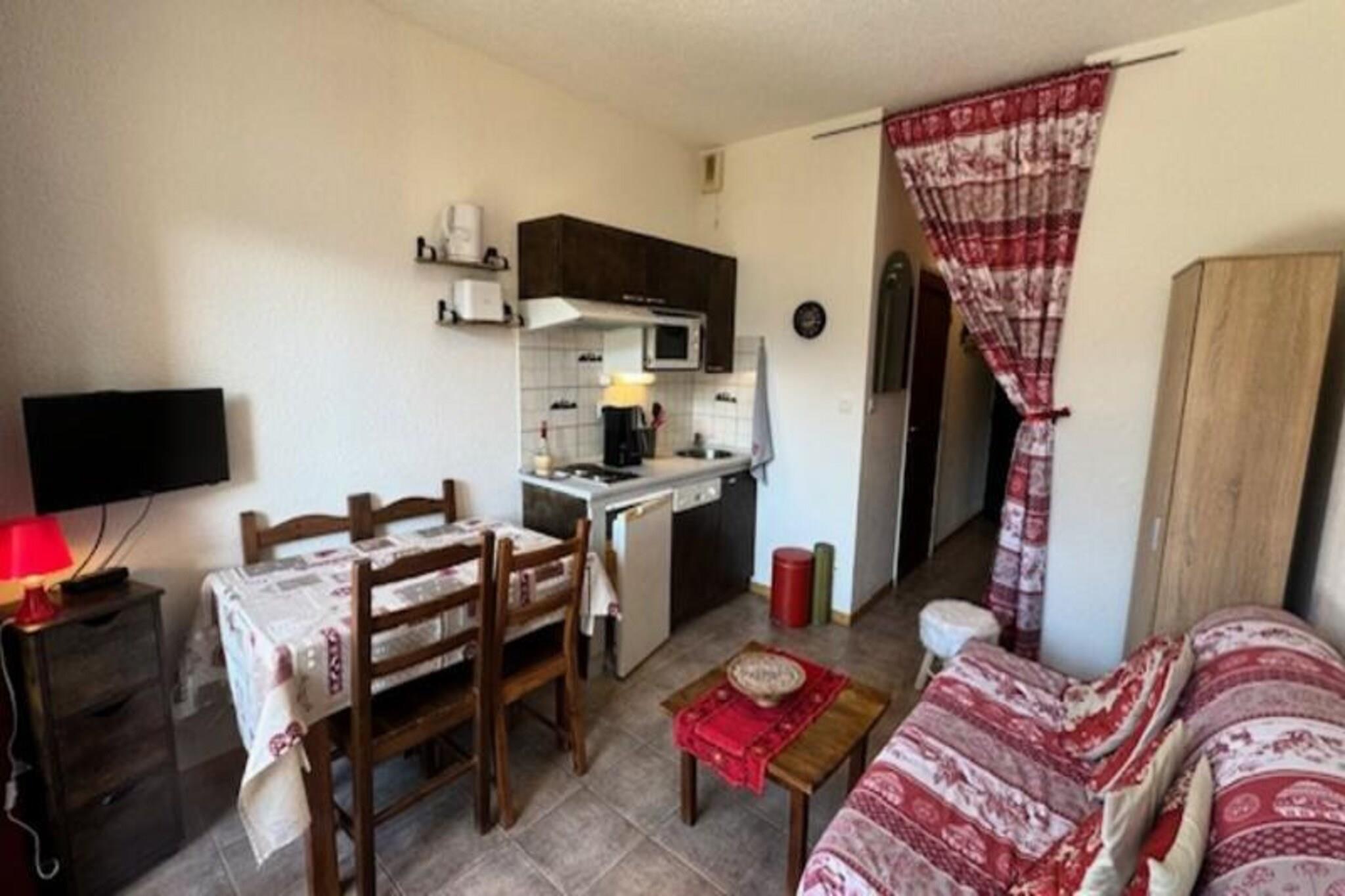 This cozy studio apartment for up to 4 people offers a comfortable stay with a convertible sofa and a mountain corner with bunk beds. The apartment is pet-friendly and located on the first floor, facing south with a stunning view of the surrounding mountains. The space includes essential amenities such as a wardrobe, cupboard, and clothes hooks for storage. A large parking lot is available for residents, and the property is non-smoking throughout. Conveniently located, the apartment provides easy access to local attractions, including the ESF & Club Piou Piou ski schools and slopes, just 800 meters away. A free ski bus service is available from the residence, offering easy transport to the slopes and the nearby Durancia Nuxe Aquatic Center and Spa, 1.5 km away. Additional amenities like a pharmacy, bus station, and various shops and restaurants are located within an 800-meter radius, ensuring everything you need is close by. The apartment features a well-equipped kitchen with two ceramic hobs, a microwave, refrigerator, dishwasher, and a coffee maker. The bathroom includes a shower cabin, WC, sink, bidet, and towel rack. A private balcony with a drying rack, small table, and chairs offers a peaceful spot to enjoy the fresh air. Services such as Wi-Fi, ski passes, and baby equipment can be arranged for an added convenience during your stay.