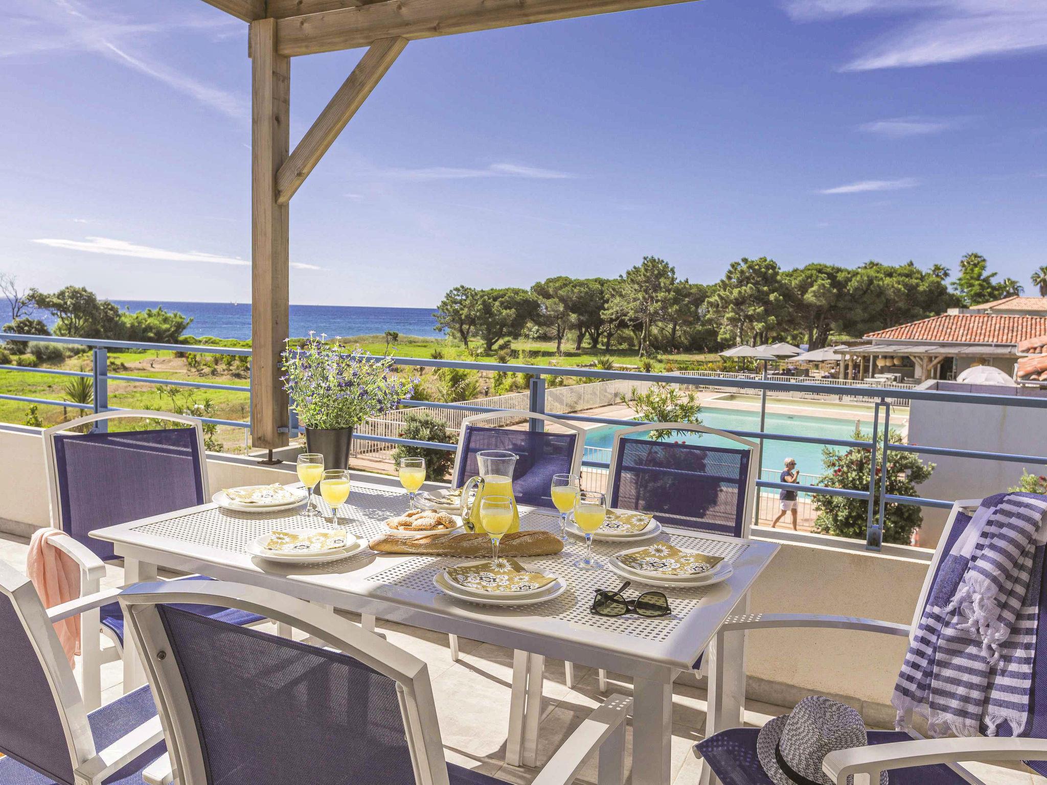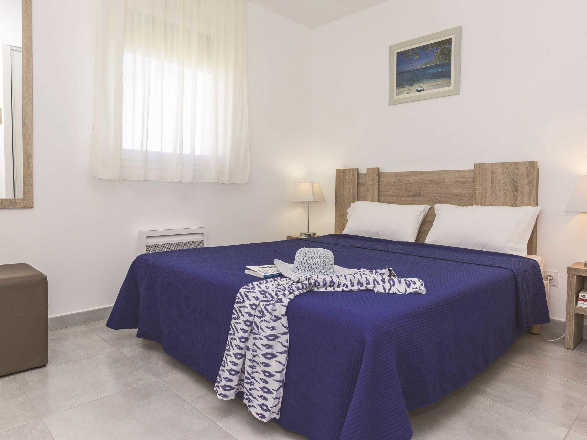 "Résidence Odalys Référence Acqua Bella", 2-room apartment 31 to 34 m2. Bright, modern furnishings: living/sleeping room with 1 pull-out bed (2 pers.), dining table, TV can be hired and air conditioning. Exit to the terrace. Open gallery with 1 double bed. Kitchenette (dishwasher, 2 ceramic glass hob hotplates, microwave, freezer, electric coffee machine). Bath/WC or shower/WC. Electric heating. Balcony or terrace. Balcony furniture. Facilities: children's high chair, baby cot (extra). Parking (1 car). Please note: non-smokers only. Smoke alarm, fire extinguisher. Instead of an enclosed bedroom, some sleeping areas are located in an open-plan area (gallery, alcove, etc.).