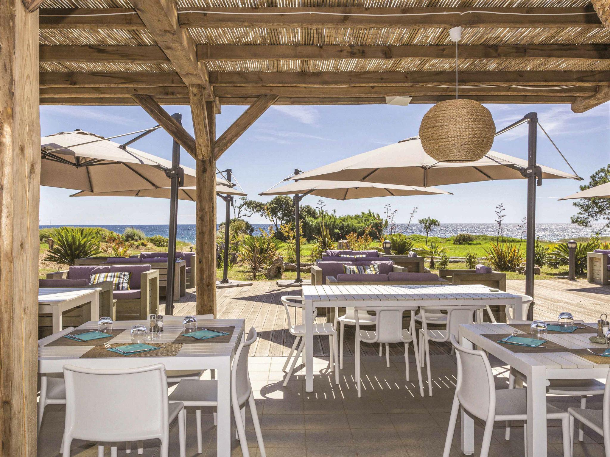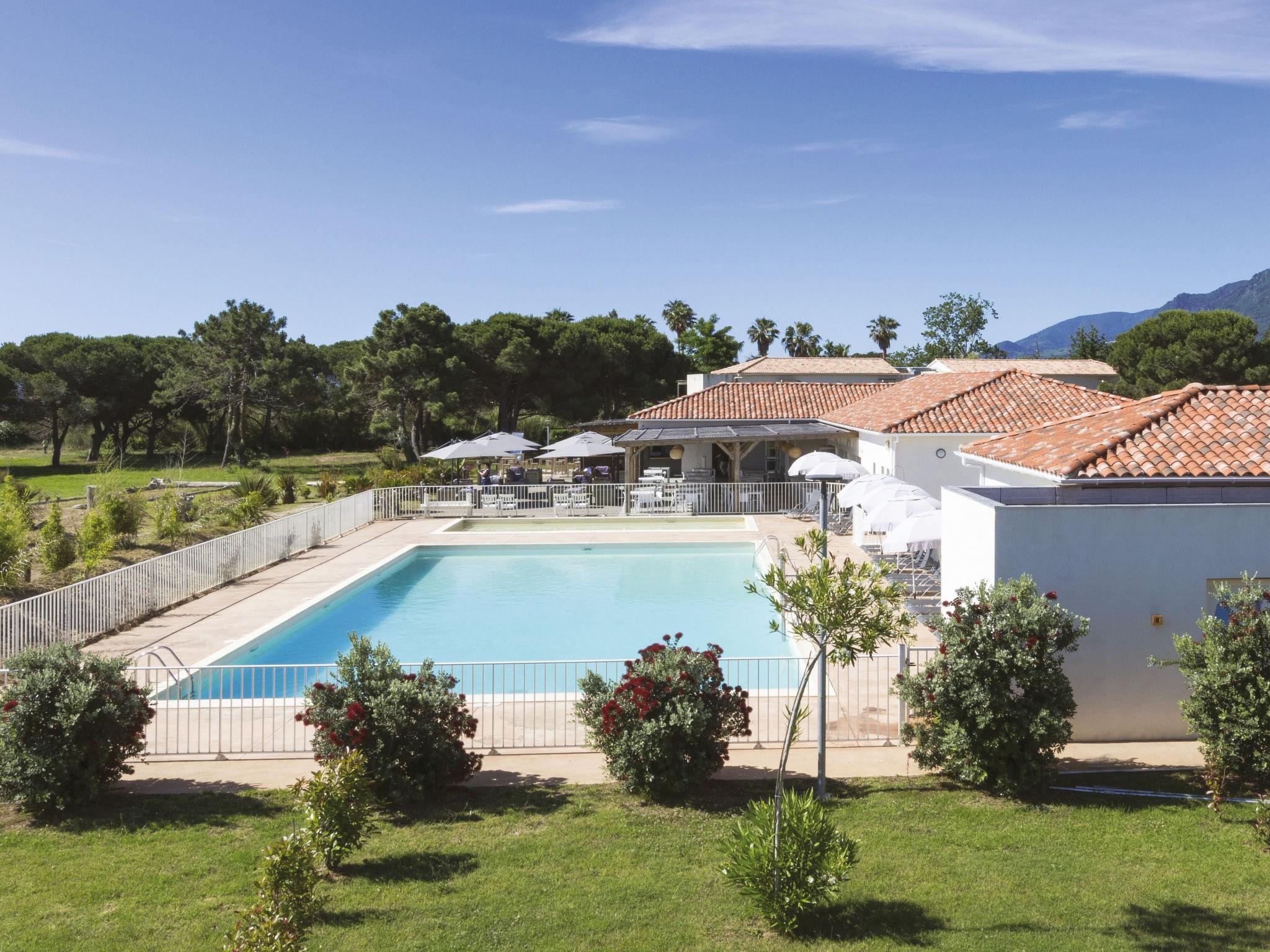 Resort "Acqua Bella/Acqua Linda", 2 storeys. 33 houses in the resort. 273 apartments in the residence. In the hamlet L'Avillanella 3 km from the centre of Moriani-Plage, on the outskirts, 8 km from the centre of Folelli, 38 km from the centre of Bastia, in the residential district, 150 m from the sea, 150 m from the beach, direct access to the beach. For shared use: large garden with lawn and plants, 2 swimming pools fenced (20 x 12 m, seasonal availability: 15.Apr. - 15.Sep.). Children's pool, boccia, children's playground. In the complex: reception, restaurant, WiFi, washing machine (for shared use, extra). Parking. Shop 6.7 km, supermarket 3 km, bus stop "Moriani, Office de Tourisme" 2.5 km, sandy beach 150 m. Golf course 21 km. Nearby attractions: Village pittoresque de Poggio Mezzana, Randonnées, Parapente, Canyoning, Activités nautiques. Please note: the photograph shows a typical example. The holiday properties may differ in living space, floorplan, equipment and furnishing. Wifi available only at the reception.