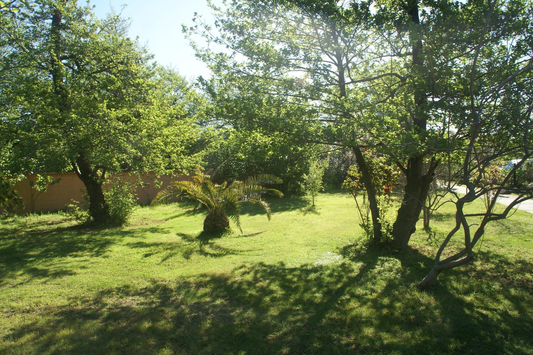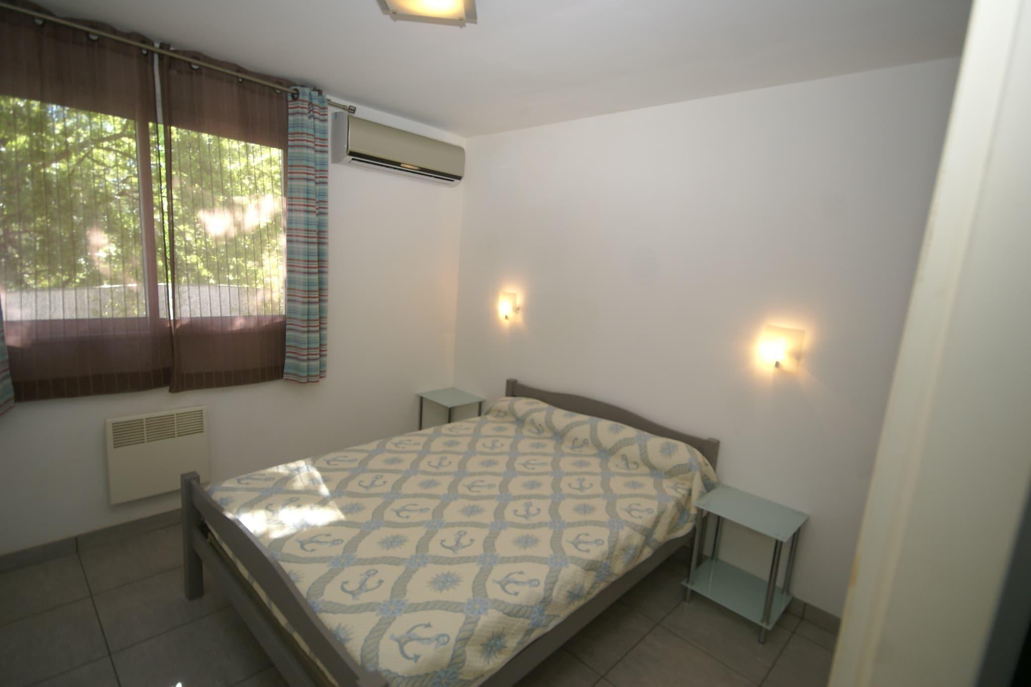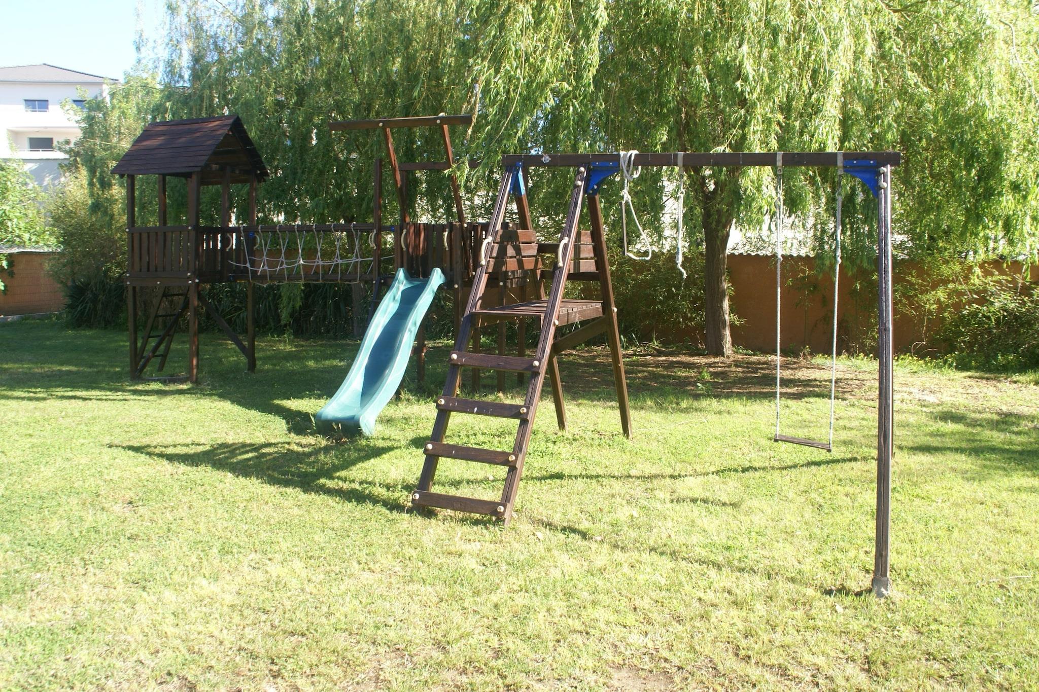 På 1. etage: (entre, Køkken(komfur(Komfur med fire kogeplader), ovn, mikrobølgeovn), stue / spisestue(dobbelt-foldeseng, Fjernsyn, spisebord), soveværelse(dobbeltseng), soveværelse(køjeseng), badeværelse(bruser, håndvask, toilet)) varme, klimaanlæg, have(deles med andre gæster), havemøbler, parkering, swimmingpool(deles med andre gæster, 12 x 7 m., opened from May upto and including Oct), tennisbane, legeredskaber, bordtennisbord