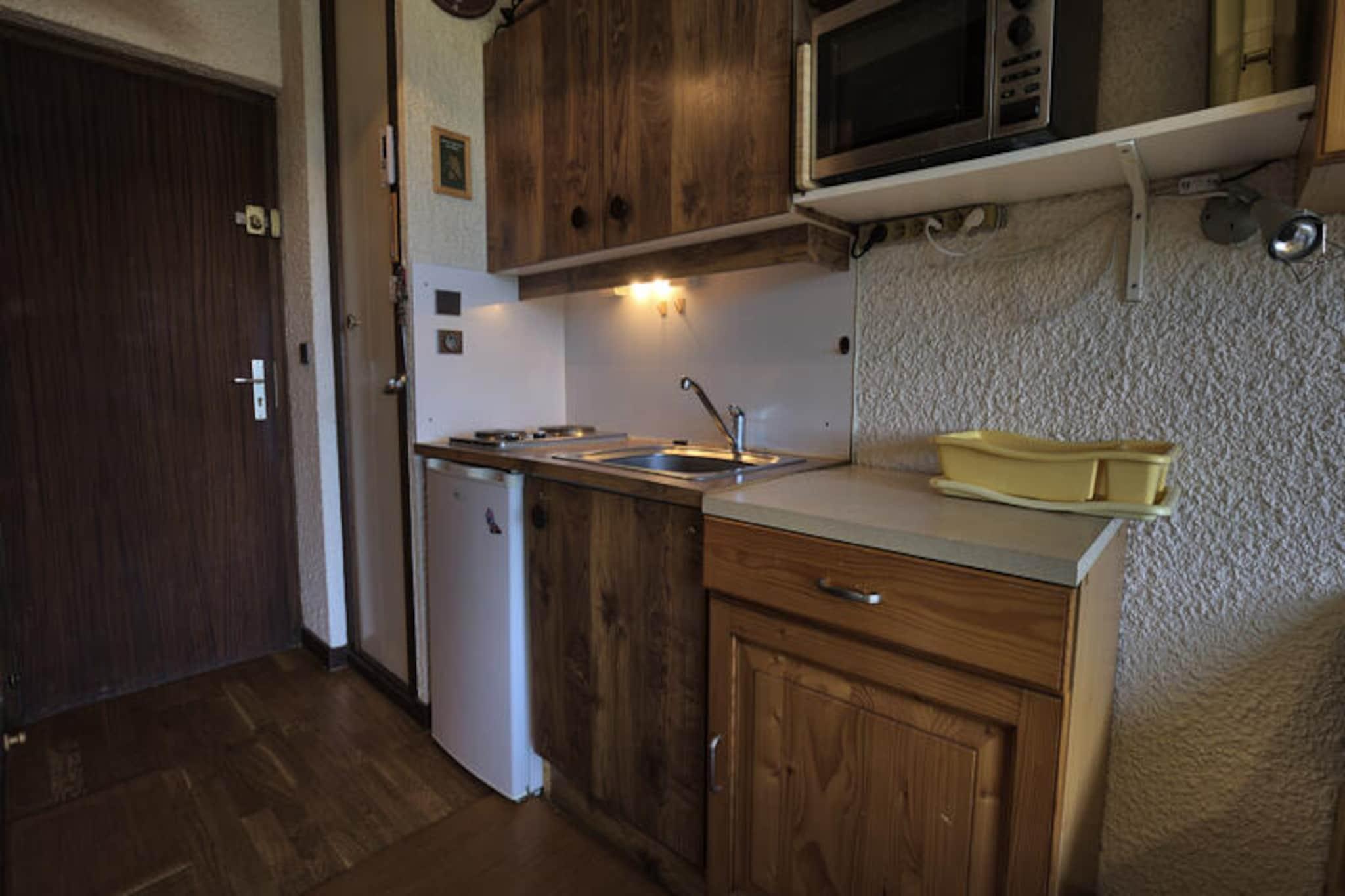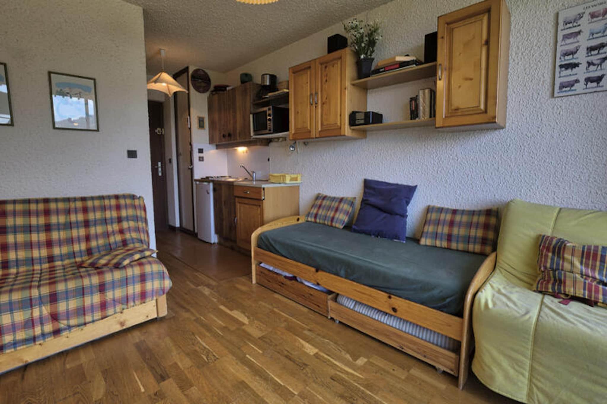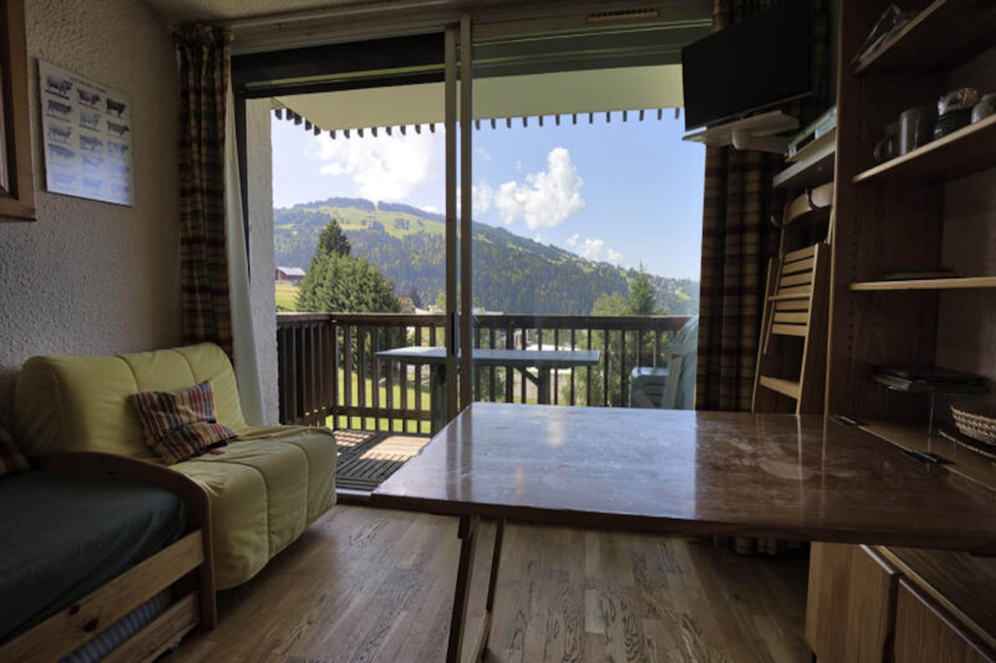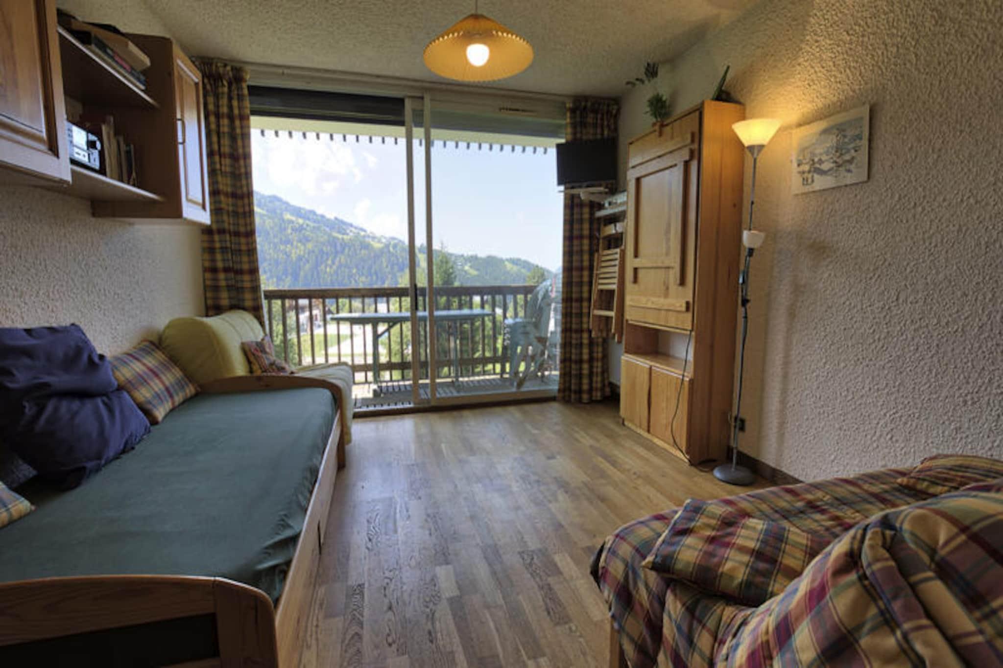 I den maleriske landsby Notre Dame de Bellecombe, omgivet af Alpernes betagende tinder, tilbyder denne hyggelige studiolejlighed en rolig oase for par eller små familier. Fra den sydvendte balkon kan du nyde den uforstyrrede udsigt over Mont Charvin og dalen nedenfor, mens landsbyens charmerende savoyard-atmosfære inviterer dig til at fordybe dig i alpelivet. Uanset om du er dækket af sne eller badet i sommersolen, er denne destination et paradis for både naturelskere og eventyrlystne. Studiolejligheden er omhyggeligt designet til at maksimere komfort og funktionalitet. Stuen har et fjernsyn og alsidige sovepladser, herunder en dobbelt sovesofa, en enkelt sovesofa og en enkelt futon, alt sammen suppleret med hyggelige dyner og tæpper. Det åbne køkken er udstyret med essentielle apparater, hvilket gør det nemt at tilberede måltider efter en dag med udforskning. Et lille badekar på badeværelset tilføjer et strejf af afslapning, mens det store karnapvindue fylder rummet med naturligt lys. Yderligere bekvemmeligheder inkluderer et skiskab, elevatoradgang og ureserveret udendørs parkering. Beliggende ved foden af ??skiområdet Espace Diamant tilbyder residensen uovertruffen adgang til 192 km sammenhængende pister, der henvender sig til både begyndere og erfarne skiløbere. Om sommeren tilbyder den private opvarmede swimmingpool og tennisbanen perfekt afslapning efter vandreture eller mountainbiking på de nærliggende stier. Mont Rond-stoleliften, der er åben tre dage om ugen, tilbyder en fantastisk udsigt over Mont Blanc, mens udflugter til Megève, Chamonix og Annecy kun ligger en kort køretur væk. Med sine idylliske omgivelser, moderne faciliteter og nærhed til aktiviteter året rundt er dette studie et ideelt valg til at skabe uforglemmelige alpine minder.