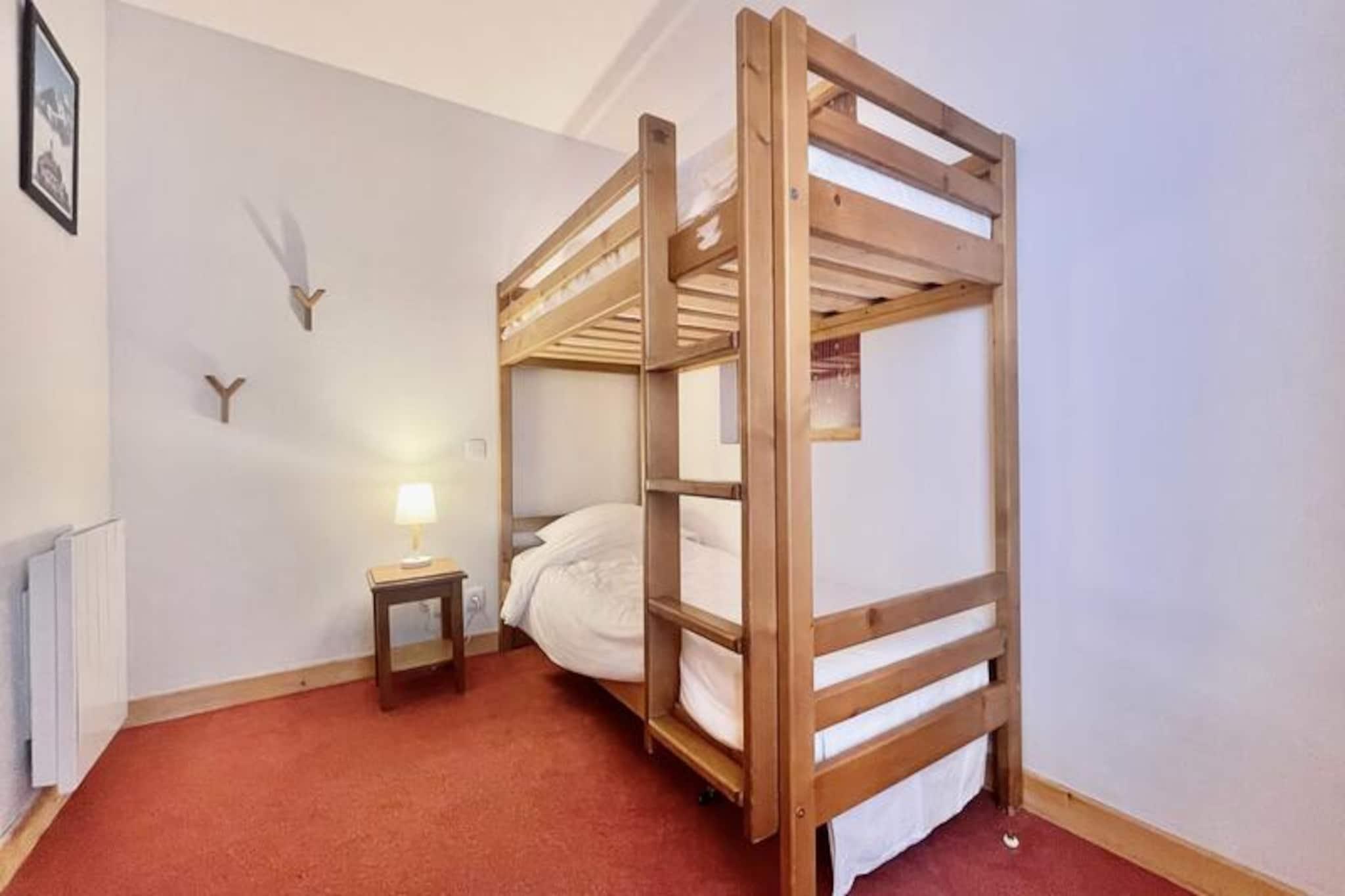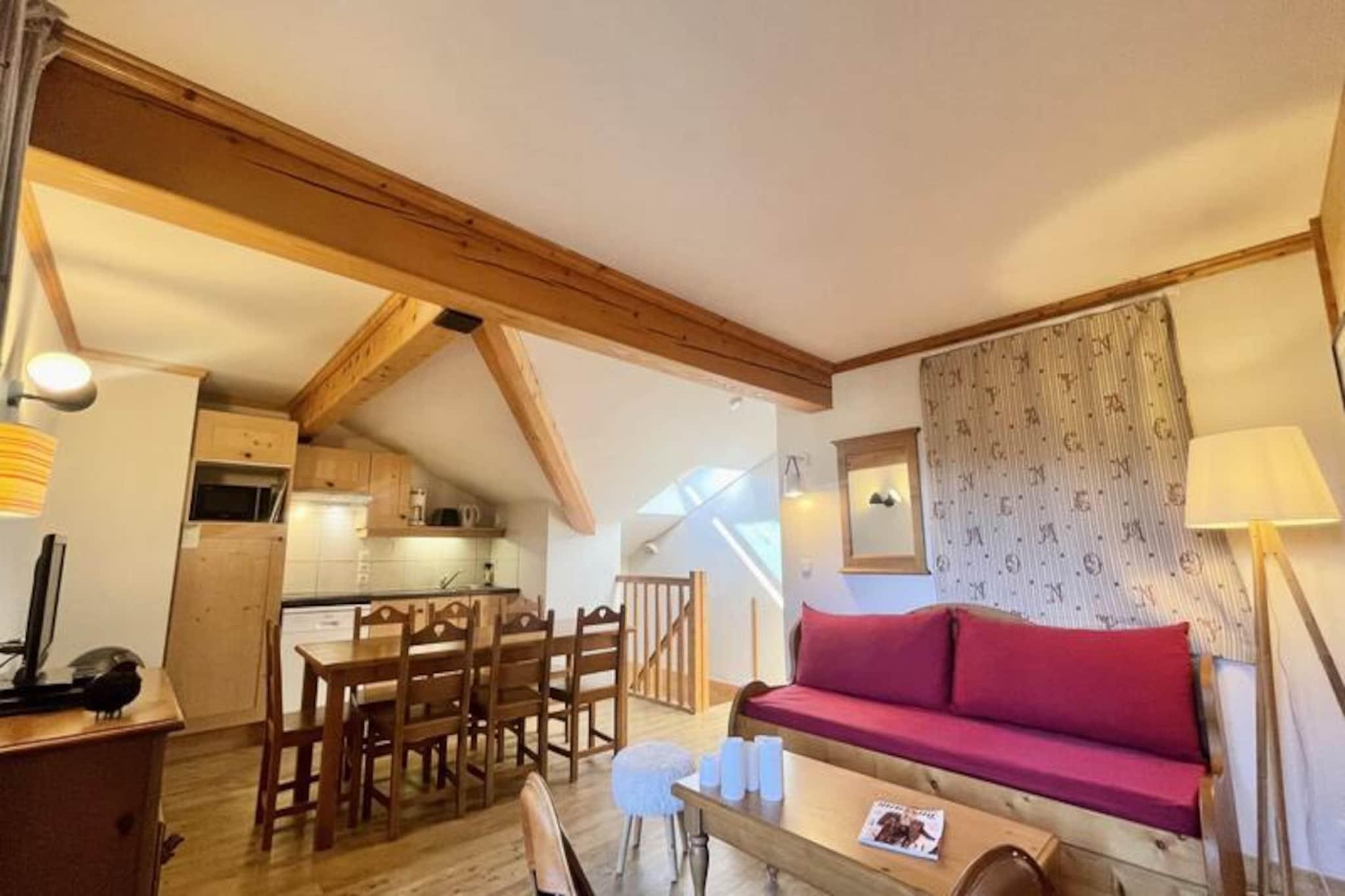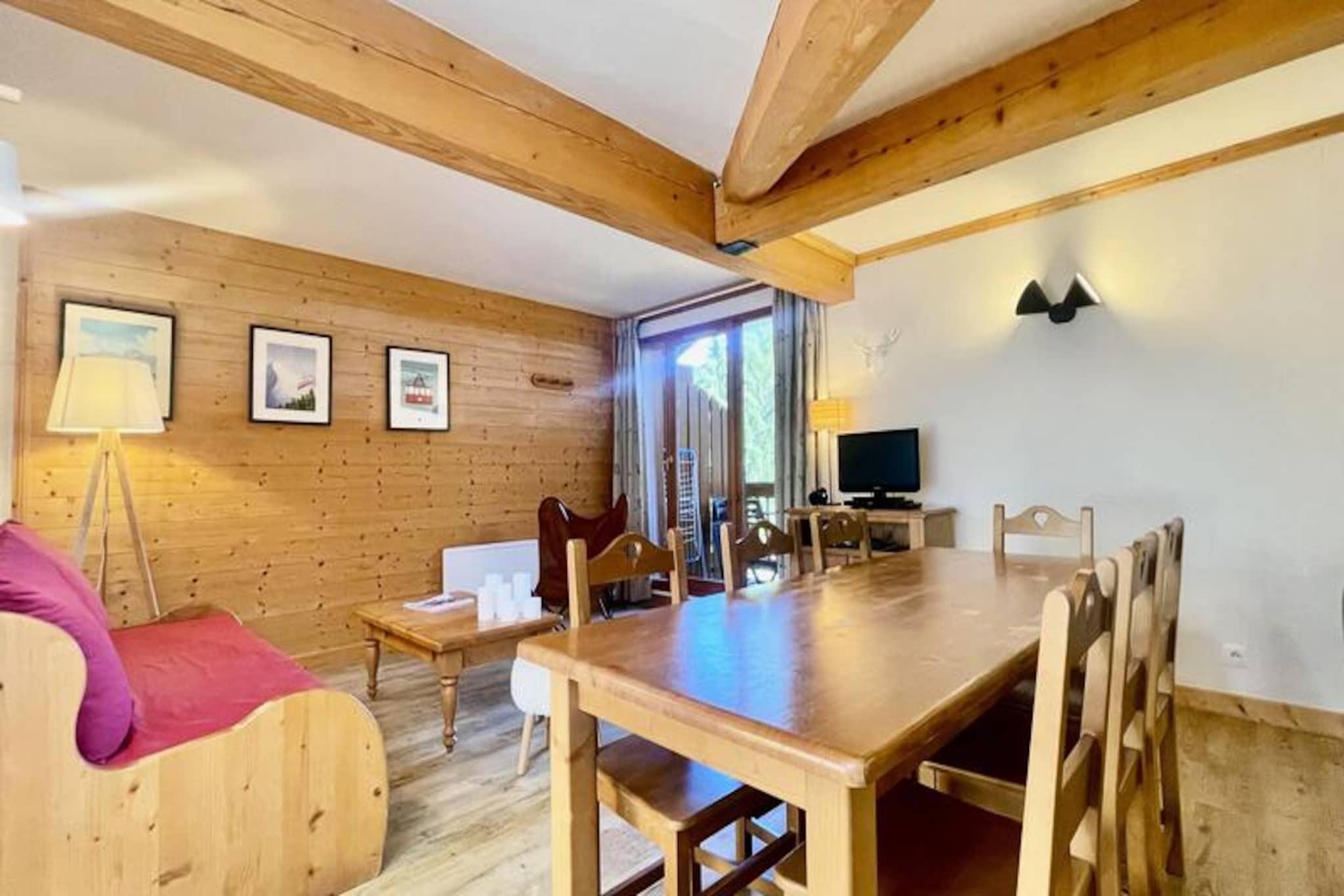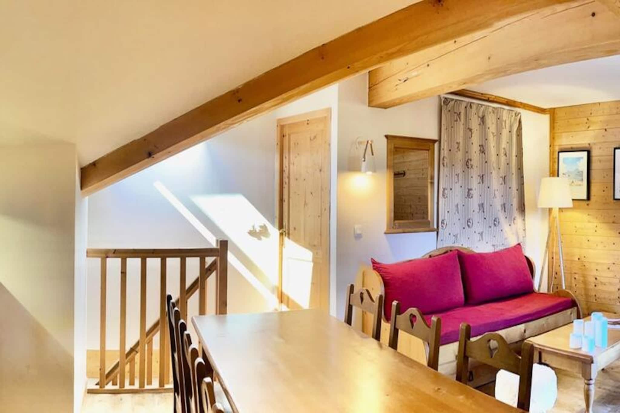 I hjertet af den maleriske landsby Notre Dame de Bellecombe tilbyder denne charmerende duplexlejlighed et roligt tilflugtssted omgivet af den majestætiske Aravis-bjergkæde. Perfekt beliggende i Les Belles Roches-residensen, kun få skridt fra lokale butikker, aktiviteter og det berømte skiområde Espace Diamant, der kan prale af 192 km sammenhængende pister på tværs af seks fortryllende resorts. Uanset om du er her for vintereventyr eller sommerferier, inviterer denne ejendom dig til at opleve den autentiske charme i de franske alper. \n\nLejligheden er designet til op til seks gæster og kombinerer moderne komfort med alpin elegance. På første sal finder du en indbydende entré, et soveværelse med eget badeværelse, dobbeltseng og gæstetoilet. Øverste etage har en hyggelig stue med fladskærms-tv og et åbent køkken udstyret med keramisk kogeplade, kombineret mikrobølgeovn, opvaskemaskine og køleskab. Yderligere sovepladser inkluderer et andet dobbeltværelse, en alkove med køjesenge og et andet badeværelse med separat toilet. Gæsterne kan også drage fordel af et skiskab, privat overdækket parkering og gratis WiFi. For ekstra afslapning kan du nyde gratis adgang til den indendørs swimmingpool, hvor en sauna kan fås som ekstraudstyr. \n\nUd over boligen tilbyder landsbyen aktiviteter året rundt. Om vinteren vil skientusiaster sætte pris på nærheden til pisterne og skiskolen, mens sommergæster kan udforske naturskønne vandrestier, mountainbikeruter og det nærliggende fritidscenter ved Flumet-søen, kun 4 km væk. Mont Rond-stoleliften, der er åben to gange om ugen, tilbyder en betagende panoramaudsigt over Mont Blanc. Familier vil elske de nærliggende tennisbaner og legepladsen, der ligger kun 200 meter væk. \n\nUanset om du søger alpine spændinger eller rolige øjeblikke, er denne lejlighed den perfekte base for at skabe uforglemmelige minder i hjertet af de franske alper. Med sin blanding af komfort, bekvemmelighed og fantastiske omgivelser lover den en ferieoplevelse som ingen anden.