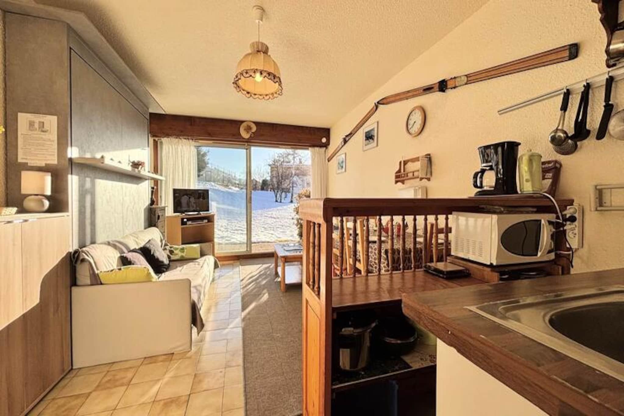 Midt i de betagende landskaber i de franske alper tilbyder denne charmerende studiolejlighed et hyggeligt tilflugtssted til din næste bjergferie. Ejendommen ligger i stueetagen og er perfekt placeret for skientusiaster, med pister som Teret, Quarts og Reguet kun få skridt væk. Uanset om du er her for at grave dig gennem frisk puddersne eller nyde den pulserende alpine atmosfære, placerer denne indkvartering dig i hjertet af det hele. Om sommeren forvandles de frodige omgivelser til et paradis for udendørsaktiviteter med tennisbaner og en forfriskende udendørs pool, der er udelukkende tilgængelig for gæster. \n\nDet 25 m² store studio er omhyggeligt designet til at maksimere komfort og funktionalitet. En alkove i entréen har to køjesenge, mens det åbne køkken og opholdsstue har en dobbeltseng, der kan foldes ned, hvilket skaber et alsidigt rum til op til fire gæster. Badeværelset er udstyret med et separat toilet for ekstra bekvemmelighed. Gæsterne kan også nyde den praktiske anvendelighed af et skiskab og adgang til en rummelig parkeringsplads lige ved foden af ??bygningen. For dem, der søger yderligere faciliteter, er en privat lukket garage tilgængelig til ugentlig leje i boligen. \n\nBeliggende kun 50 meter fra ESF skiskole og skiliftbilletkontorer, og 100 meter fra bymidten og butikkerne, er alt hvad du behøver inden for rækkevidde. Om sommeren kan du udforske de naturskønne stier, nyde lokal mad eller blot slappe af ved poolen. De nærliggende attraktioner og faciliteter sikrer et mindeværdigt ophold, uanset om du besøger stedet i de sneklædte vintermåneder eller den solrige sommersæson. \n\nMed sin førsteklasses beliggenhed, gennemtænkte faciliteter og den majestætiske alpine kulisse er dette studie et ideelt valg for par, familier eller små grupper, der søger både eventyr og afslapning i hjertet af de franske alper.