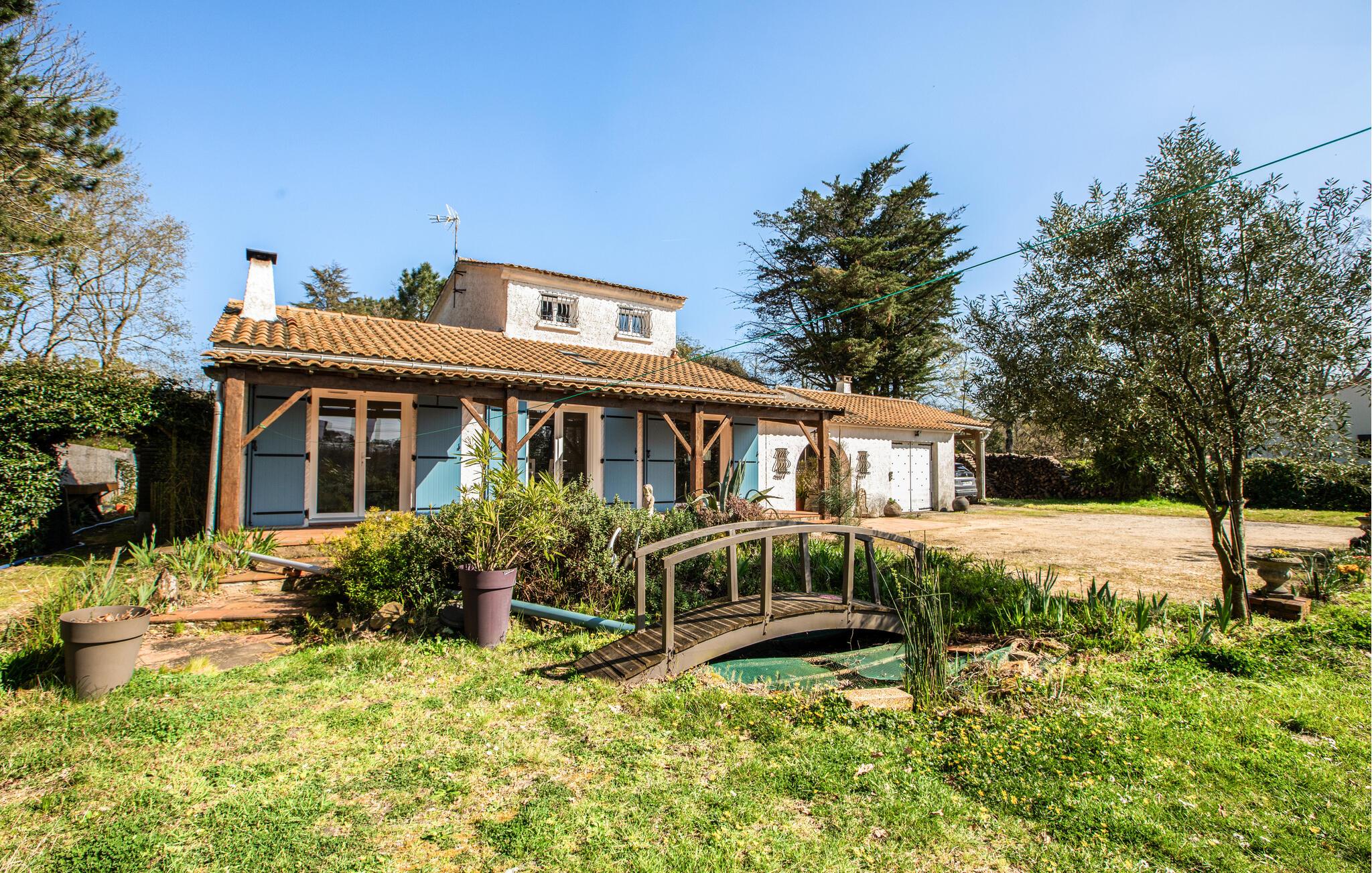 Gå ud på den overdækkede terrasse med markise og nyd dagens måltider i skyggen. Det rummelige udendørsområde med have, frodige planter og en lille bro over en dam skaber en behagelig feriestemning.