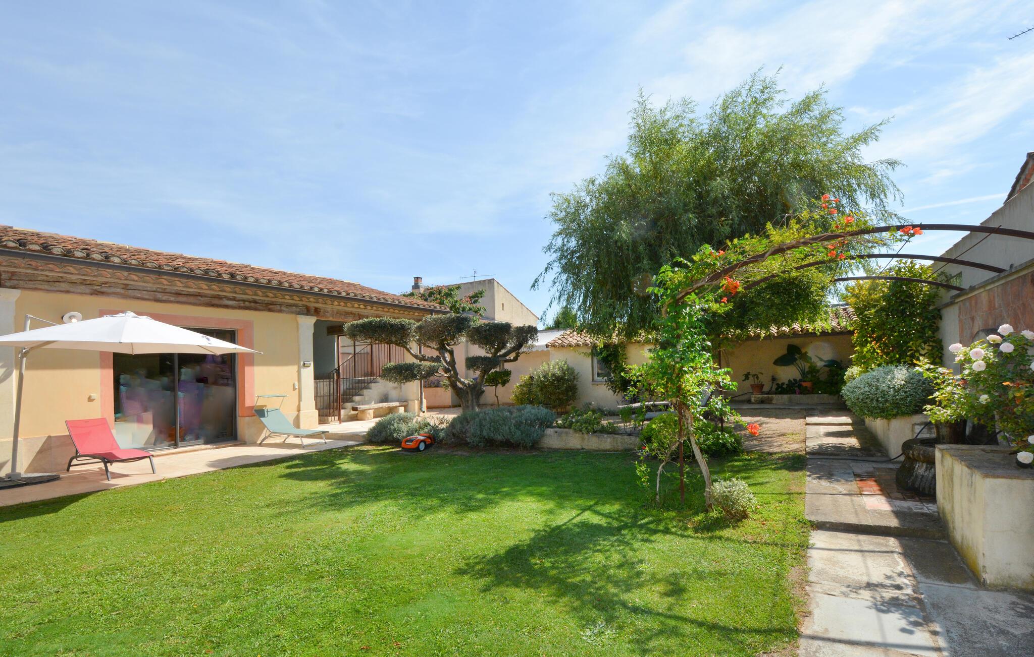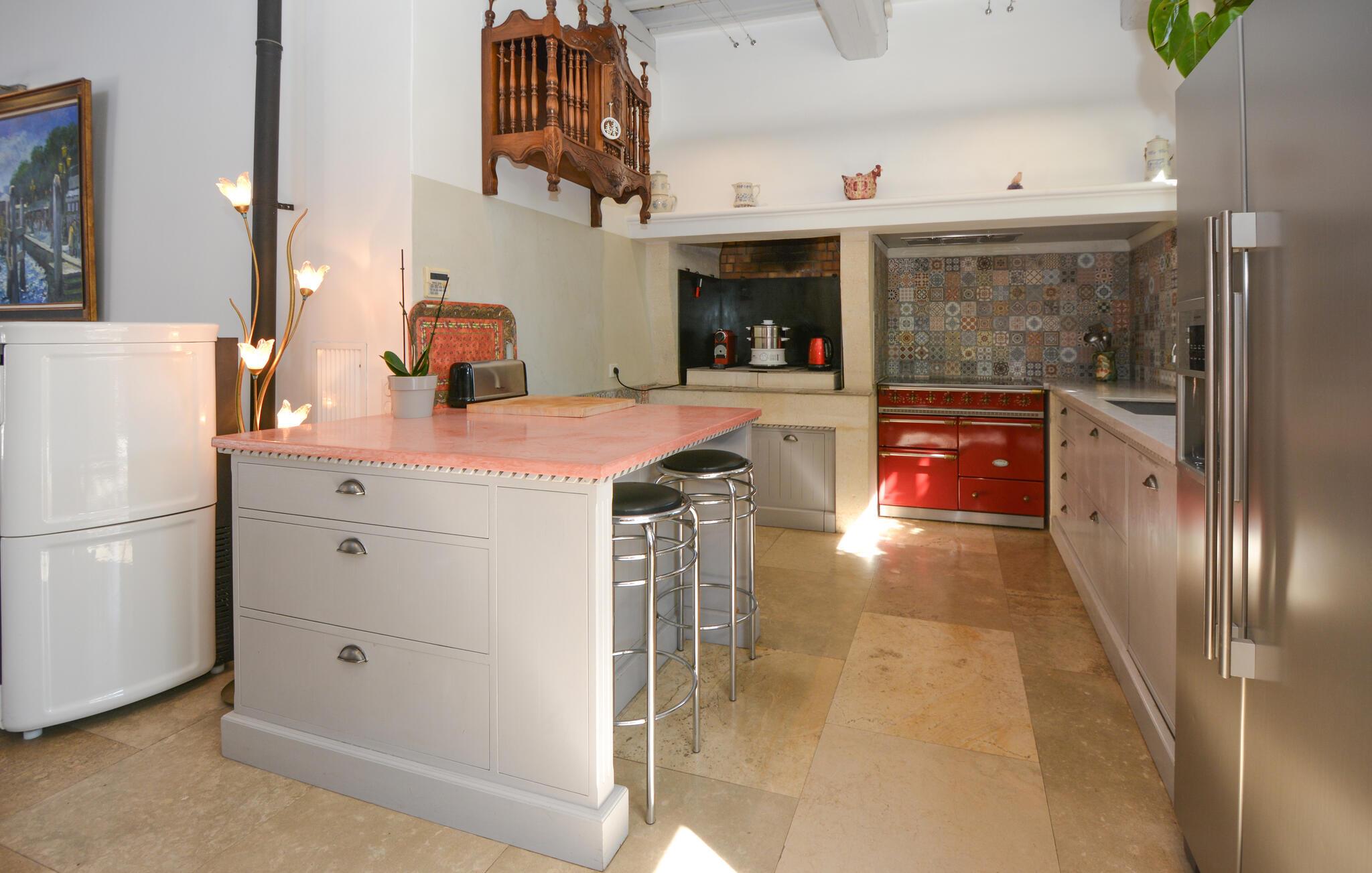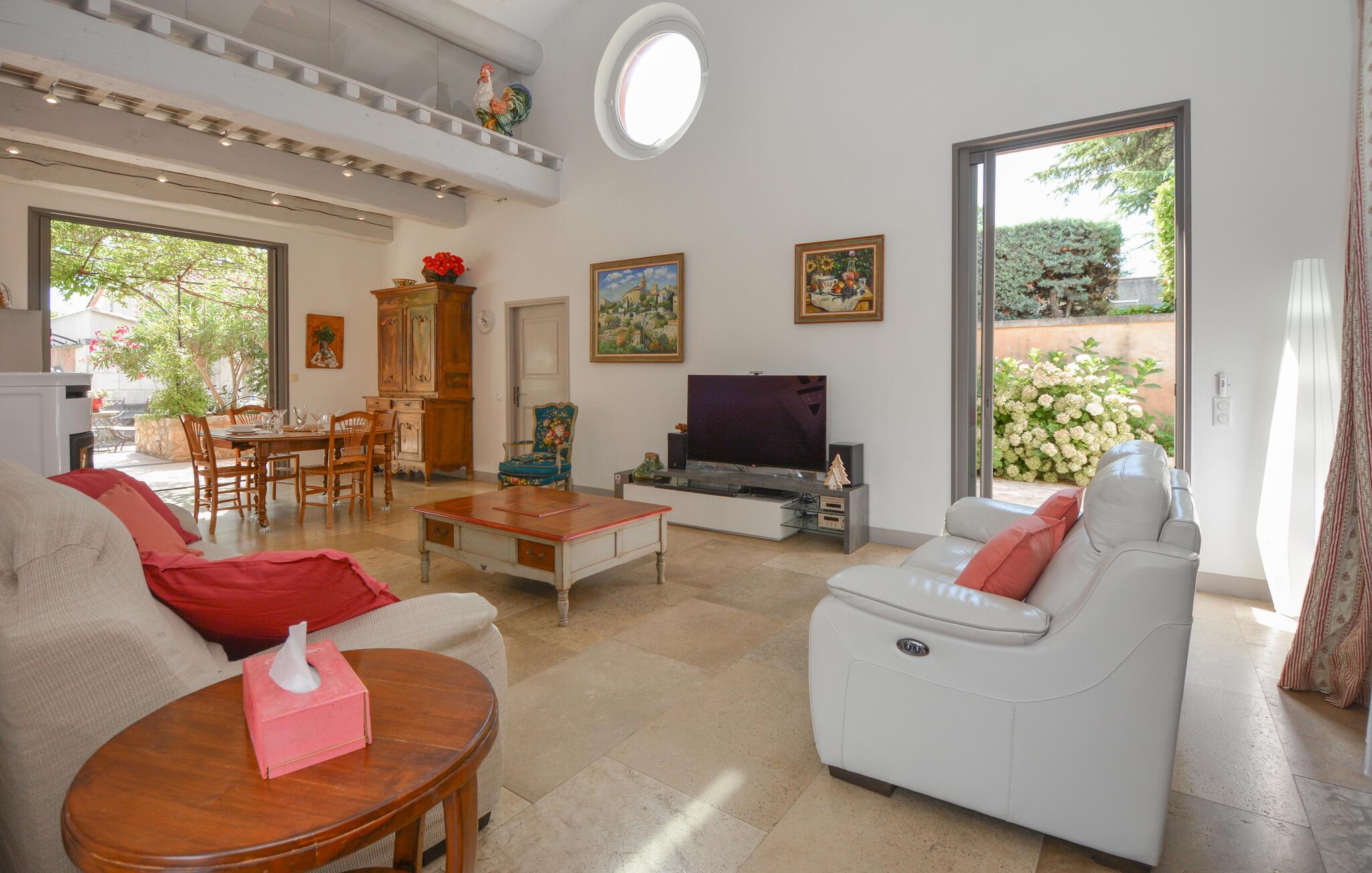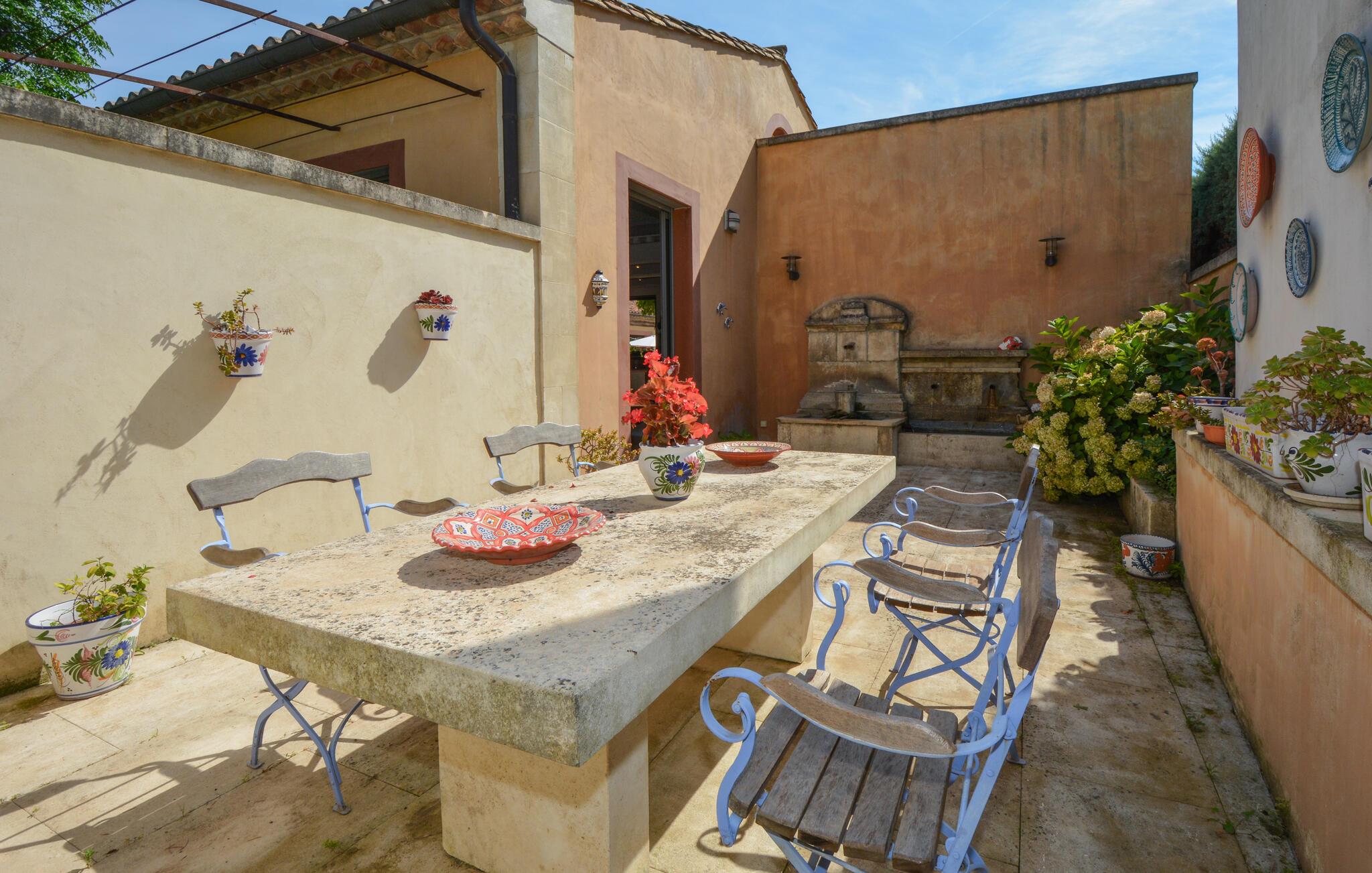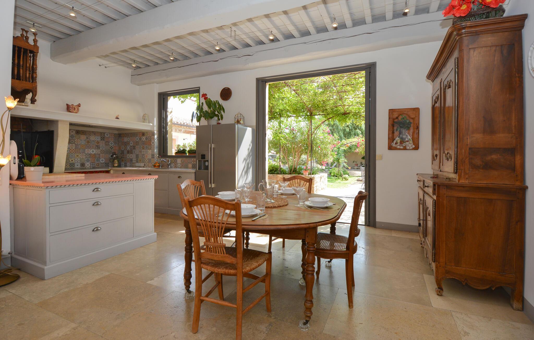 Velkommen til dette indbydende og hyggelige feriehus i Noves, hvor ædle materialer som sten, træ og jern skaber en unik atmosfære. Huset byder på store, lyse rum og giver med sin rummelighed den perfekte ramme for at nyde ferielivet i de smukt indrettede omgivelser. Læn jer tilbage på sofaerne eller tilbered lækre måltider i det store køkken.