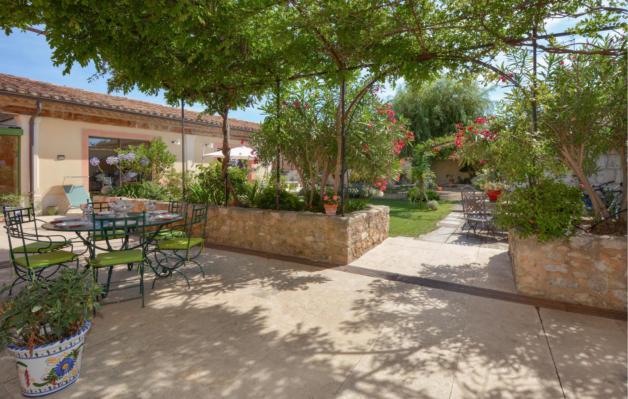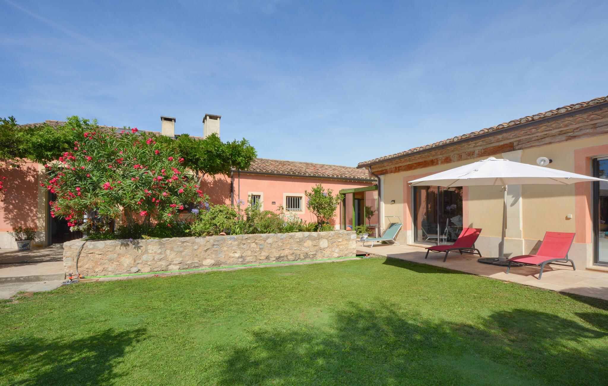 Slap af i dette store og komfortable feriehus med en rummelig udendørs gårdhave, terrasser og patio.
