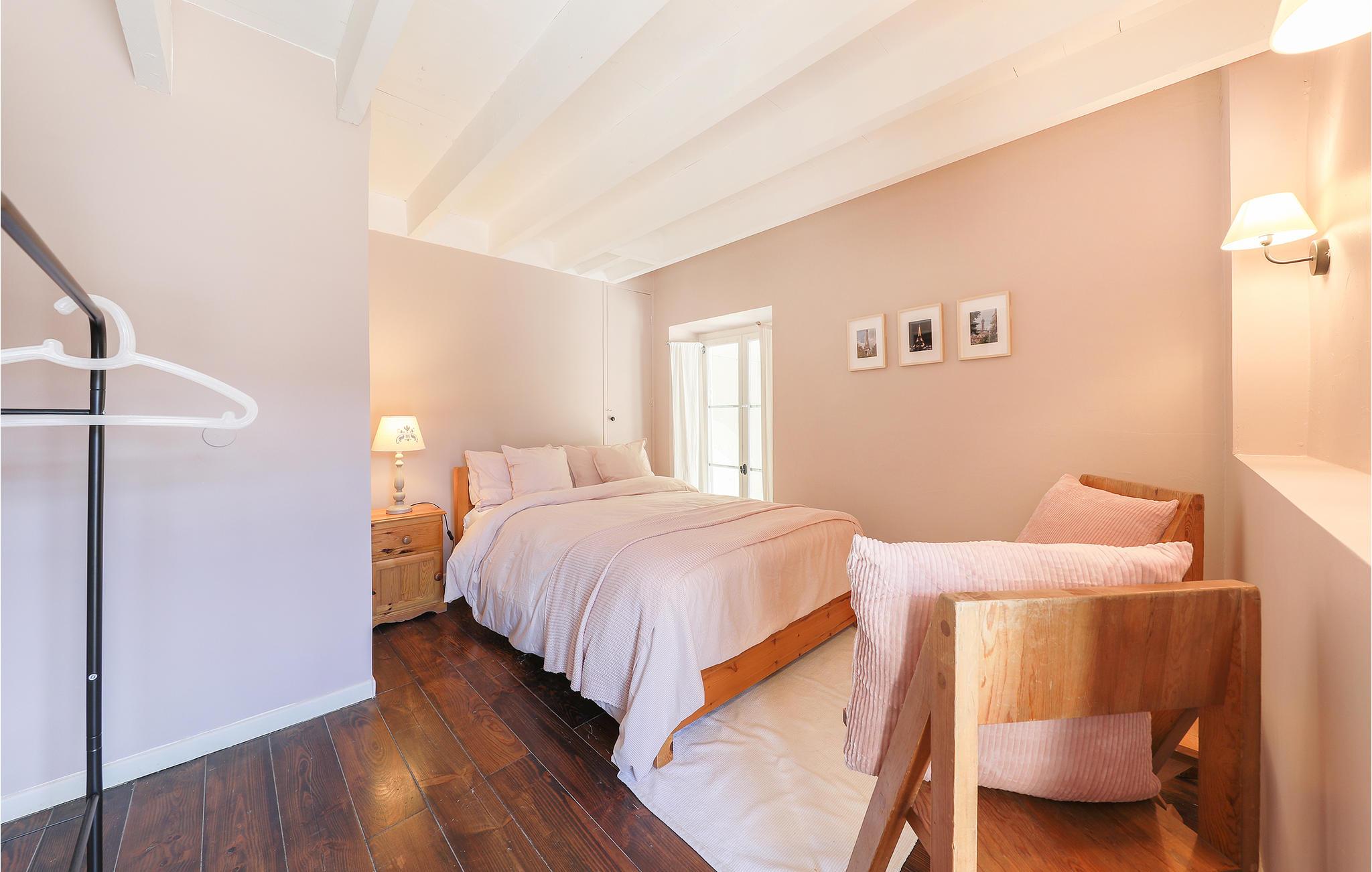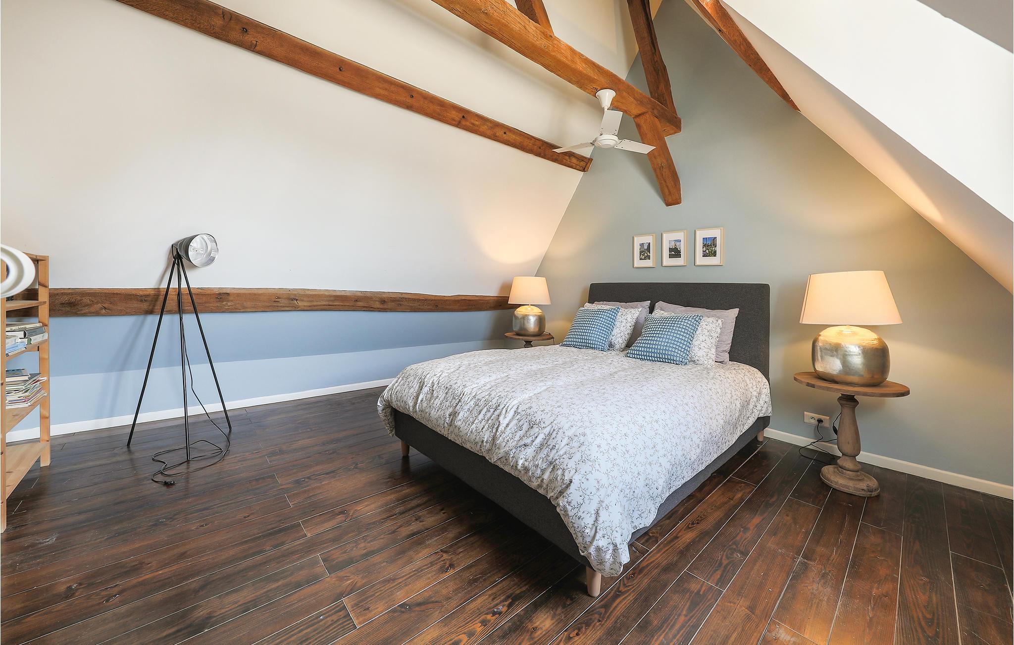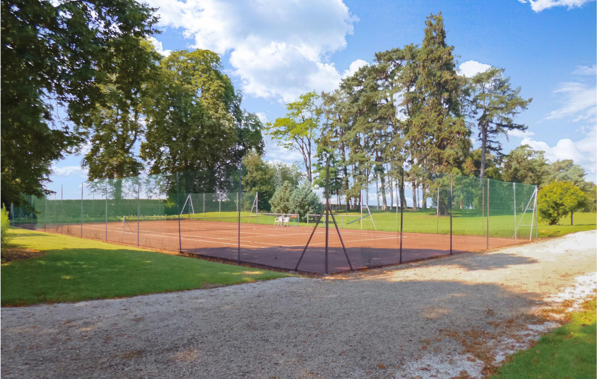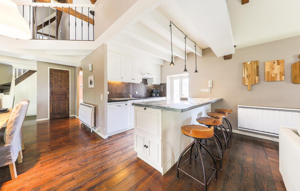 Daglig- og spisestuen, hvis mørke parketgulv danner en dejlig kontrast til de lyse vægge, er et behageligt sted at slappe af, og loftet, der er åbent op til kip, samt pejsen understreger den hyggelige stemning i rummet. Lejligheden med frilagte bjælker er moderne og komfortabelt indrettet og i to plan. Køkkenet ligger i praktisk åben forbindelse med stuen. Pool og tennisbane deler I med andre gæster på den næsten 20.000 m² store ejendom.