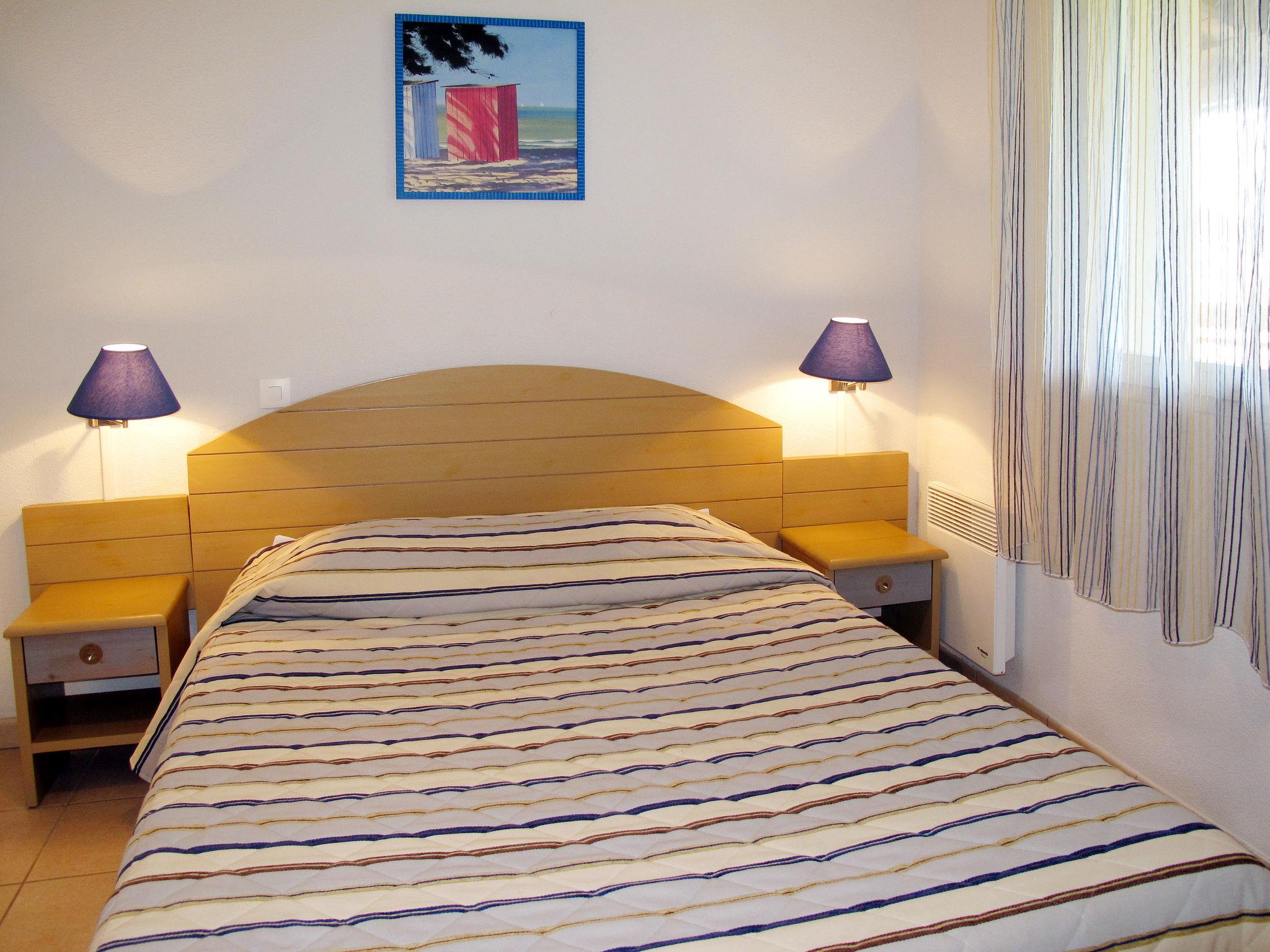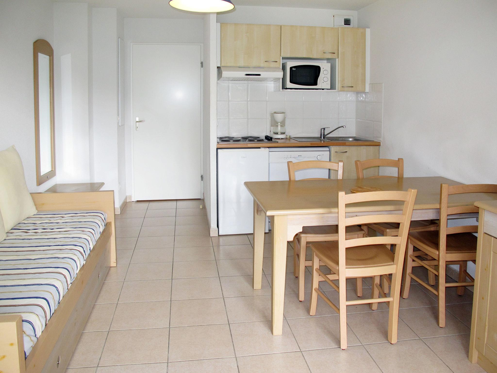 "L'Allée des Dunes", 2-room apartment 30 m2. Bright, practical furnishings: living/sleeping room with 1 bed and 1 pull-out bed (2 x 80 cm), dining table and TV. Exit to the balcony. 1 room with 1 french bed. Kitchenette (4 hot plates, dishwasher, toaster, microwave, electric coffee machine). Bathroom, sep. WC. Electric heating. Balcony or terrace. Terrace furniture, balcony furniture. Facilities: Internet (WiFi). Please note: non-smokers only. Maximum 1 pet/ dog allowed. Smoke alarm.