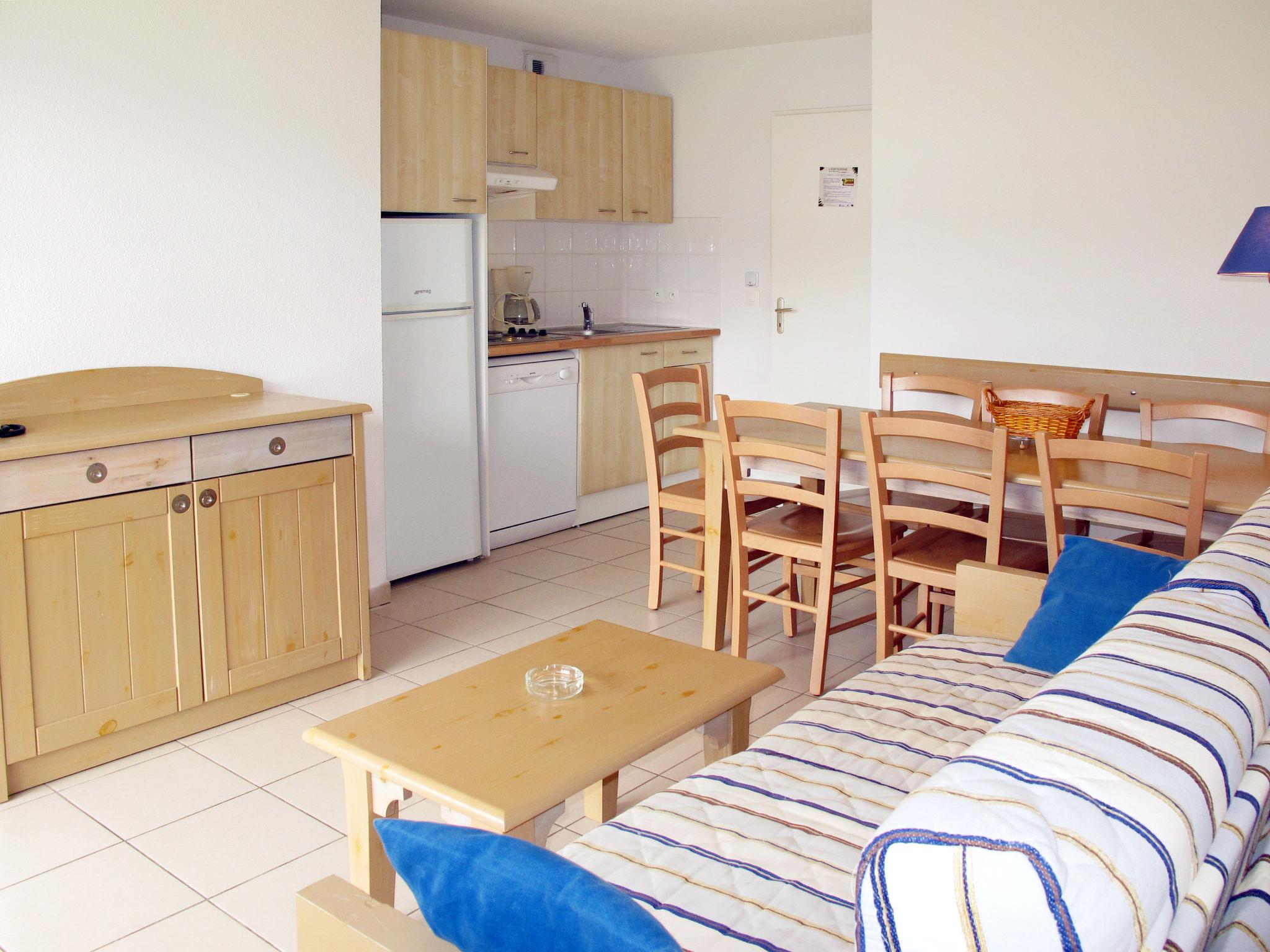 "L'Allée des Dunes", 4-room apartment 45 m2. Bright, practical furnishings: living/sleeping room with 1 sofabed (80 cm), dining table and TV. Exit to the balcony. 1 room with 1 french bed and shower. 1 room with 2 beds (80 cm). 1 small room with 1 x 2 bunk beds (80 cm). Kitchenette (4 hot plates, dishwasher, toaster, microwave, freezer, electric coffee machine). Bathroom, sep. WC. Electric heating. Balcony or terrace. Terrace furniture, balcony furniture. Facilities: Internet (WiFi). Please note: non-smokers only. Maximum 1 pet/ dog allowed. Smoke alarm.
