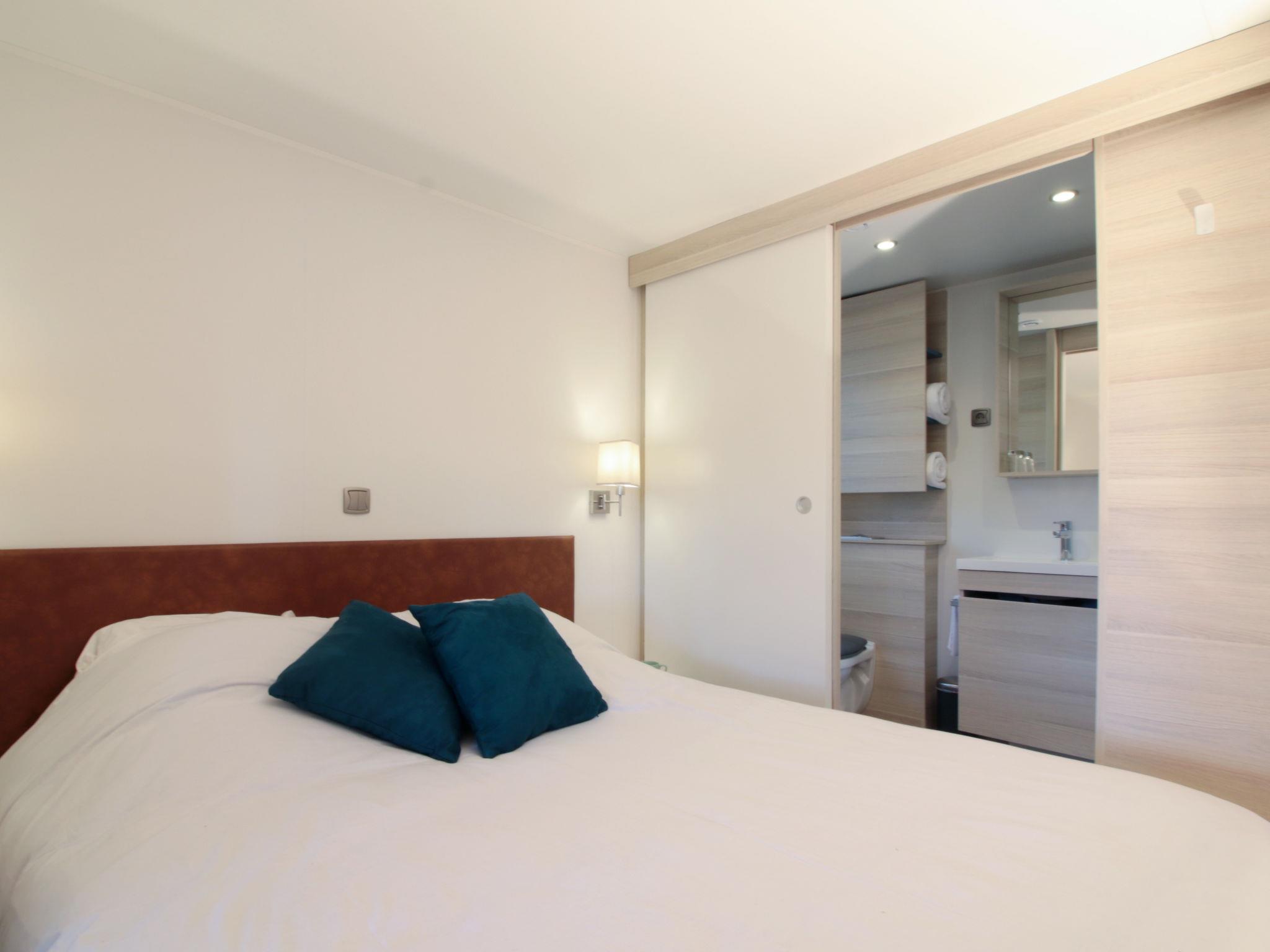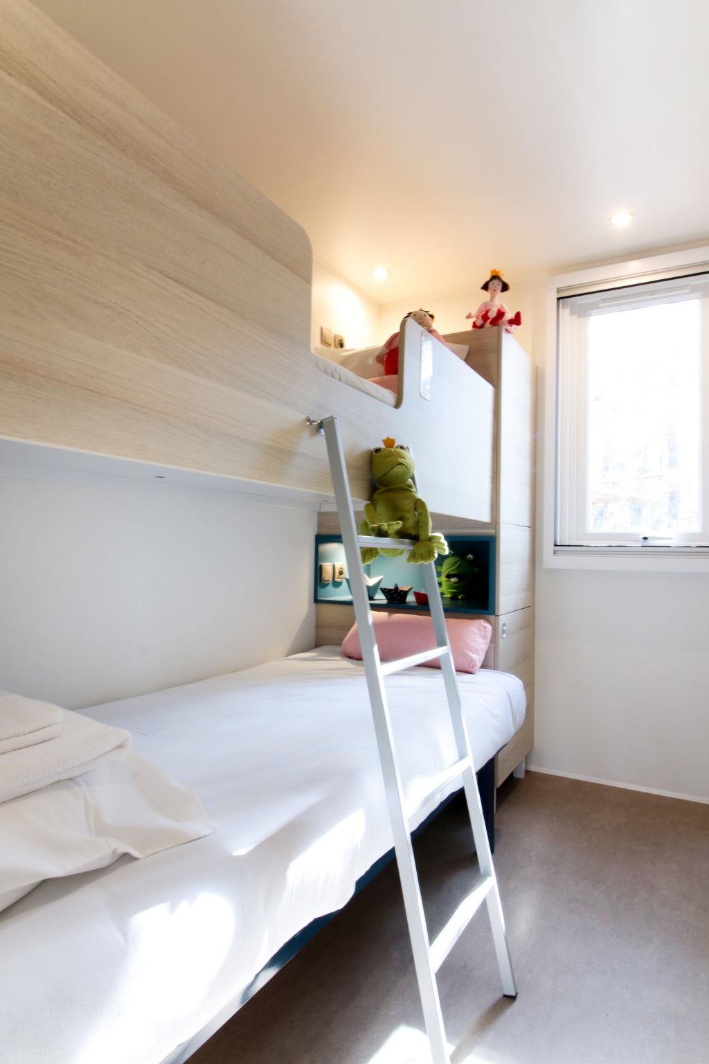 "Premium Key West", 4-room bungalow 42 m2. Object suitable for 4 adults + 2 children. Bright, beautiful and cosy furnishings: living/dining room with dining table and TV (flat screen). Exit to the terrace. 1 room with 1 french bed (160 cm, length 200 cm), shower/WC. Exit to the terrace. 1 room with 2 beds (80 cm, length 190 cm). 1 children's room with 1 x 2 bunk beds (80 cm, length 190 cm). Small, open kitchen (dishwasher, 4 ceramic glass hob hotplates, toaster, kettle, microwave, freezer, electric coffee machine) with bar. Shower, sep. WC. Electric heating, air-conditioning. Terrace 18 m2 partly roofed. Terrace furniture, electric barbecue, deck chairs (2). Facilities: children's high chair, baby cot (extra). Internet (WiFi, free). Please note: suitable for families. Non-smokers only. Maximum 1 pet/ dog allowed. Smoke alarm.