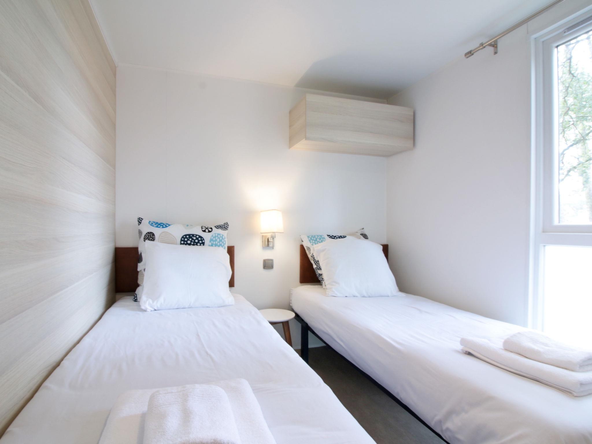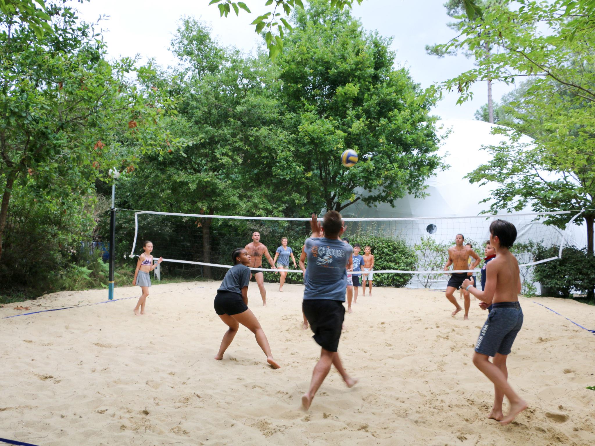 Beautiful resort "Ecolodge Green Resort", surrounded by trees. 32 houses in the resort. 2.5 km from the centre of Ondres, 13 km from the centre of Bayonne, 20 km from the centre of Biarritz, 1.4 km from the sea, in a cul-de-sac. For shared use: property 4 ha (fenced) with trees, natural garden, swimming pool heated, fenced (25 x 10 m, depth 140 cm, seasonal availability: 01.Jan. - 31.Dec.) with salt-electrolysis pool-cleaning system. WC in the pool area, outdoor shower, boccia, beach volleyball, children's playground. In the complex: reception, WiFi, washing machine, tumble dryer (for shared use, extra), bicycle rental. Bread roll service. Parking (limited number of spaces) at the house at 200 m. Supermarket 2.5 km, bus stop "Saint Robert (23)" 900 m, sandy beach 1.4 km. Golf course (18 hole) 15 km, riding stable 300 m. Please note: car-free holiday complex. Entertainment in the season. Loading and unloading of baggage is possible at the holiday house. Residence with electric gates. The photograph shows a typical example. The holiday properties may differ in situation, size and location.