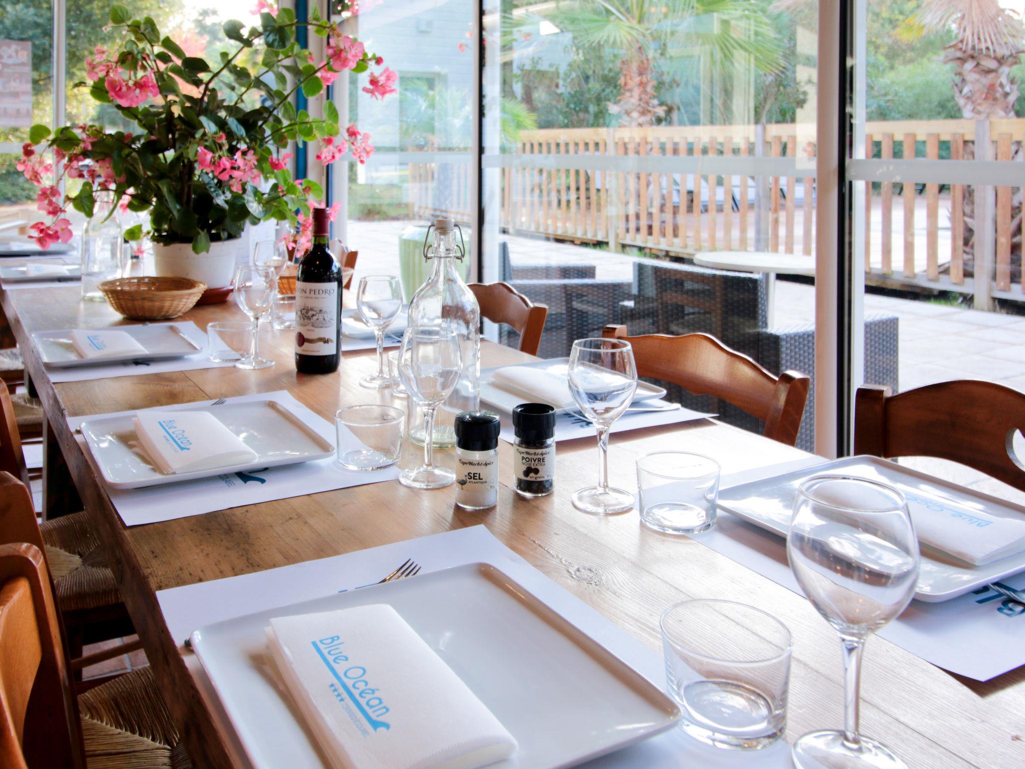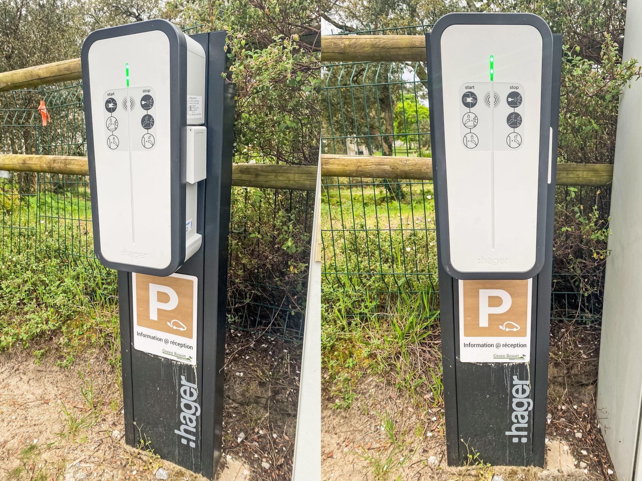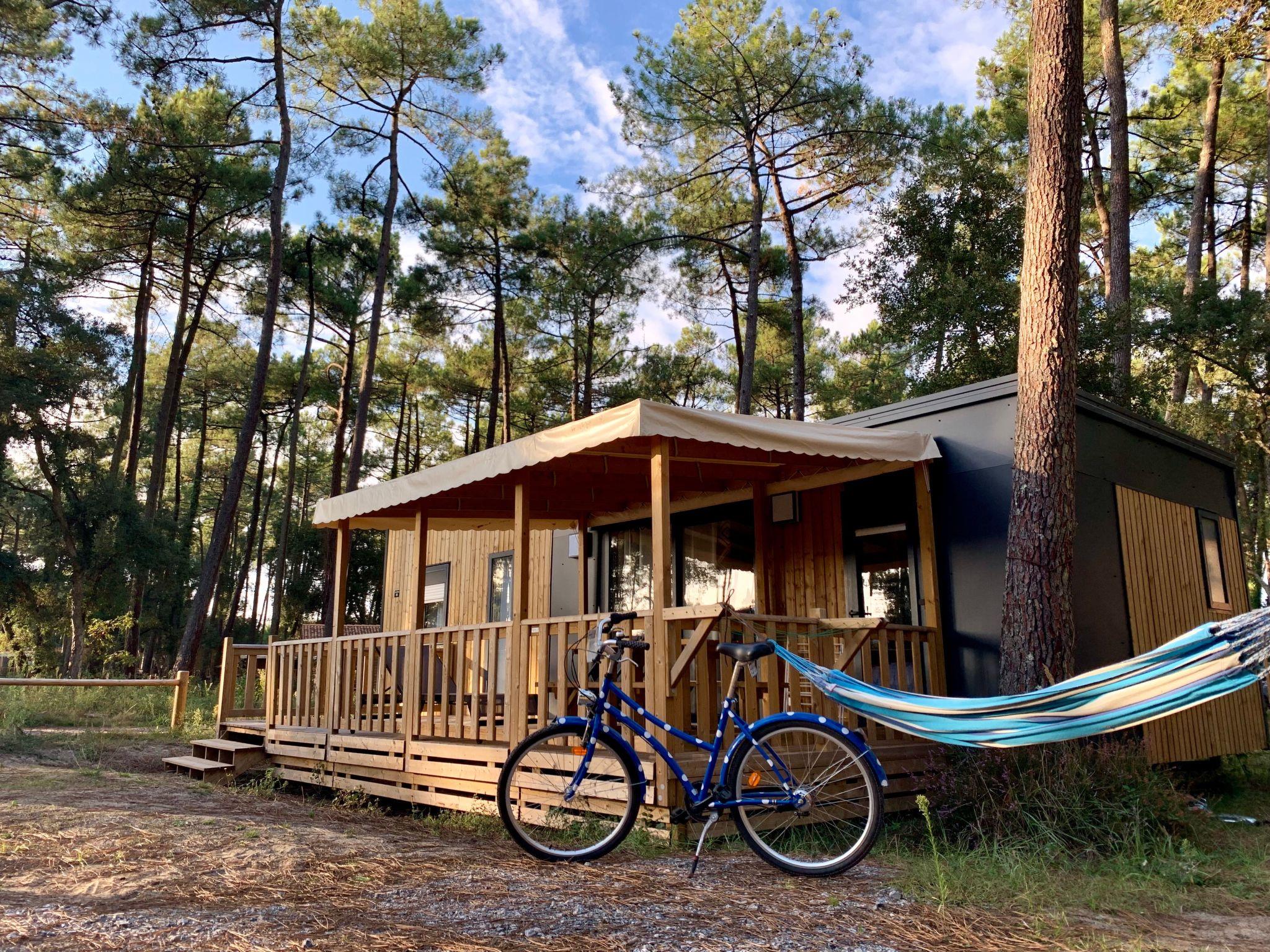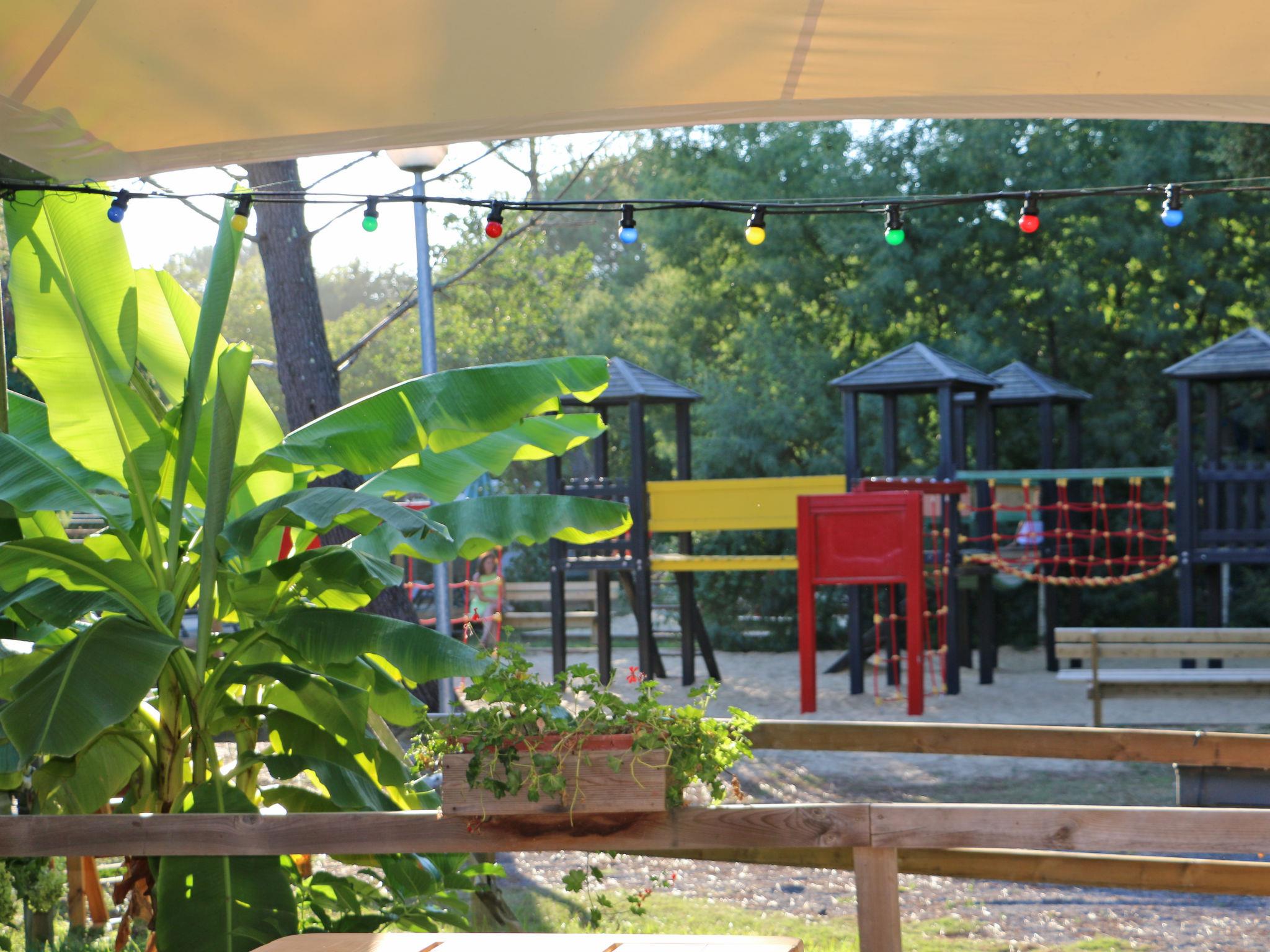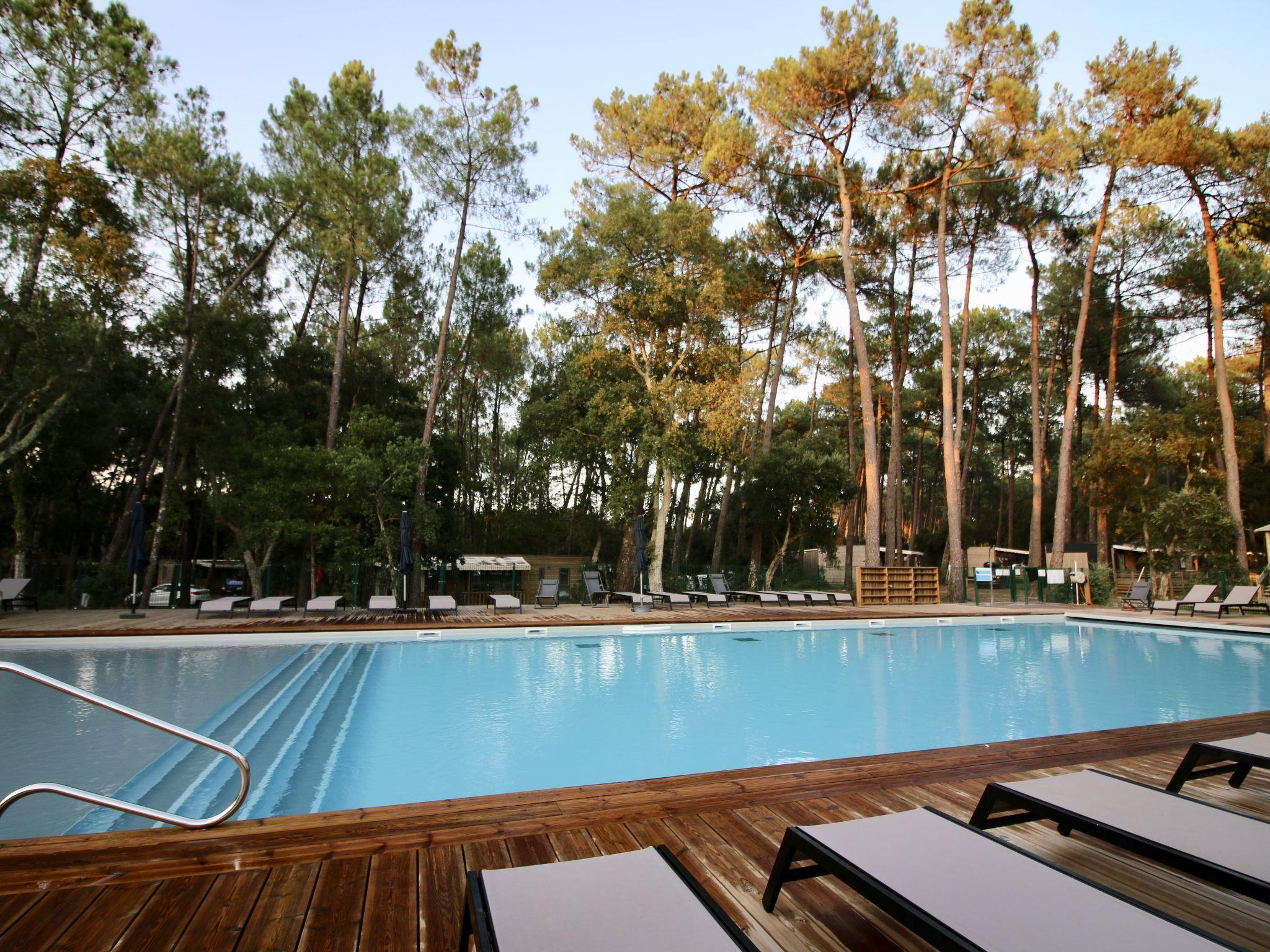 Beautiful resort "Ecolodge Green Resort", surrounded by trees. 32 houses in the resort. 2.5 km from the centre of Ondres, 13 km from the centre of Bayonne, 20 km from the centre of Biarritz, 1.4 km from the sea, in a cul-de-sac. For shared use: property 4 ha (fenced) with trees, natural garden, swimming pool heated, fenced (25 x 10 m, depth 140 cm, seasonal availability: 01.Jan. - 31.Dec.) with salt-electrolysis pool-cleaning system. WC in the pool area, outdoor shower, boccia, beach volleyball, children's playground. In the complex: reception, WiFi, washing machine, tumble dryer (for shared use, extra), bicycle rental. Bread roll service. Parking (limited number of spaces) at the house at 200 m. Supermarket 2.5 km, bus stop "Saint Robert (23)" 900 m, sandy beach 1.4 km. Golf course (18 hole) 15 km, riding stable 300 m. Please note: car-free holiday complex. Entertainment in the season. Loading and unloading of baggage is possible at the holiday house. Residence with electric gates. The photograph shows a typical example. The holiday properties may differ in situation, size and location.