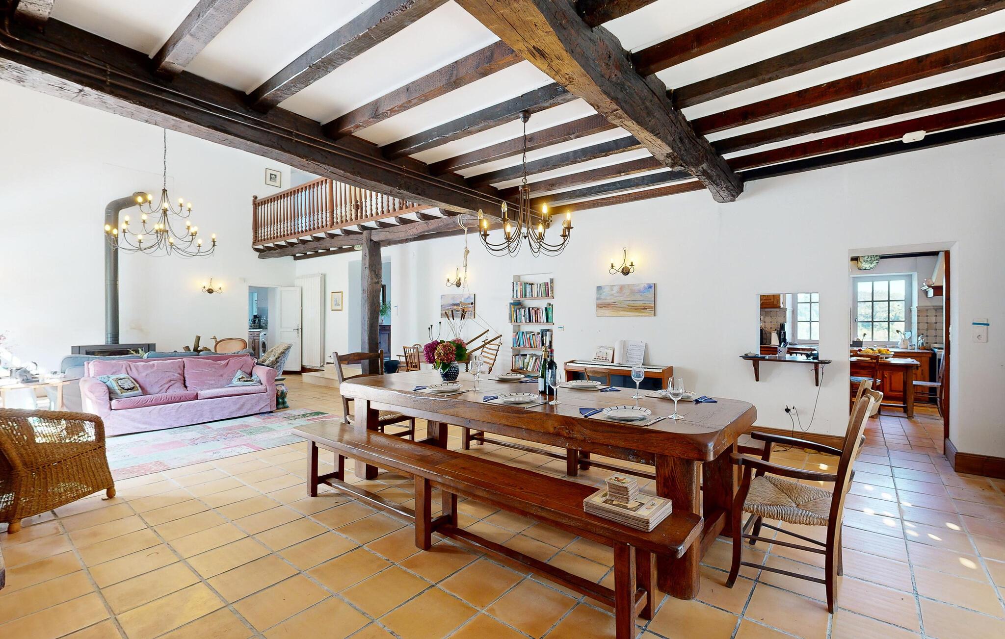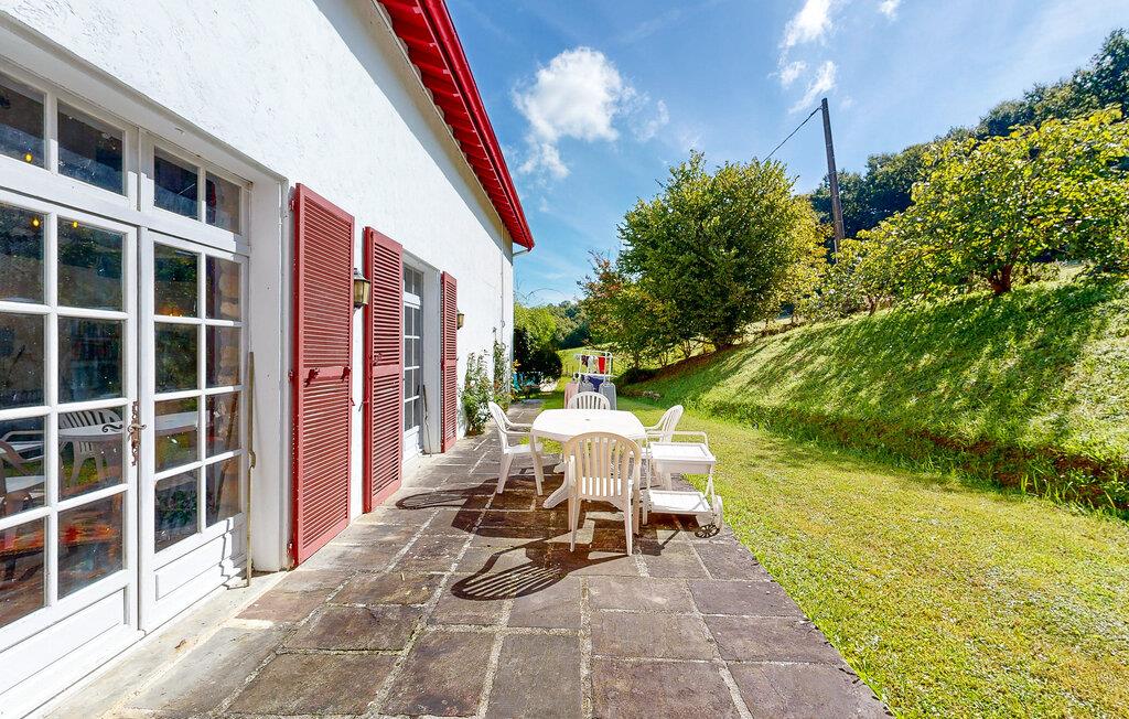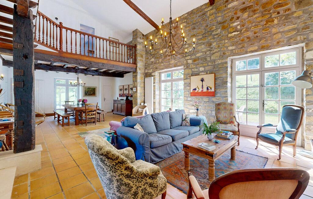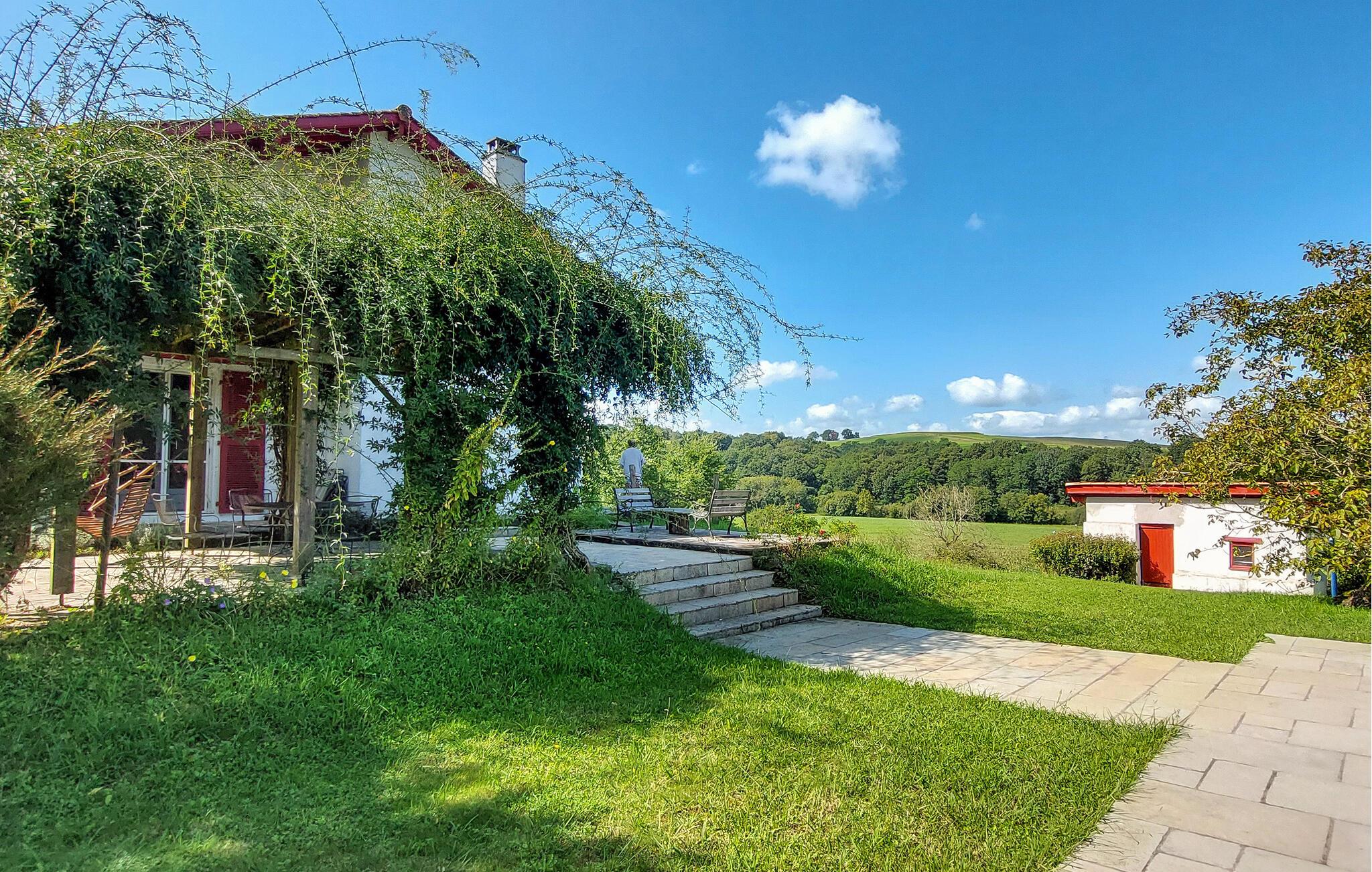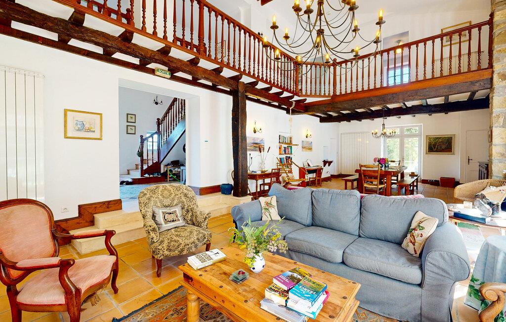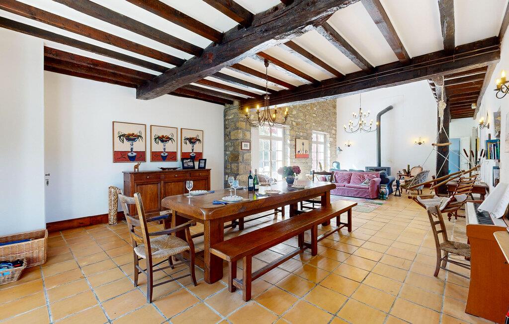Dette charmerende landhus i typisk baskisk stil forener rustik karakter, moderne komfort og fremragende fritidsmuligheder. Beliggende i rolige omgivelser, men alligevel kun en kort køretur fra kysten, er det et ideelt udgangspunkt for familier og grupper, der ønsker at kombinere afslapning og eventyr. Indenfor venter der jer rummelige opholdsrum med synlige bjælker, naturstensdetaljer og hyggelige pejse, som skaber en varm og indbydende atmosfære. Lav mad og spis sammen i det fuldt udstyrede landkøkken.