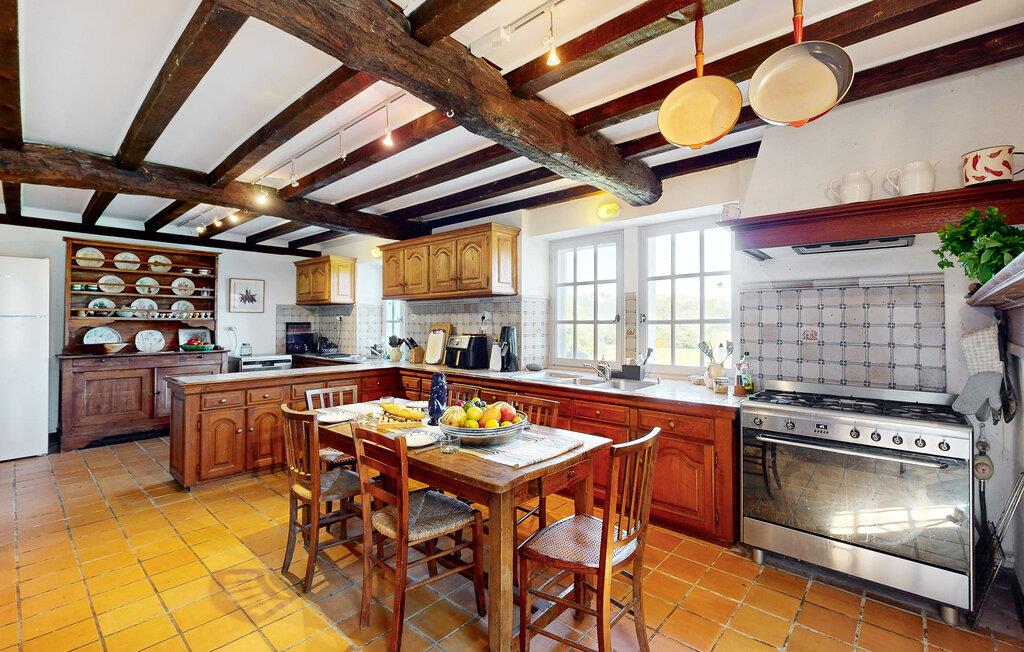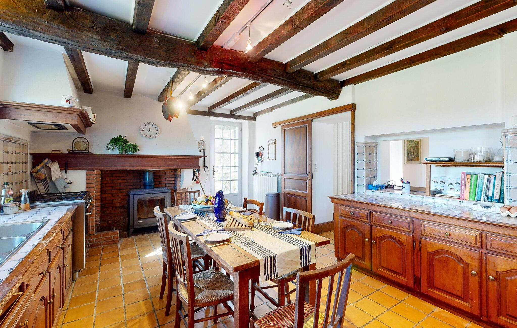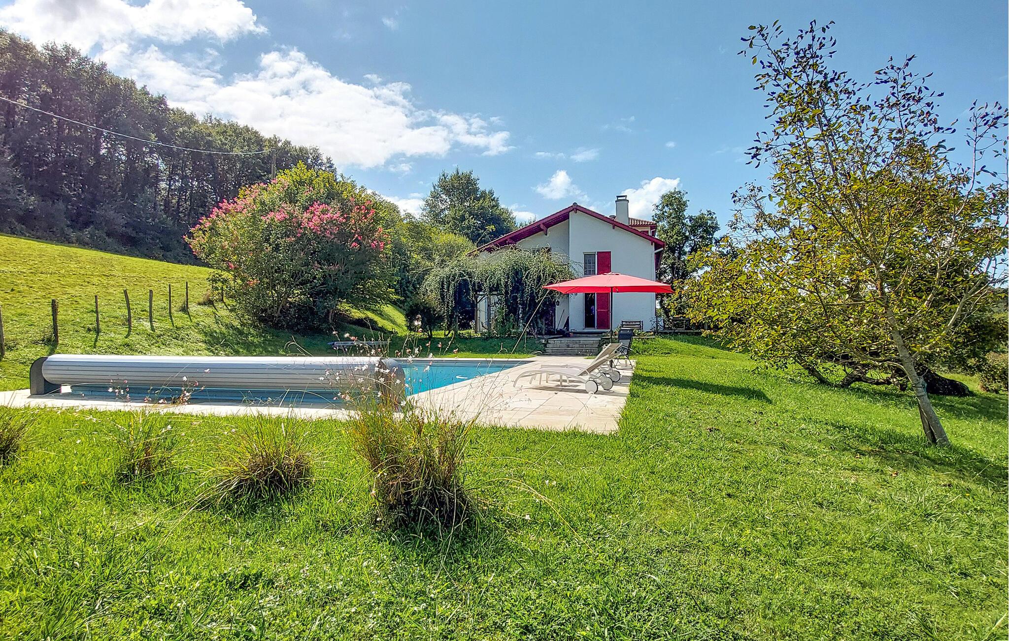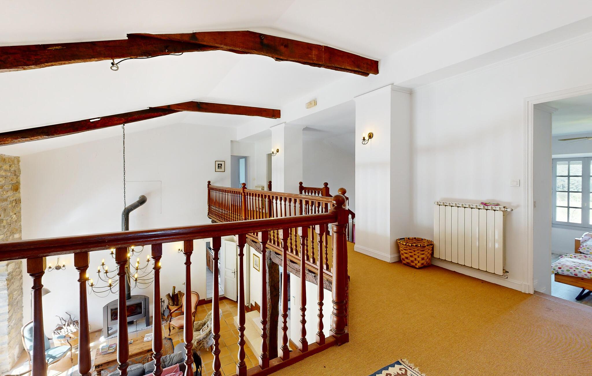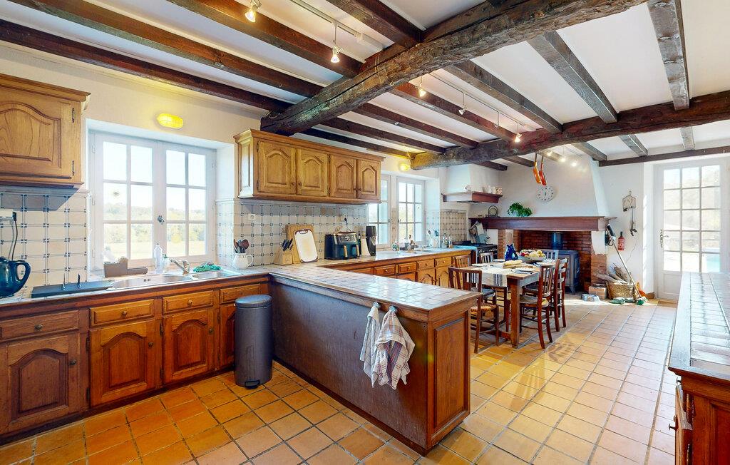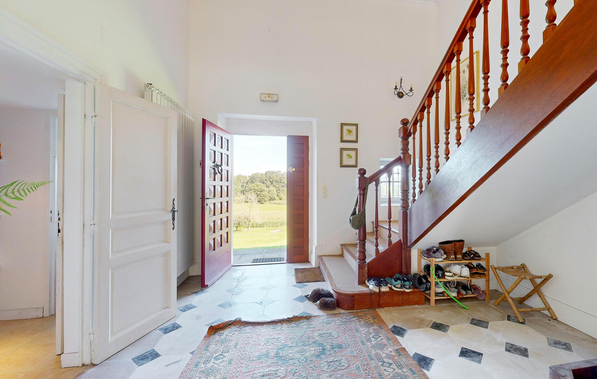 Dette charmerende landhus i typisk baskisk stil forener rustik karakter, moderne komfort og fremragende fritidsmuligheder. Beliggende i rolige omgivelser, men alligevel kun en kort køretur fra kysten, er det et ideelt udgangspunkt for familier og grupper, der ønsker at kombinere afslapning og eventyr. Indenfor venter der jer rummelige opholdsrum med synlige bjælker, naturstensdetaljer og hyggelige pejse, som skaber en varm og indbydende atmosfære. Lav mad og spis sammen i det fuldt udstyrede landkøkken.