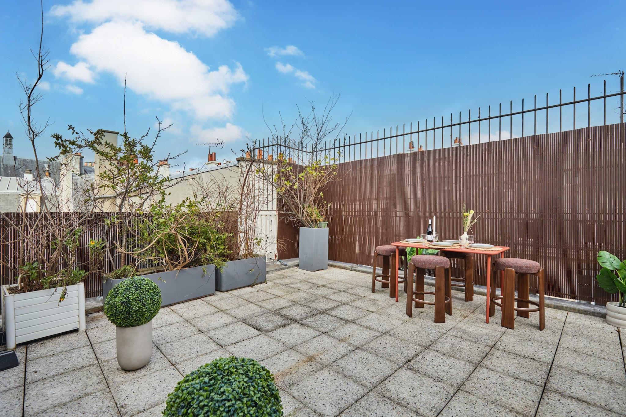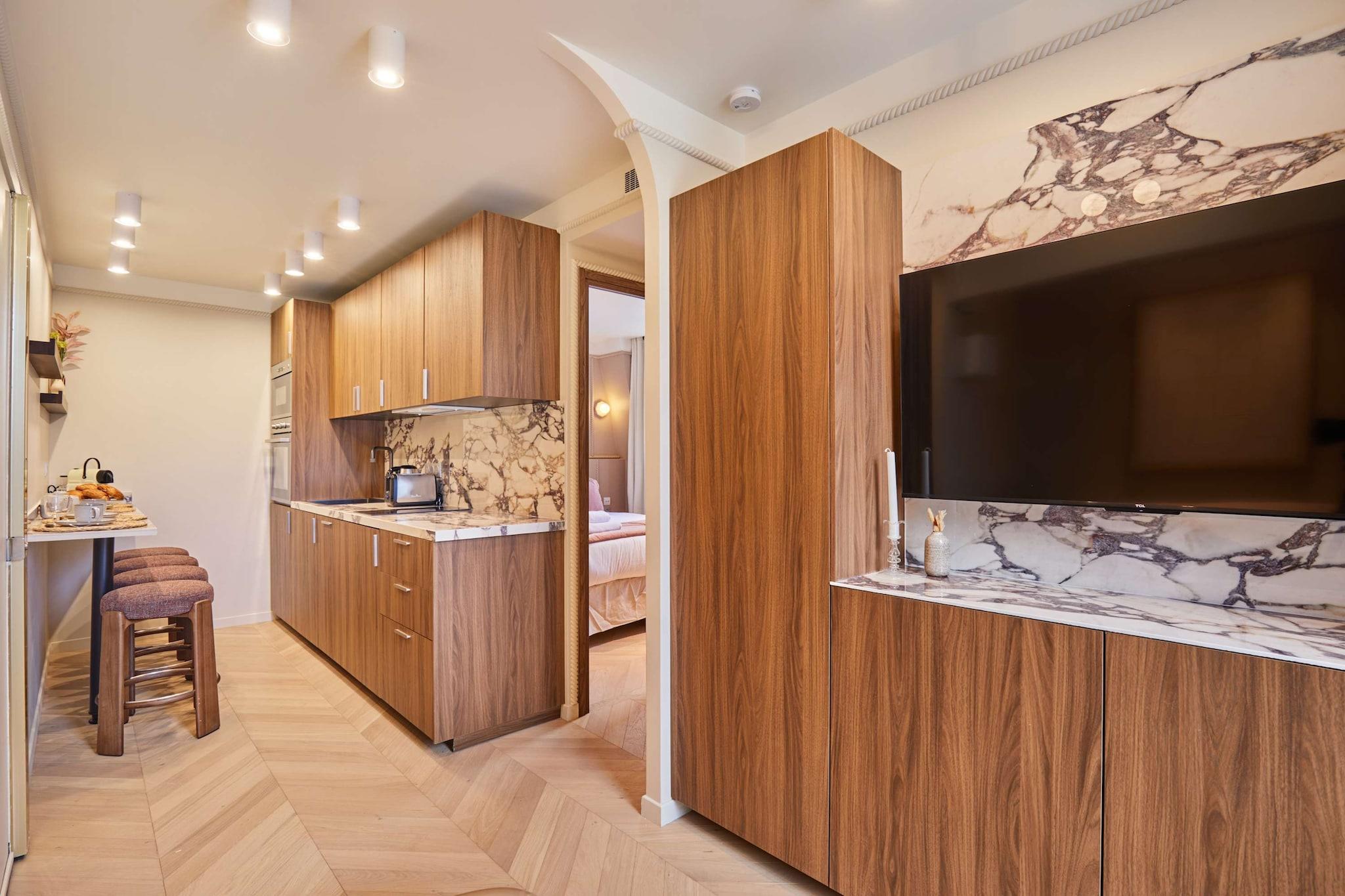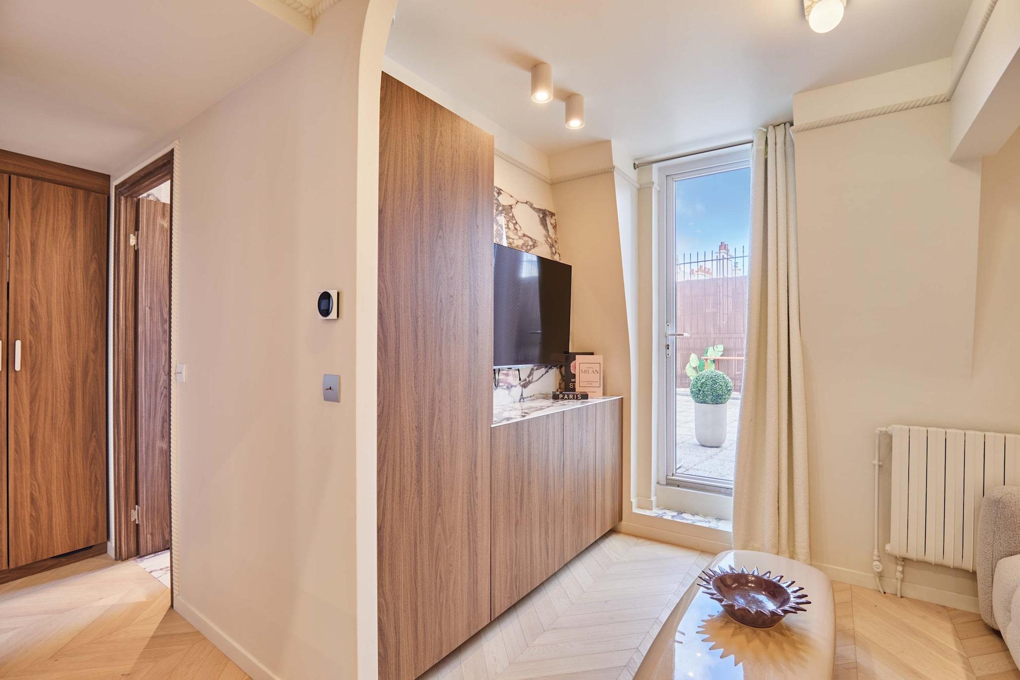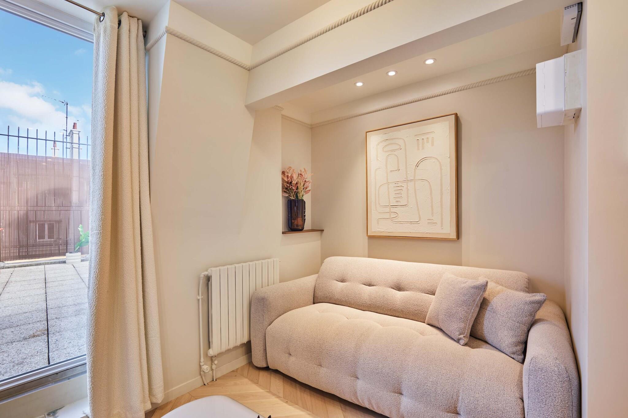 Oplev vores elegante lejlighed med terrasse, ideelt beliggende i hjertet af Marais. Den er designet som en ægte hotelsuite med separat soveværelse og stue og er blevet fuldstændig renoveret og har aircondition for at tilbyde komfort og moderne bekvemmeligheder. Dens moderne og raffinerede atmosfære indbyder til afslapning efter en dag med slentreture gennem historiske gader, besøg af museer, butikker og ikoniske caféer. En privilegeret ramme for et vellykket parisisk ophold, uanset om det er med familie eller venner.