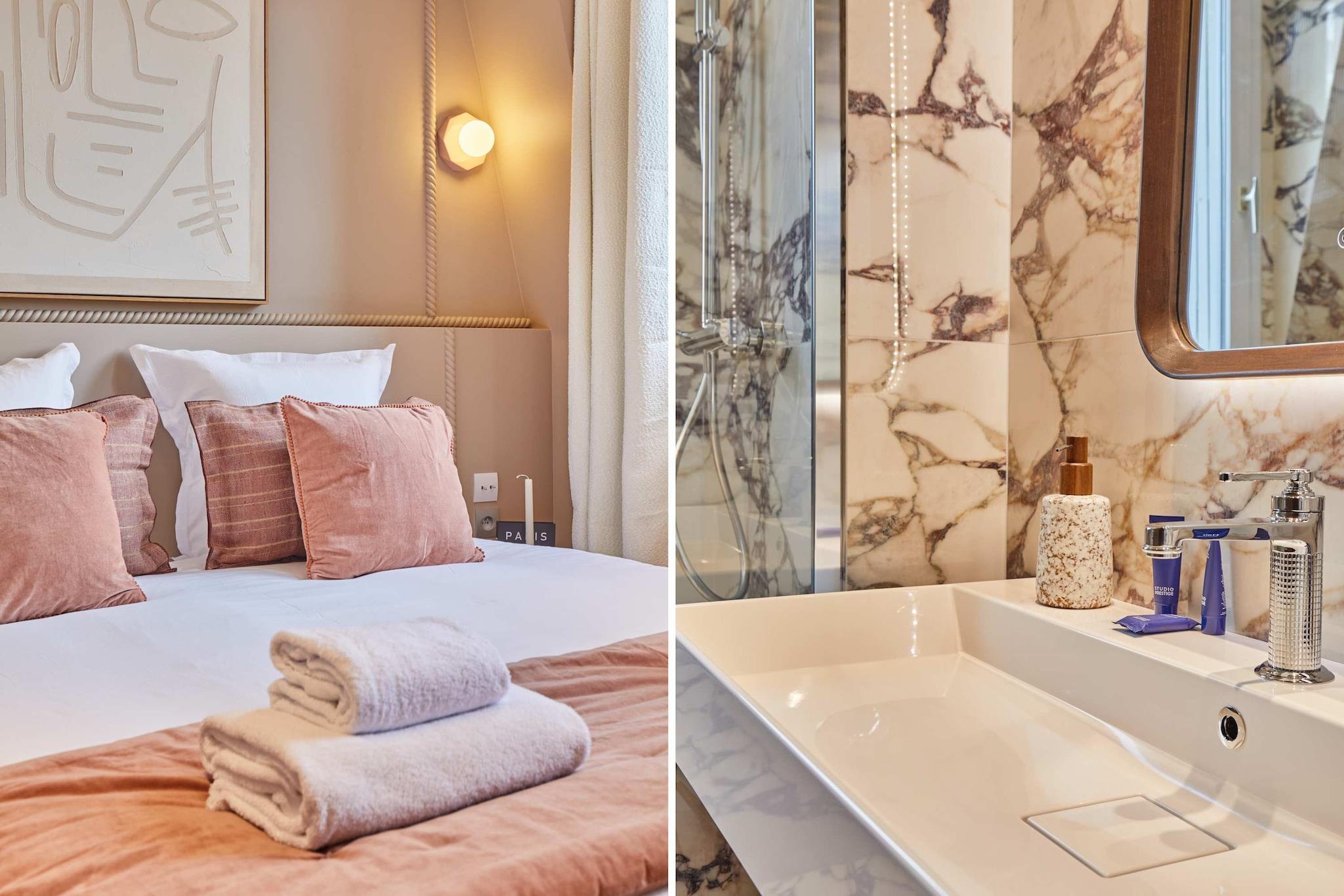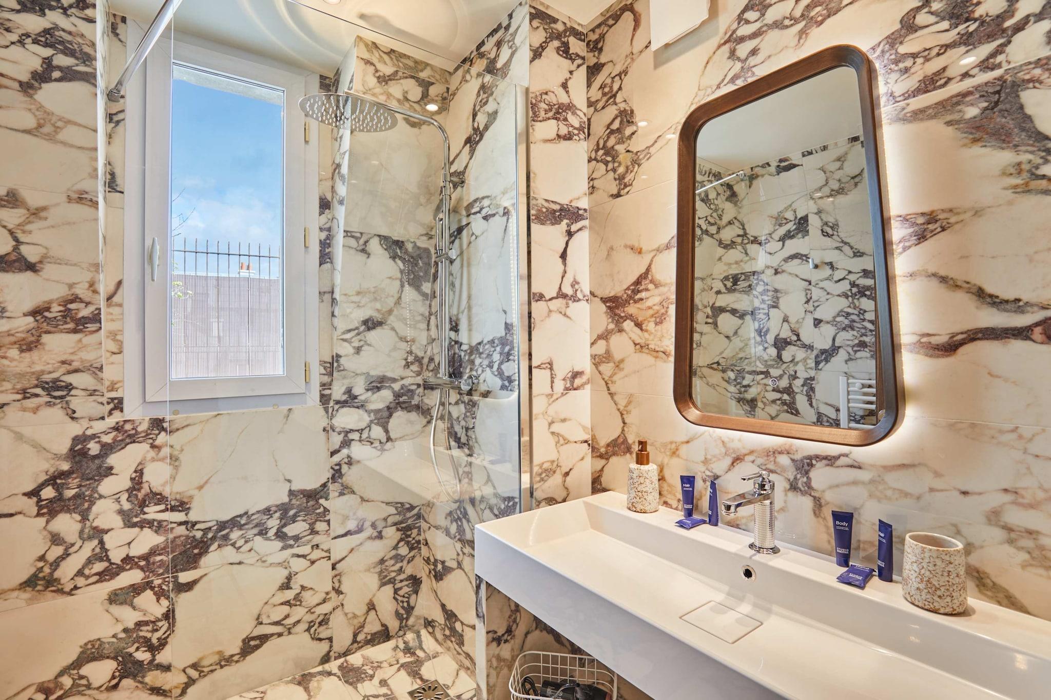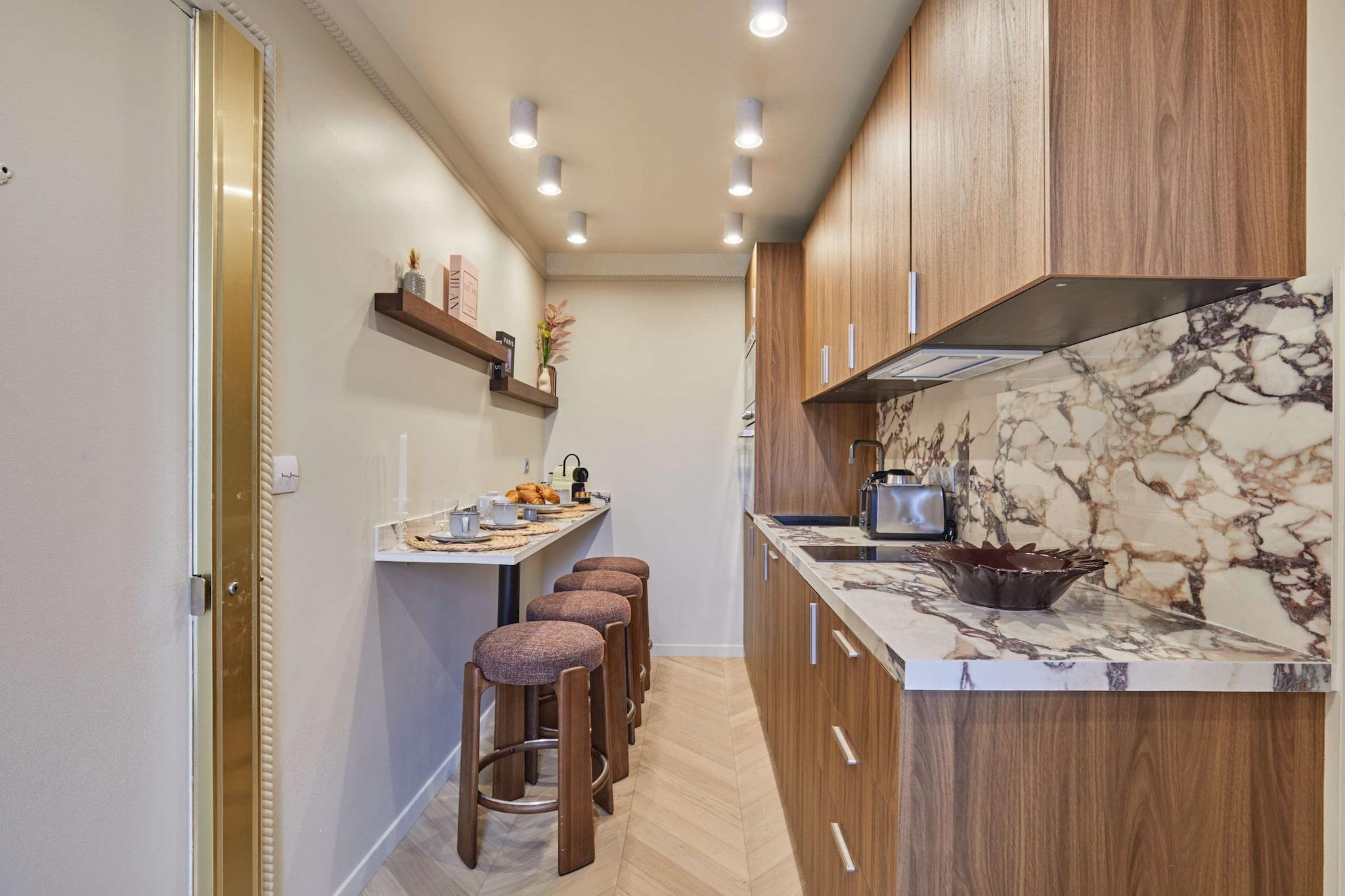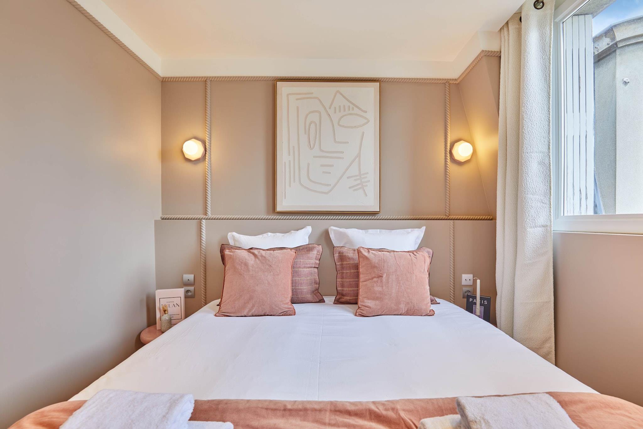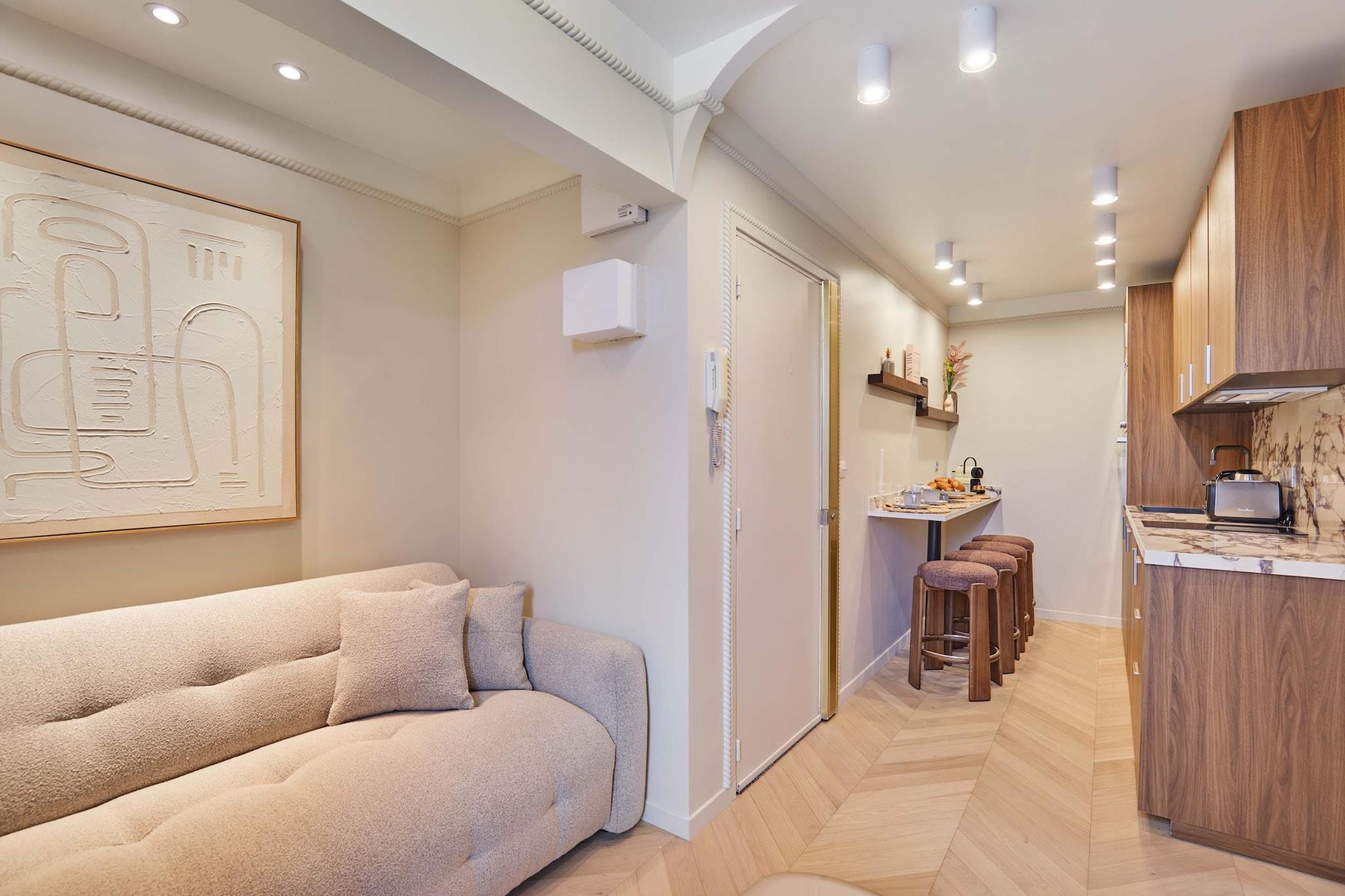 Oplev vores elegante lejlighed med terrasse, ideelt beliggende i hjertet af Marais. Den er designet som en ægte hotelsuite med separat soveværelse og stue og er blevet fuldstændig renoveret og har aircondition for at tilbyde komfort og moderne bekvemmeligheder. Dens moderne og raffinerede atmosfære indbyder til afslapning efter en dag med slentreture gennem historiske gader, besøg af museer, butikker og ikoniske caféer. En privilegeret ramme for et vellykket parisisk ophold, uanset om det er med familie eller venner.